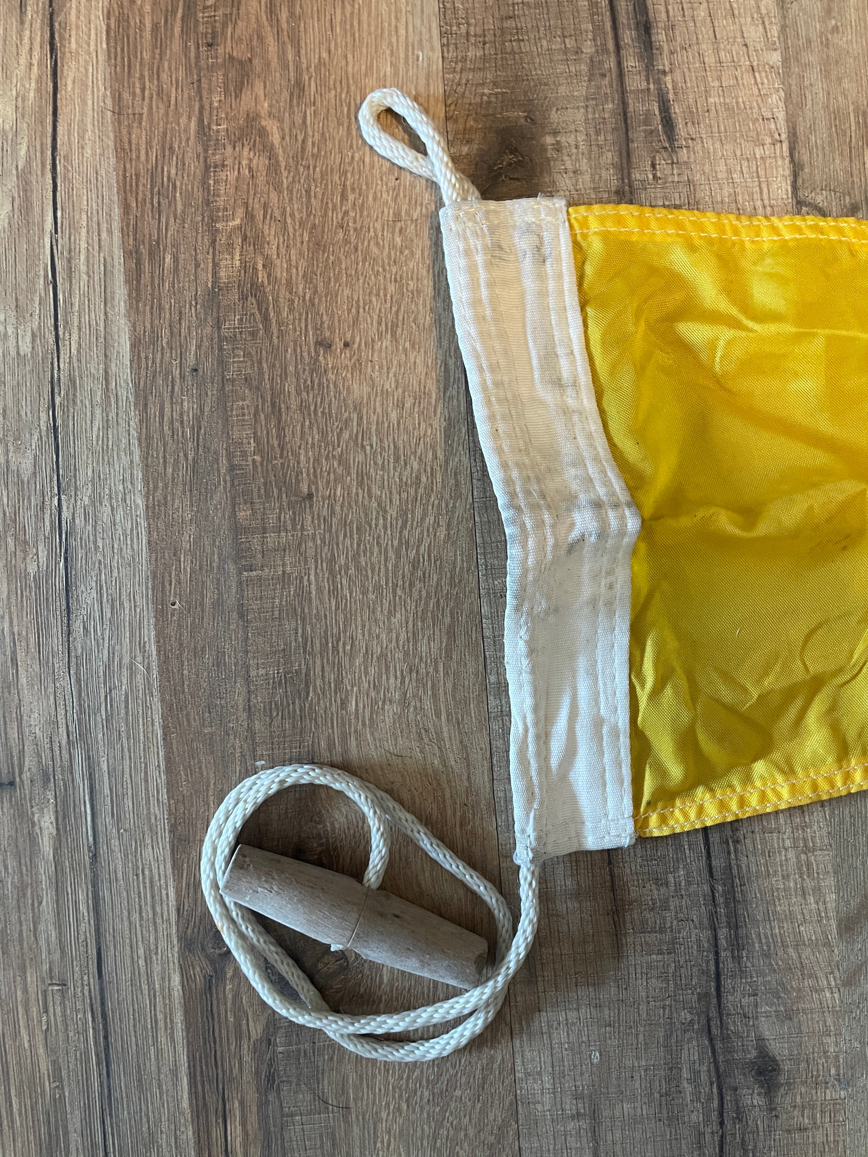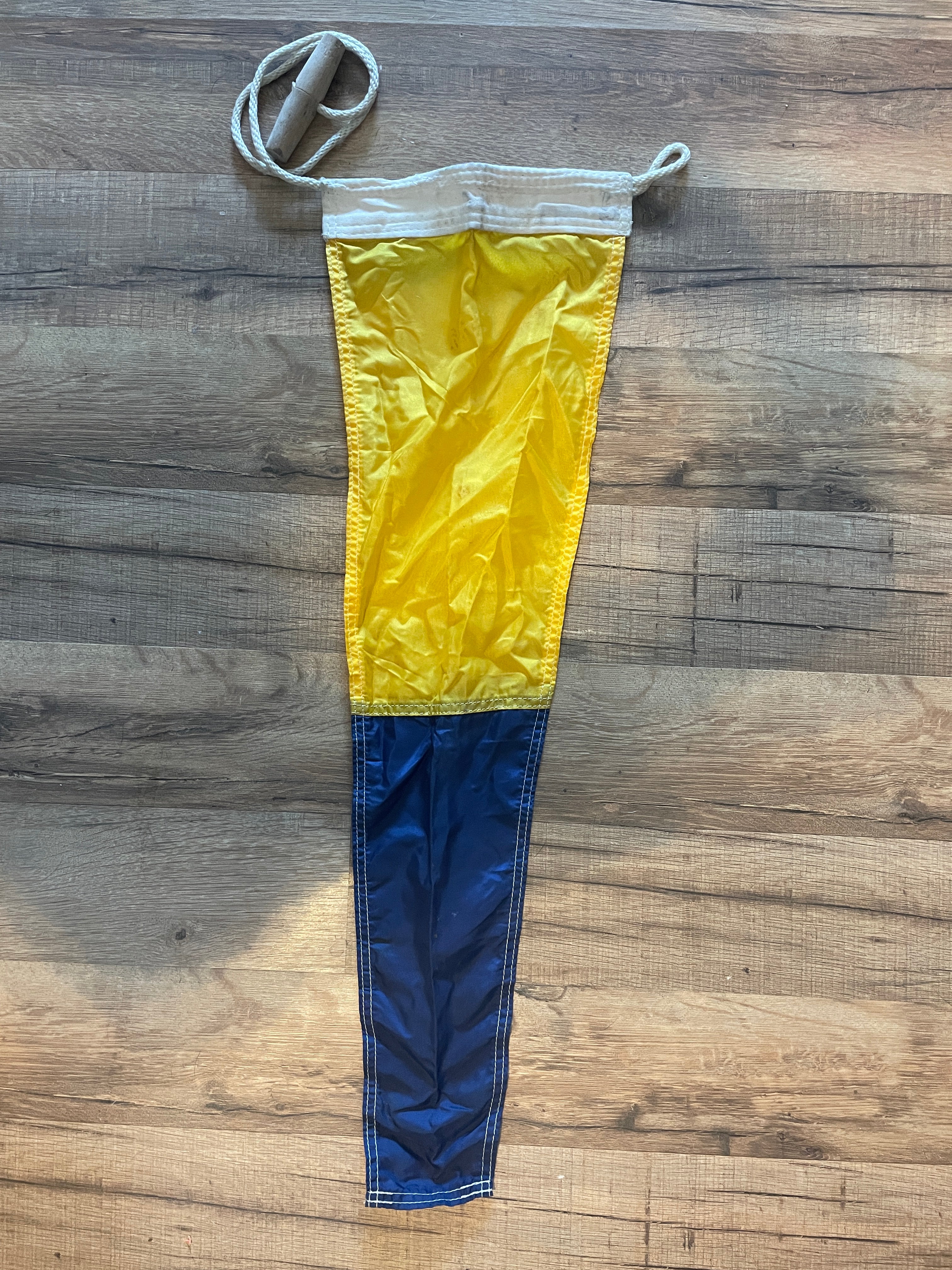 This marine signal number 5 flag is in great condition. Very minimal staining. Has no rips, tears or stitching issues. Measures 27” total length.