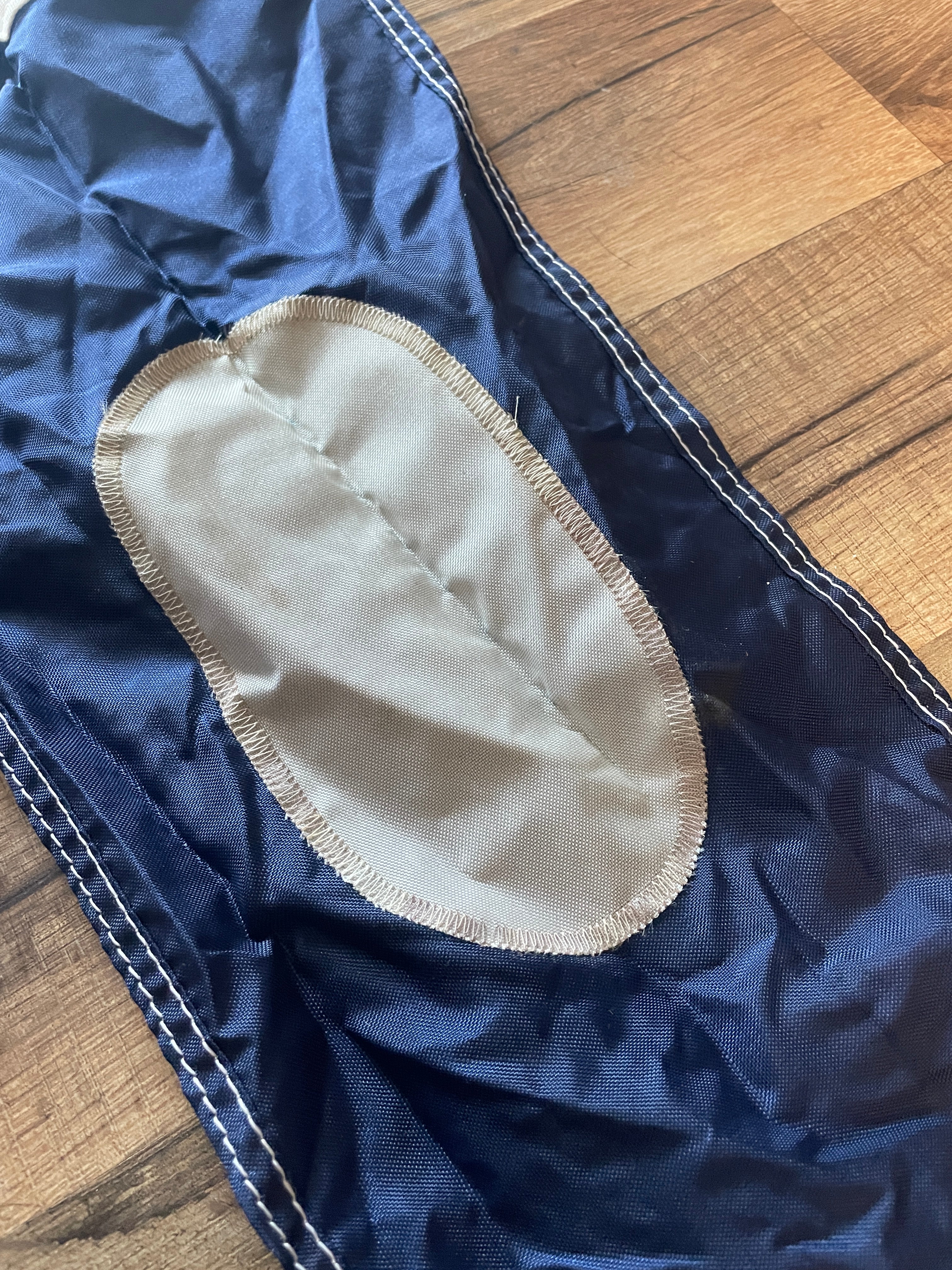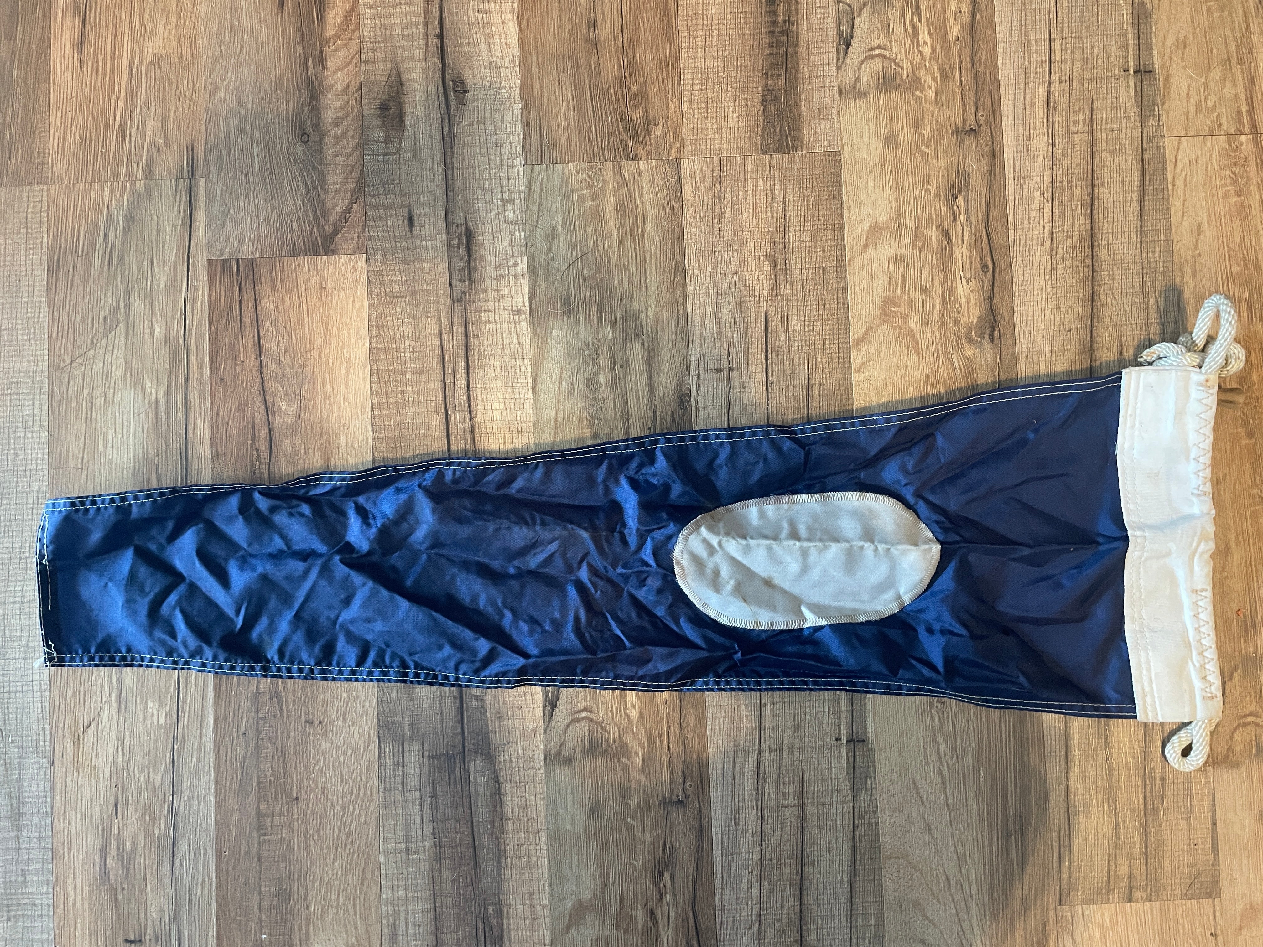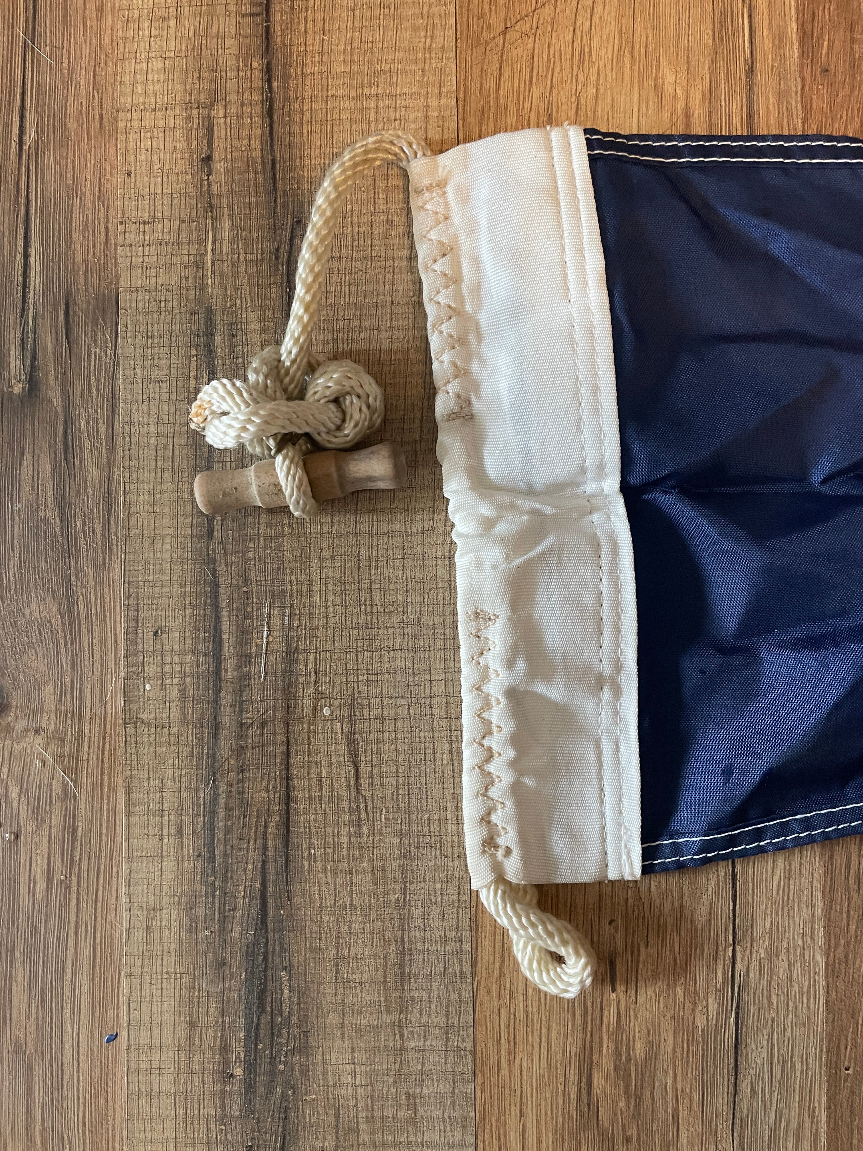 This marine signal flag #2 is in good condition. Very minimal staining. No rips or tears or stitching issues. Measures 27” long.