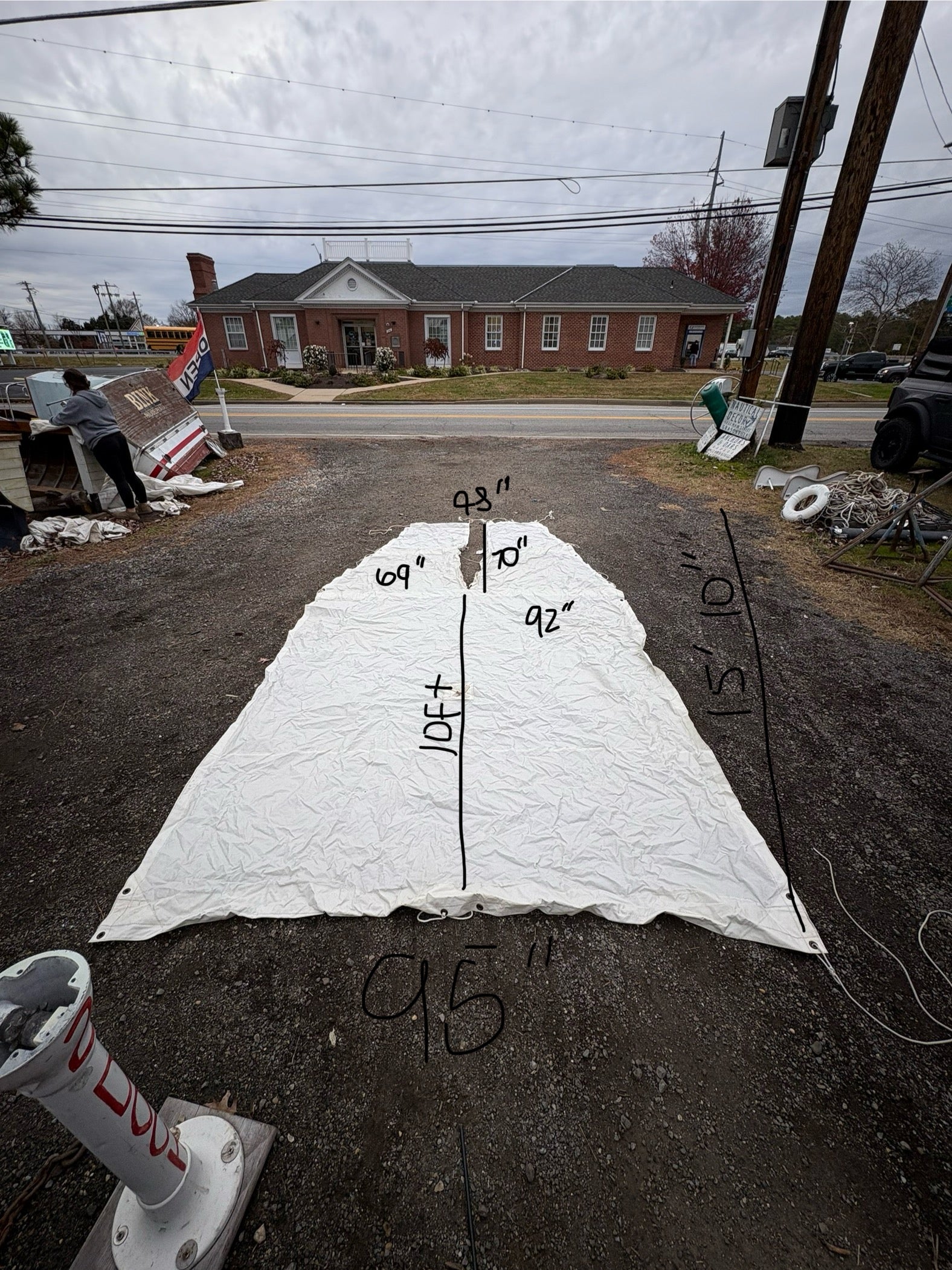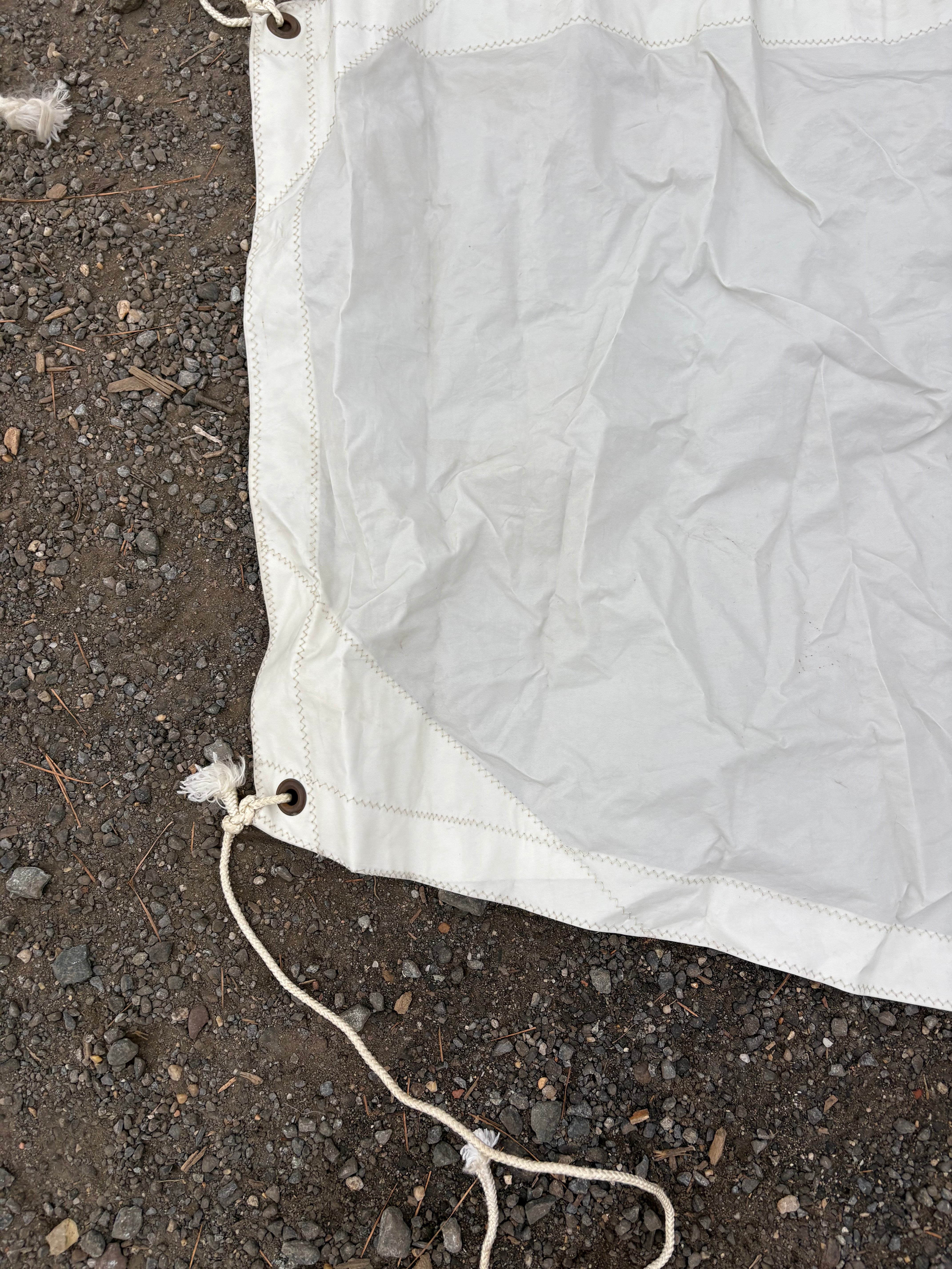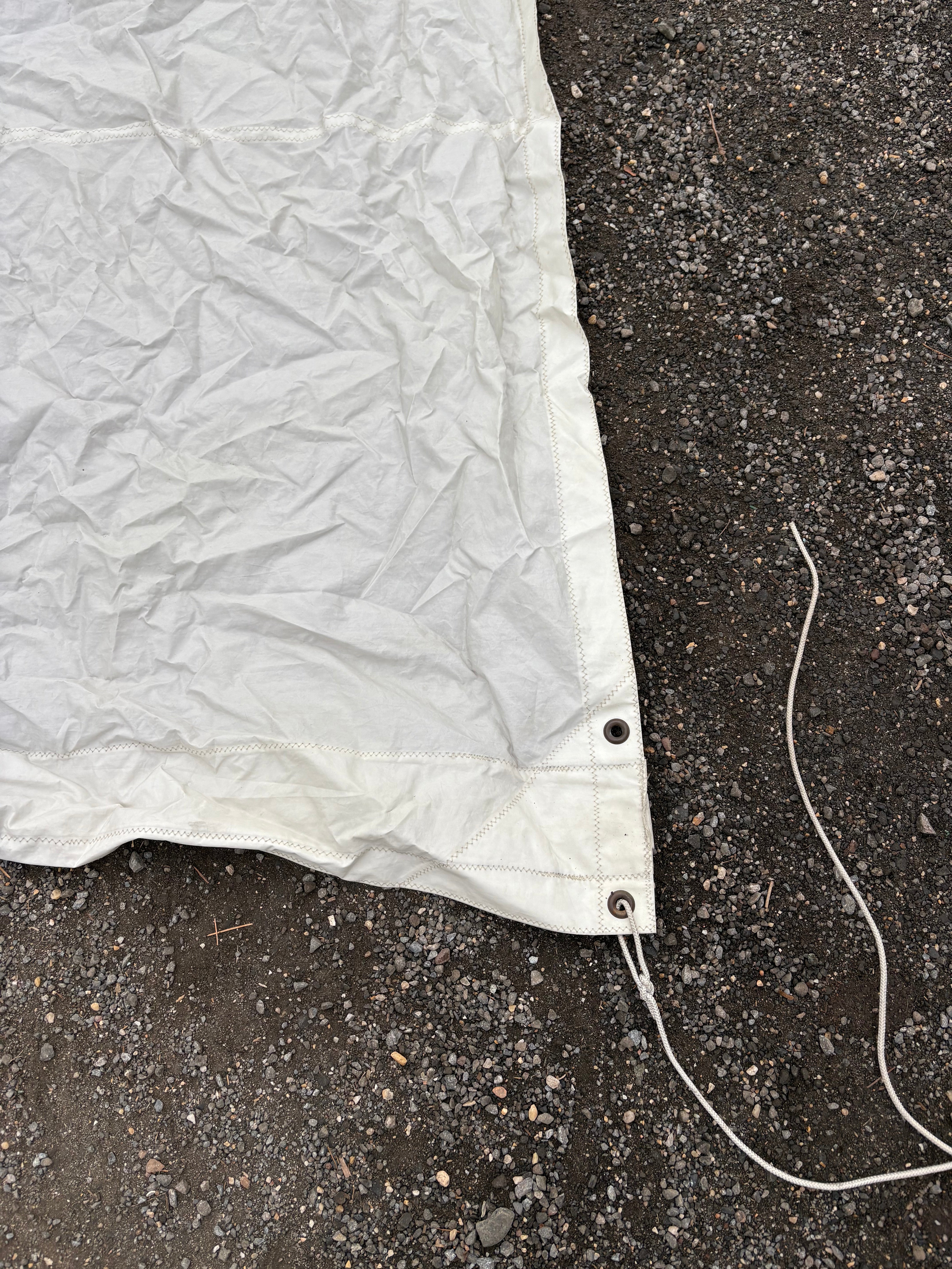 This canvas shade was removed off a mariner 28 boat. The cover is 15'10" total length. The very top width is 95". The very bottom with the splits is 48". The splits are 70" in length. The second widest area for a rod to go is 92" width and the third shortest width for a pole is 69". There are no rips or tears to the canvas - just dirty.