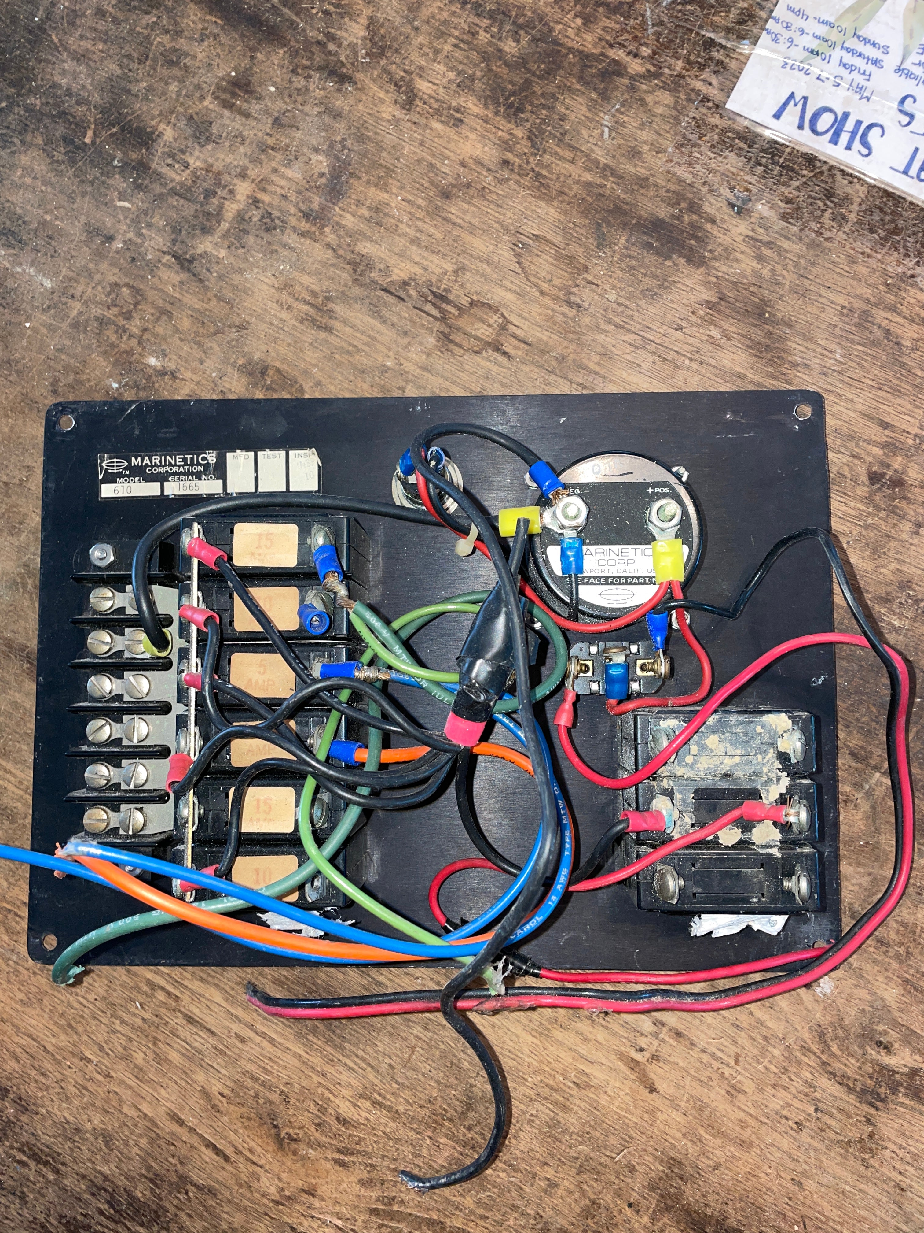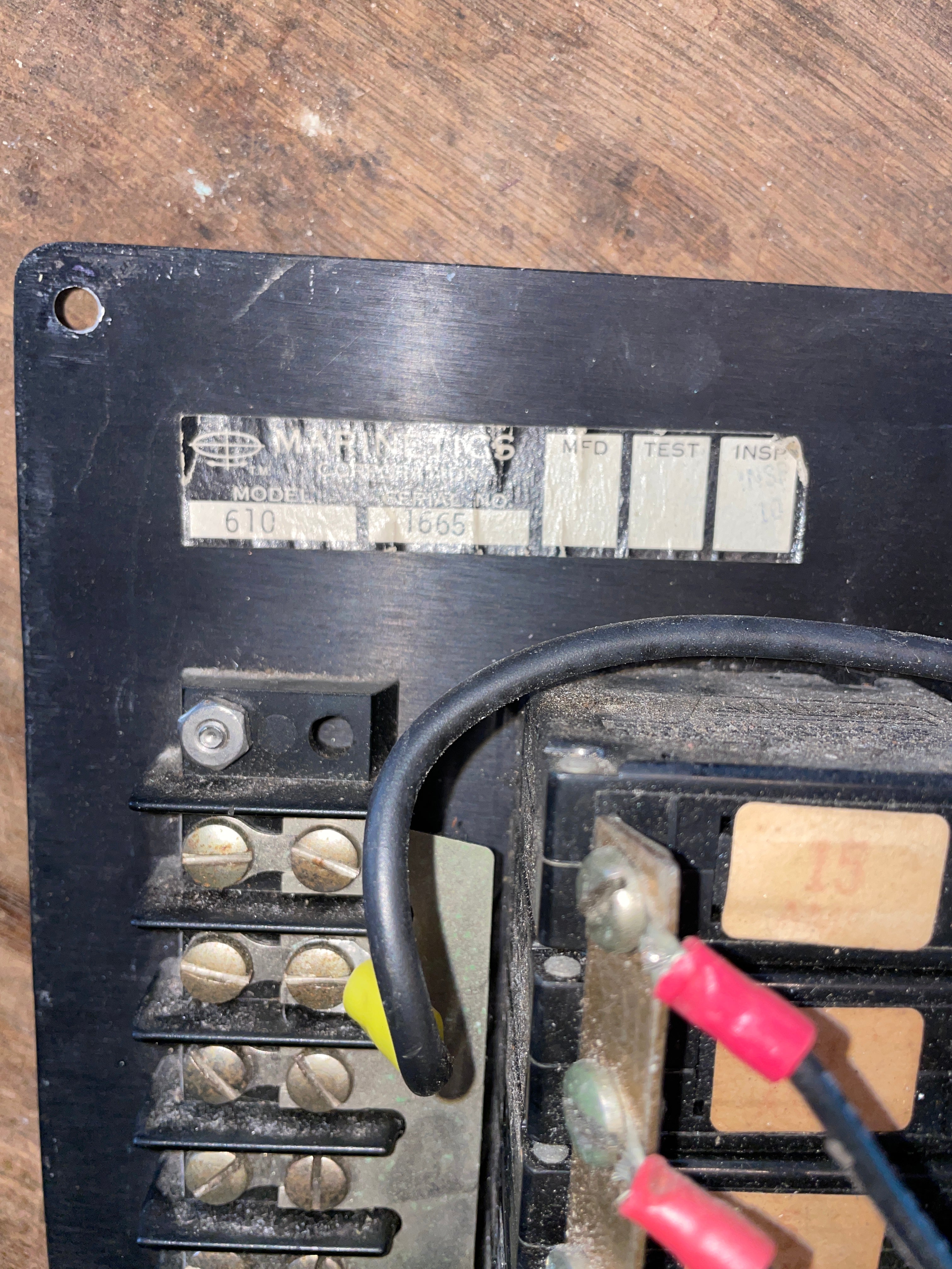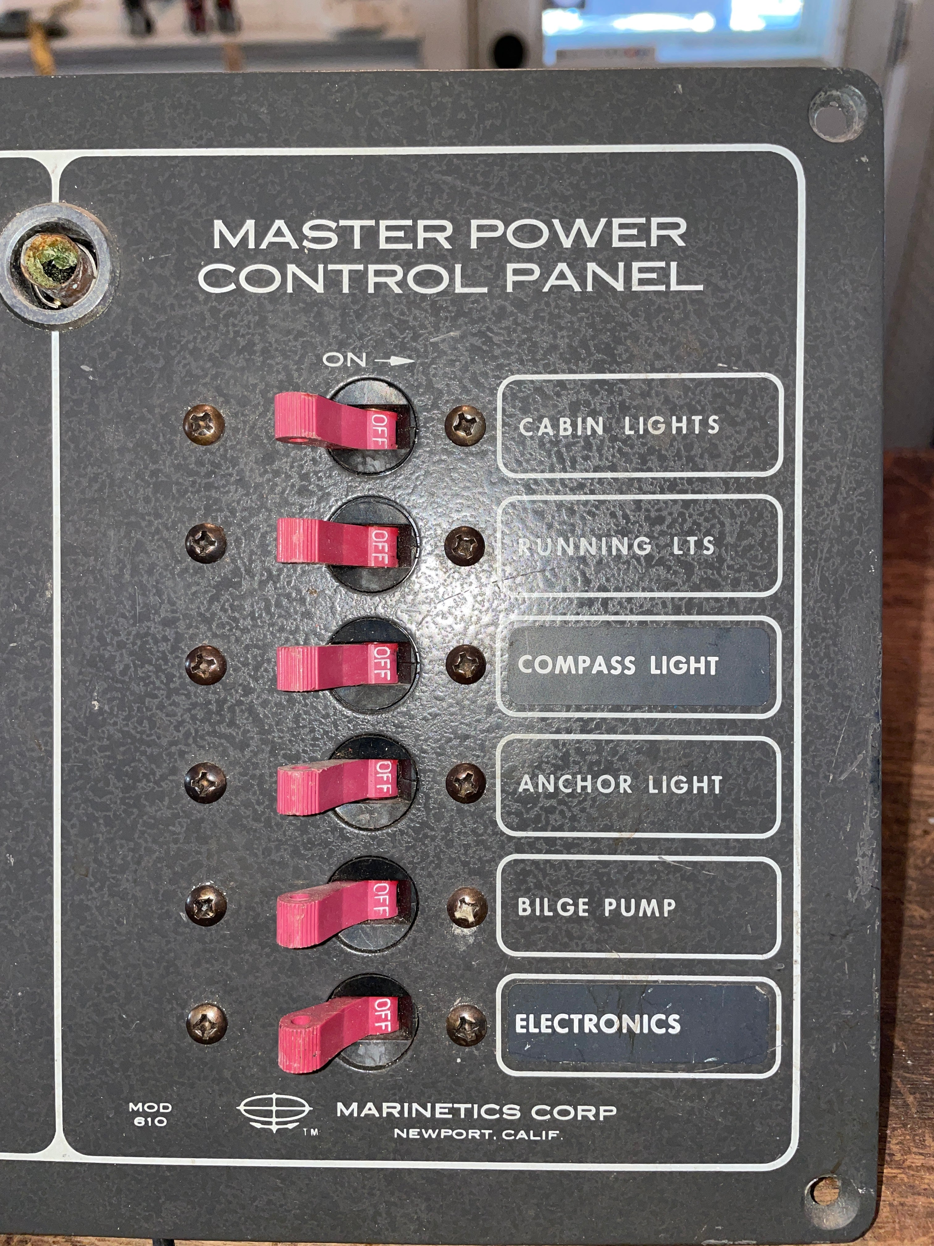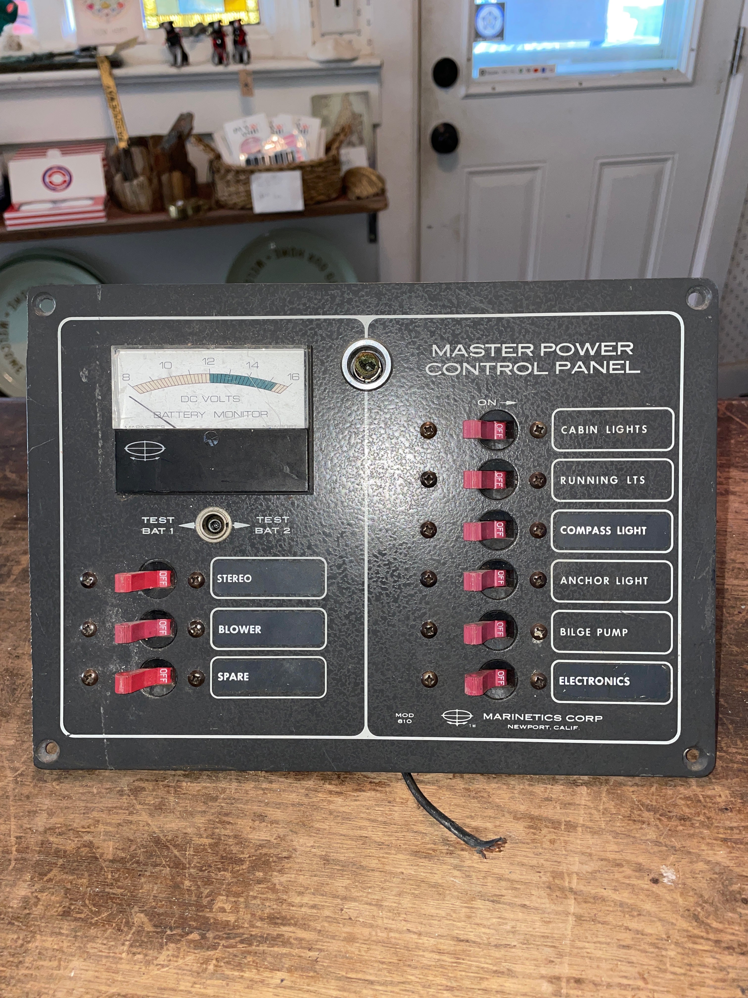 Good Condition, Marinetics Corp Master Power DC Control Panel. Has 9 DC Fuse Switches. Model # 610. Serial Number 1665. 10 1/2” Long x 7 1/2” Height.