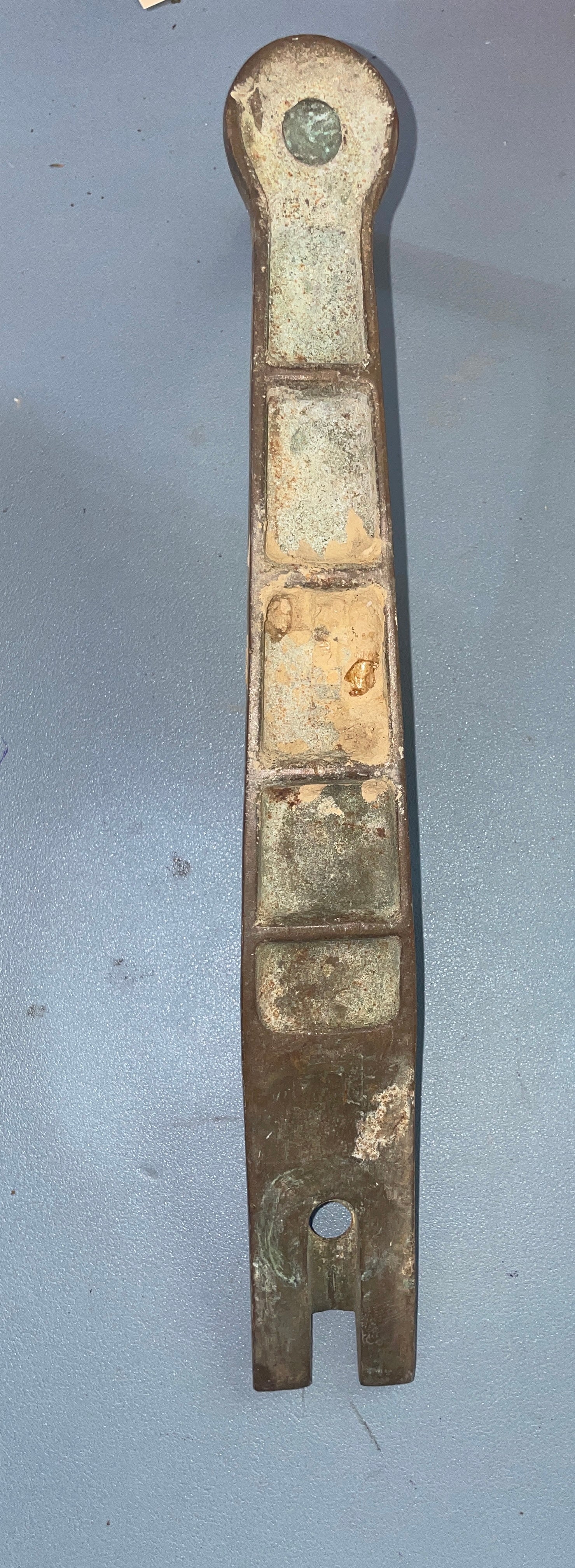 This solid bronze merriman winch handle is in good condition. The only issue with this one is that the wooden part of the handle is no longer there so it is just the bronze inner part. This handle is 11 1/2' total length. It is 1 1/2" wide x 3 1/4" long.