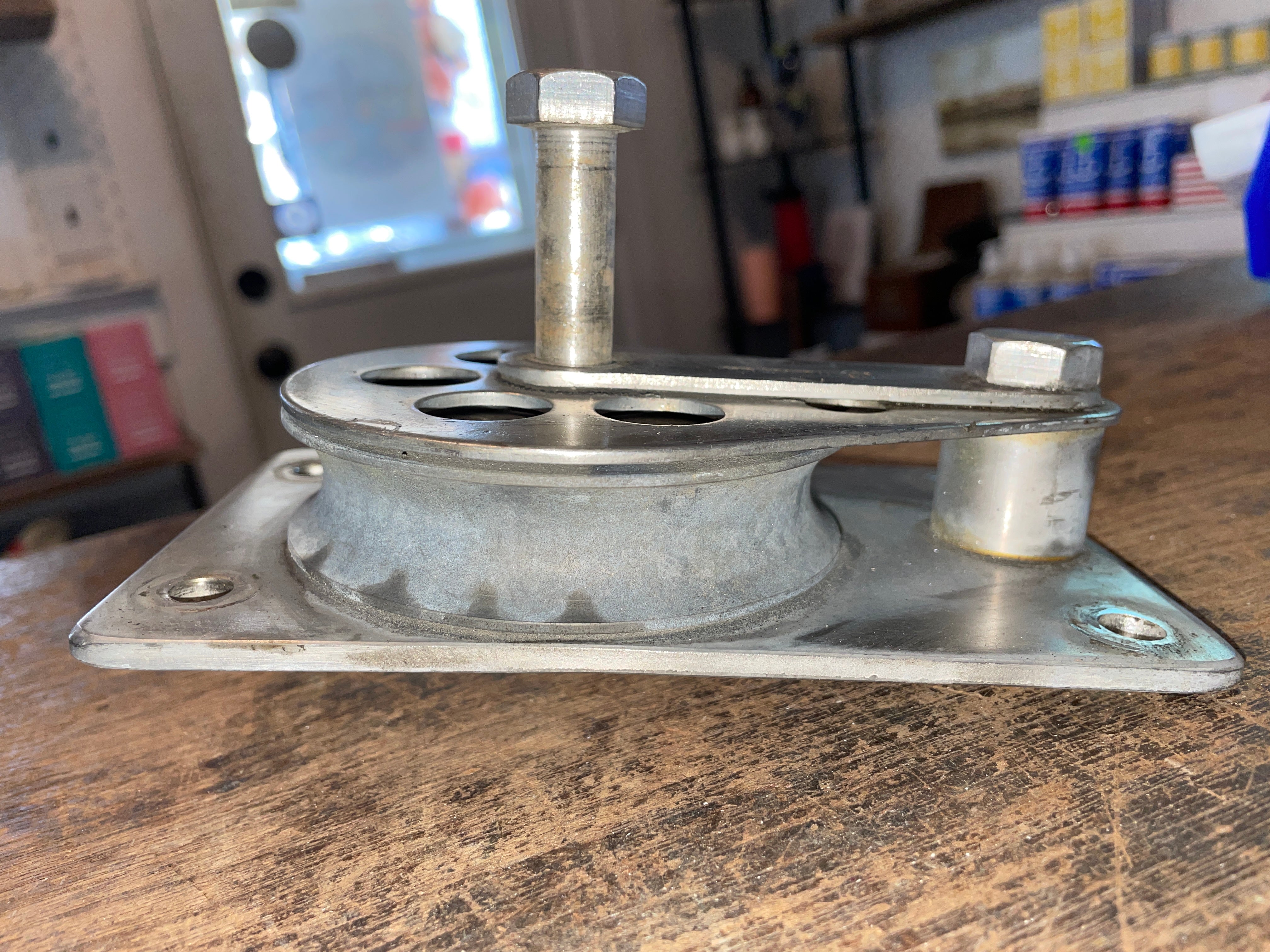This merriman big boat foot block is in great condition. The sheave is 3 5/8” and can fit up to 11/16” line diameter. The base is 6 1/4” long x 3 3/4” wide and sits 1 1/2” tall. Has the large through bolt that is 1/2”.