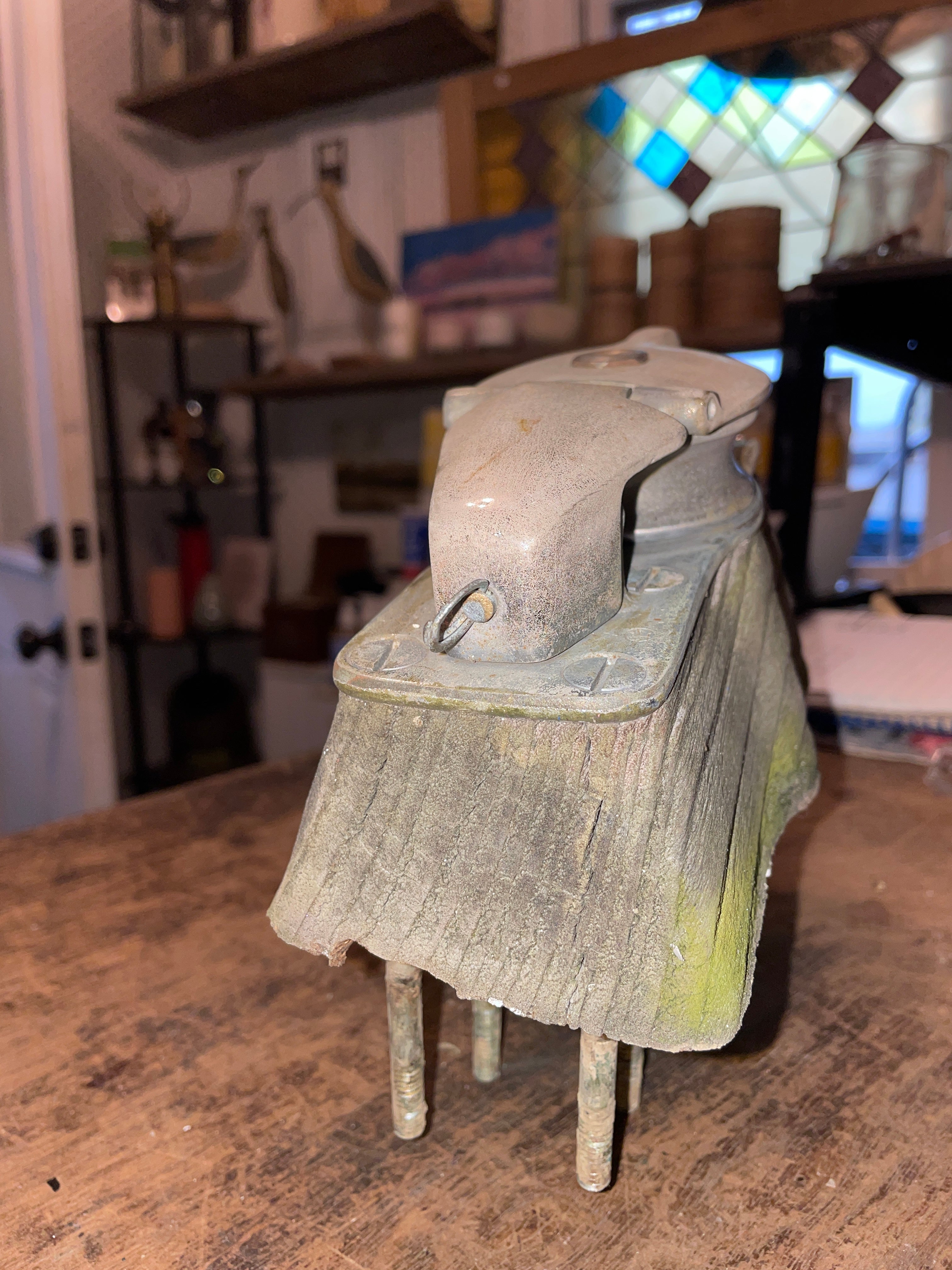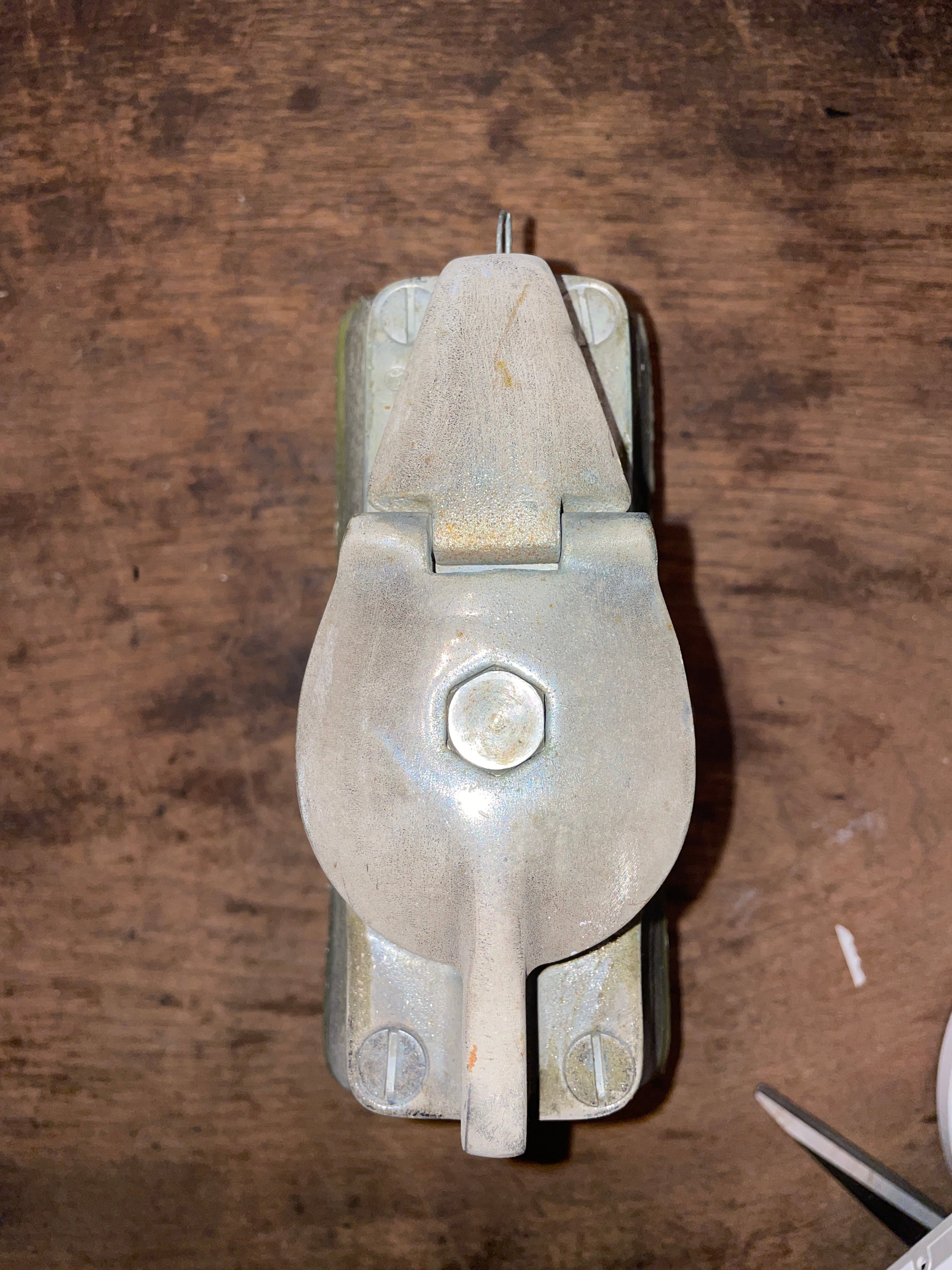 This large Merriman latching cheek snatch foot block is in excellent condition. It has a 2 3/4” sheave and can handle up to 1 1/8” line. Total length of this block is 6 5/8”. The snatch is in excellent working condition. The hole at the back is 7/16” diameter. The wooden mounting block is angled. Total length is 8 1/4”. Stands 3” at the tallest and 1 1/8” at the shortest height. Comes with all 6 bolts.