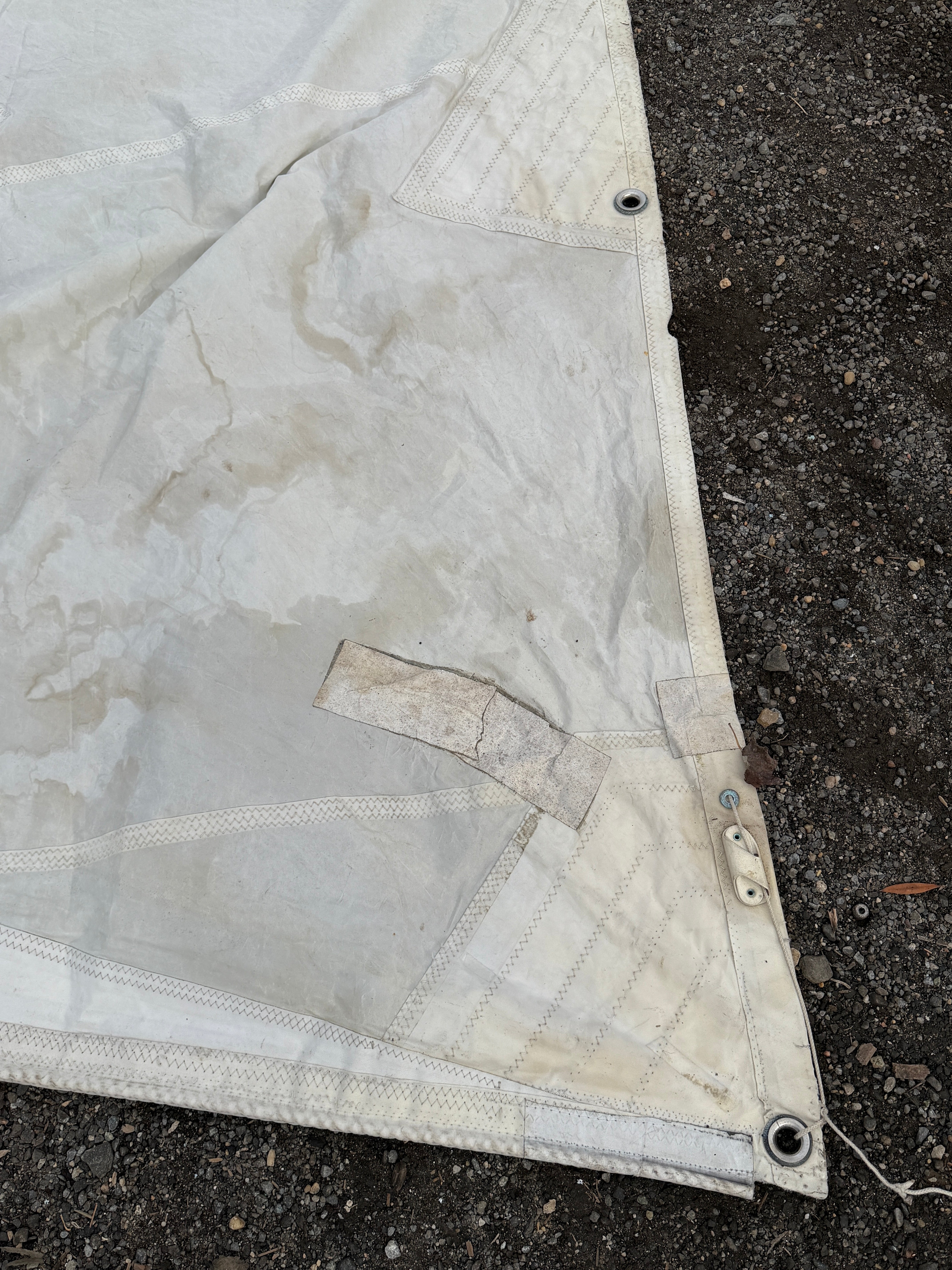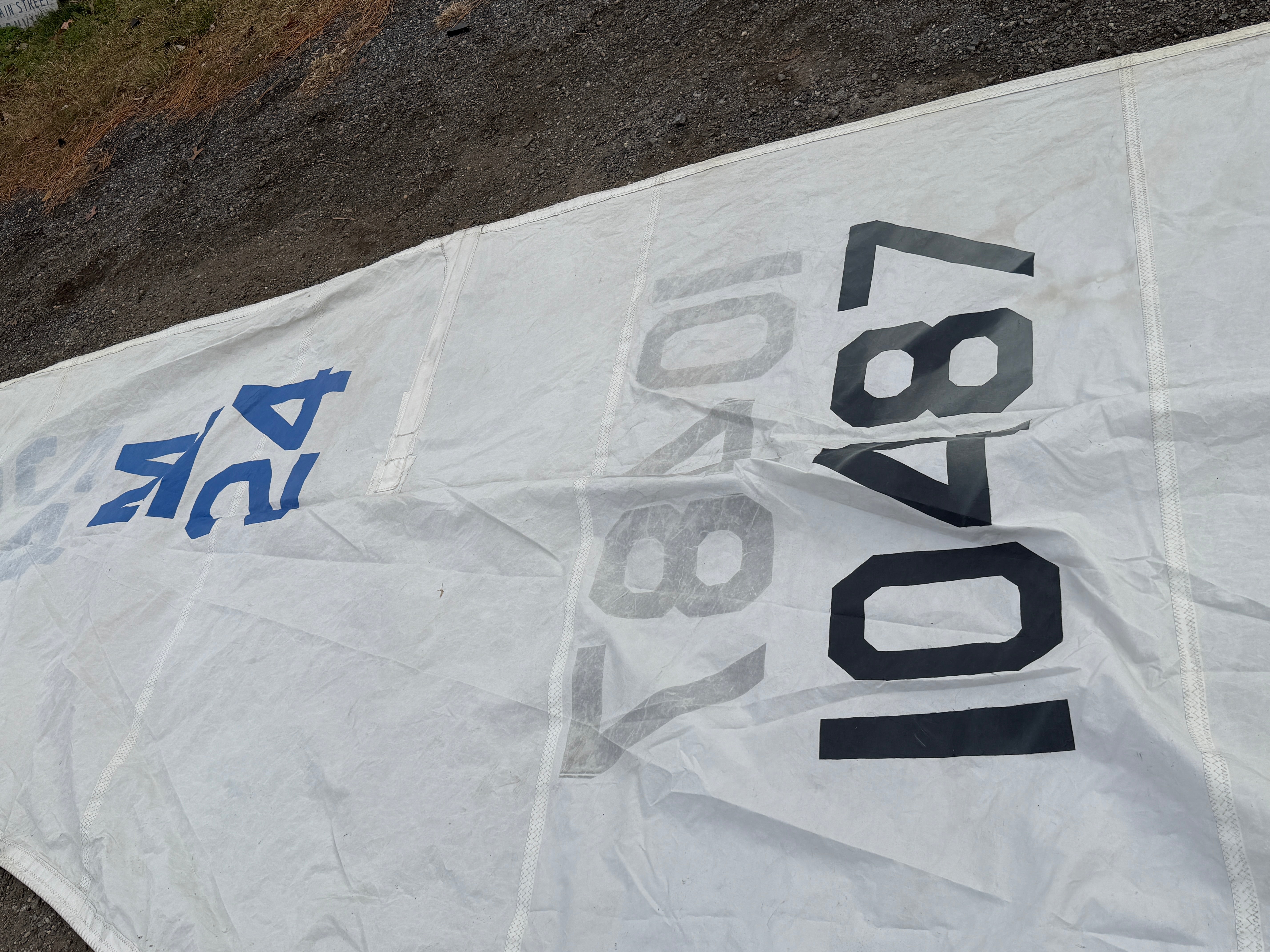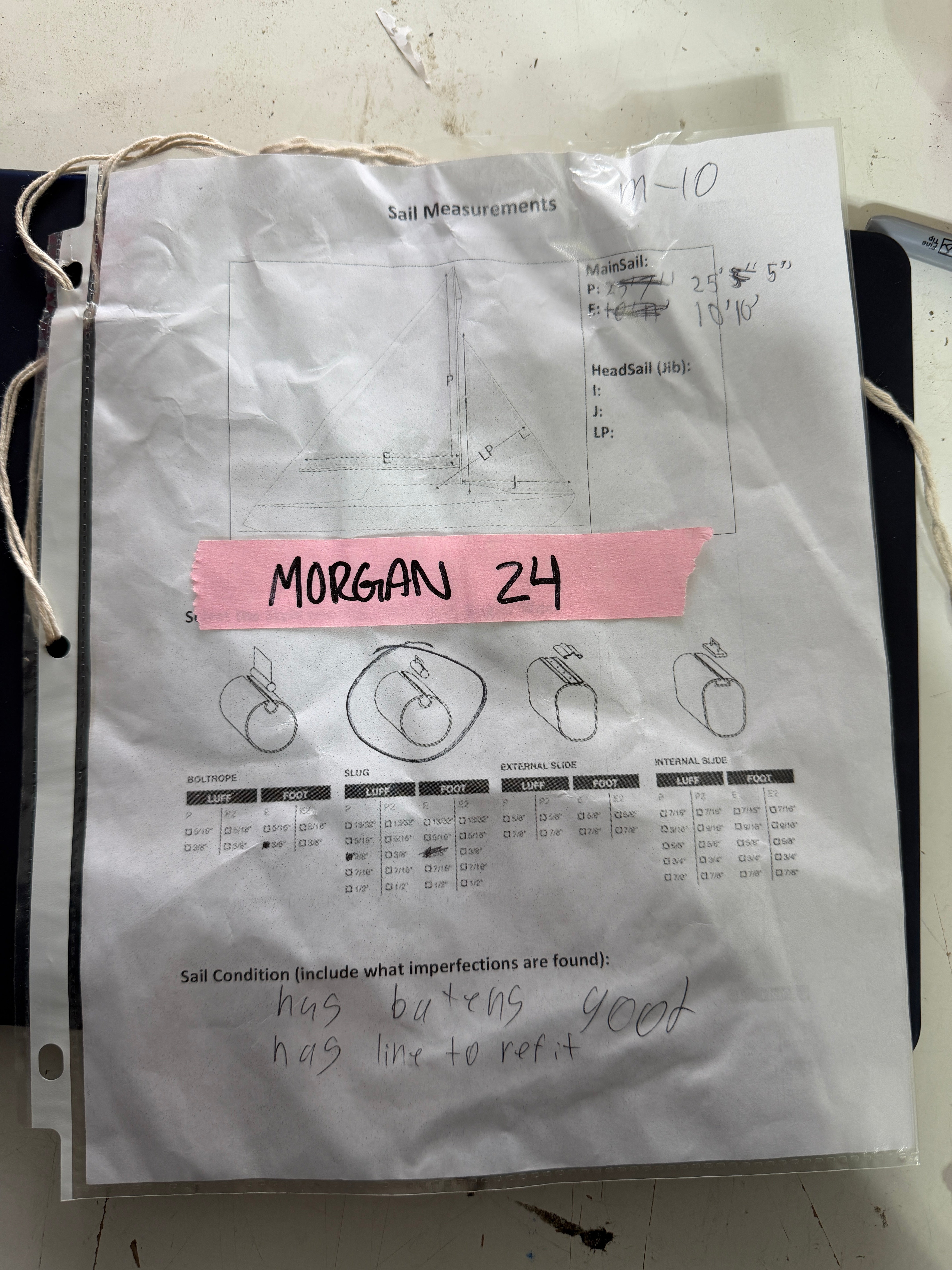 This Morgan 24 main sail is in as is condition. Dirty. 12" tape repair on one corner. The P measurement is 25'5" and the foot is 10'10". The luff was not measured. 3/8" slide diameter.