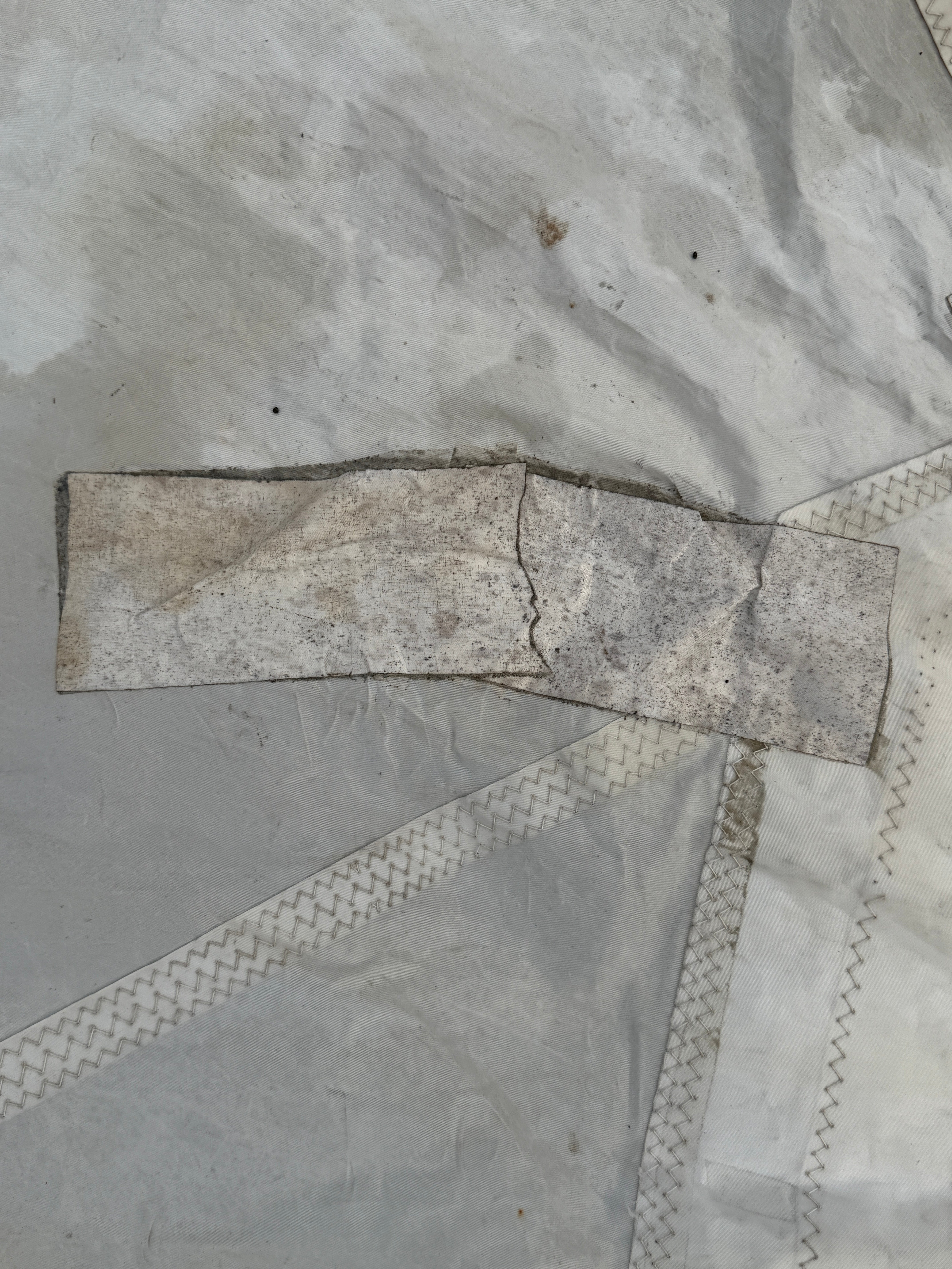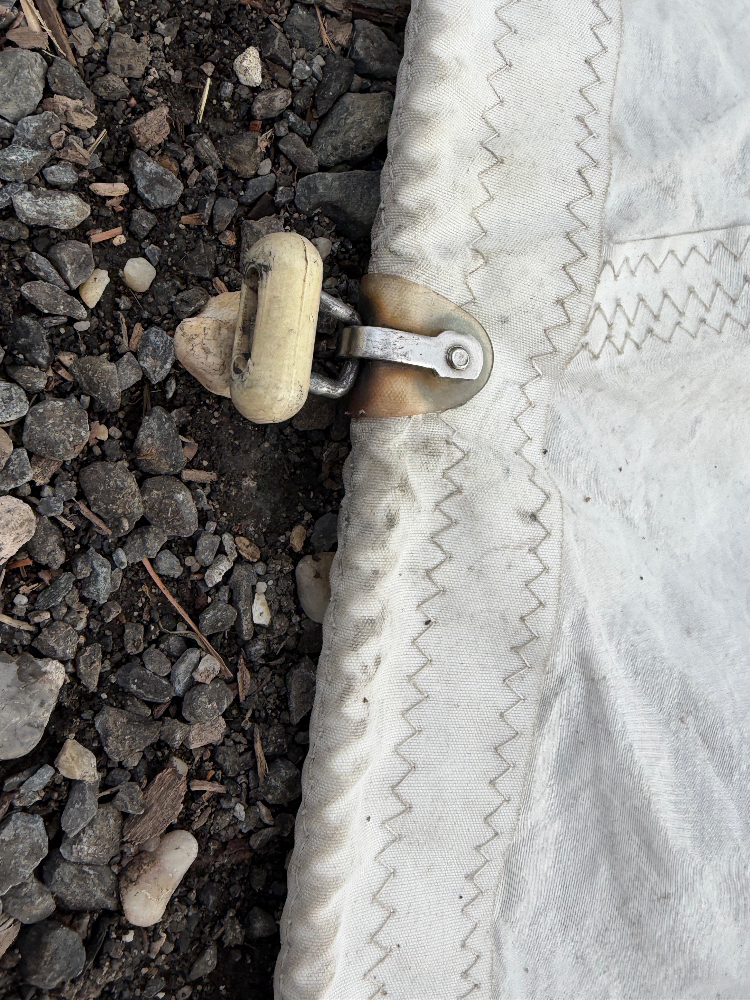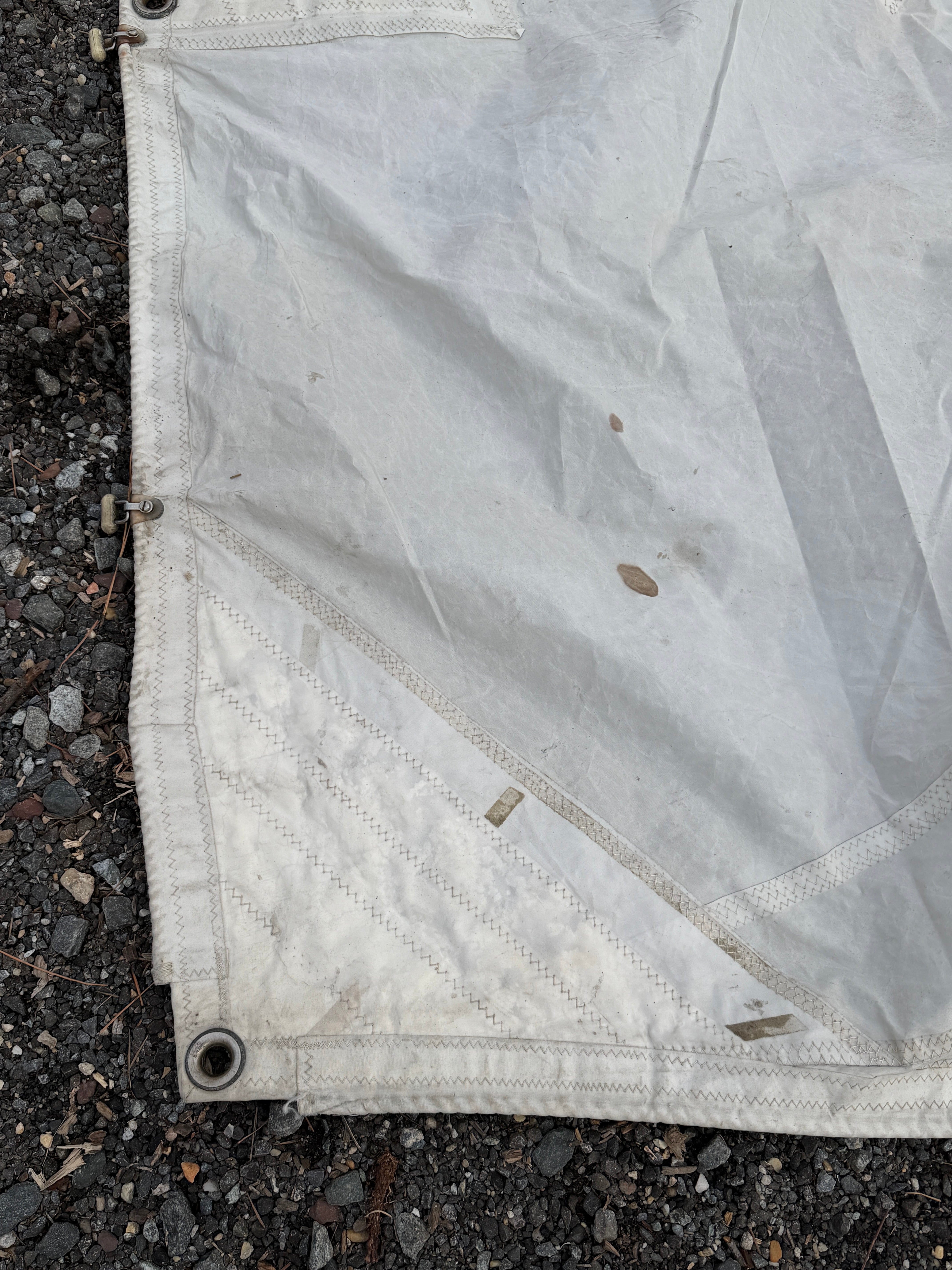 This Morgan 24 main sail is in as is condition. Dirty. 12" tape repair on one corner. The P measurement is 25'5" and the foot is 10'10". The luff was not measured. 3/8" slide diameter.