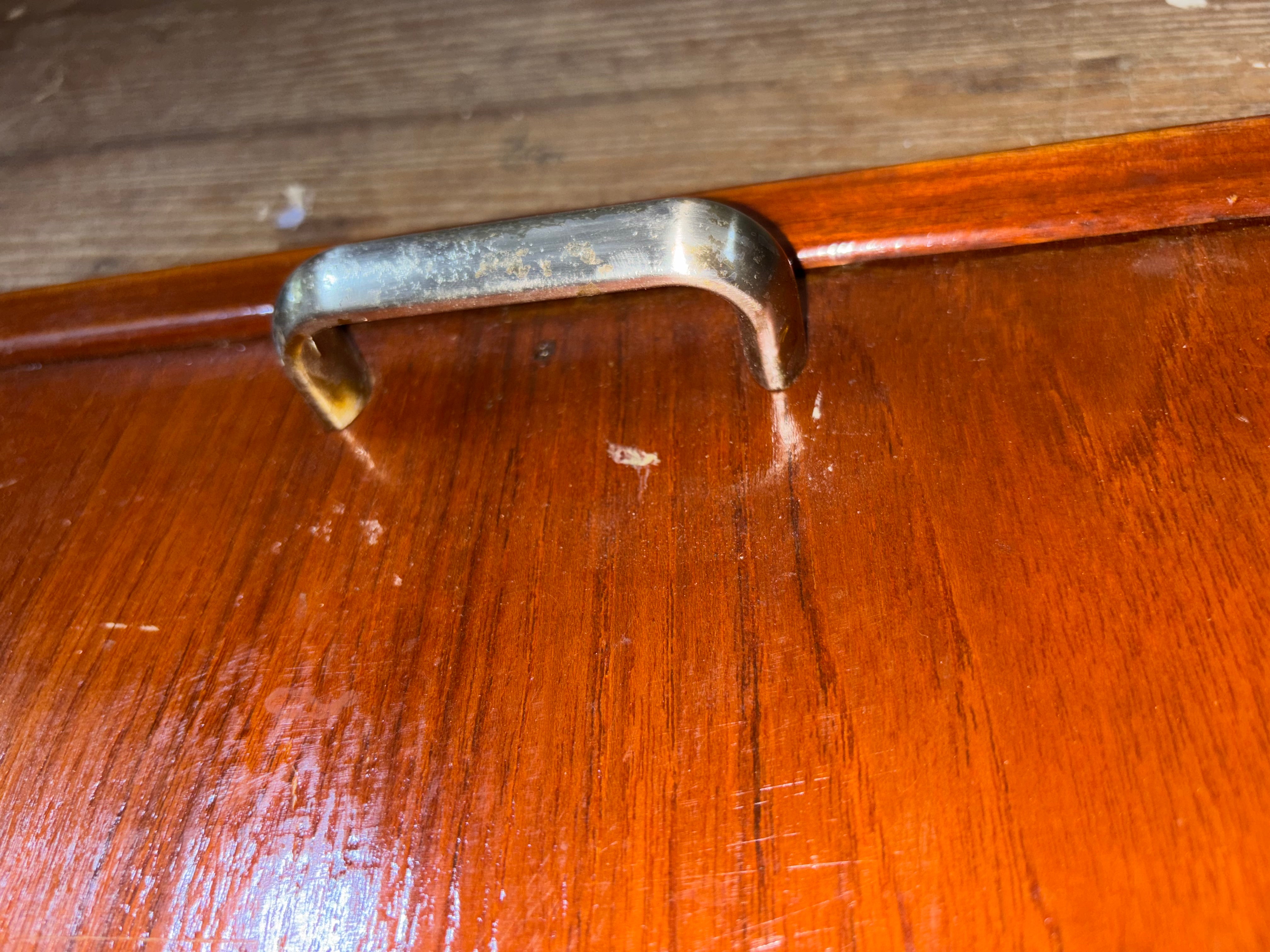 This interior door was removed off a Morgan 415 sailboat. The door is a very shiny varnish, the hinges are in good condition. Overall this door is in great condition. The handle is a little lose, easy to tighten back up. The door measures 30 1/4" total length x 9 3/4" wide.