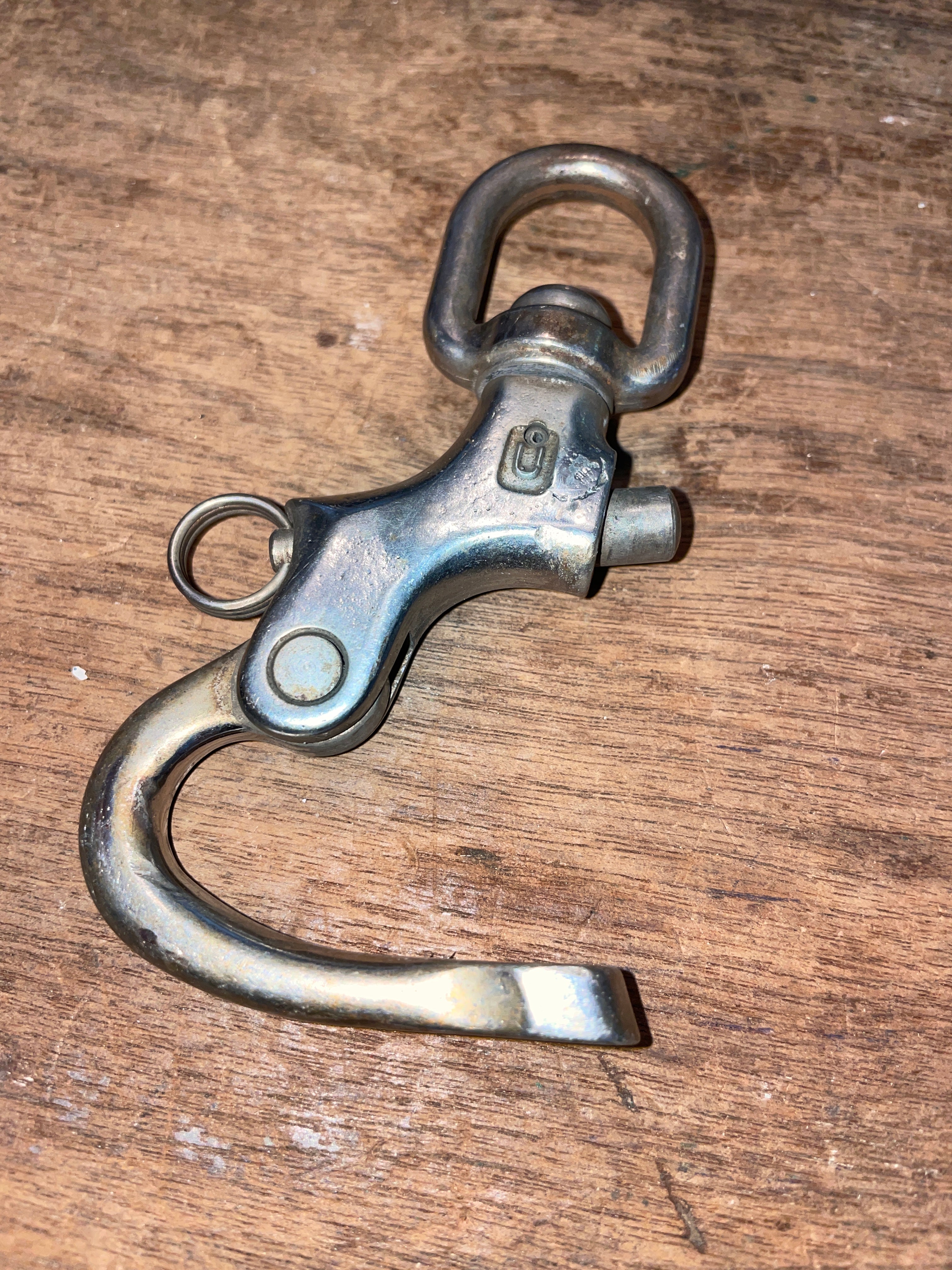 This stainless steel nicro marine snap shackle is in great condition. The swivel bail eye has a 11/16” width. Works as should. The shackle is 3 5/8” total length. Has some discoloration of the stainless but otherwise great condition.