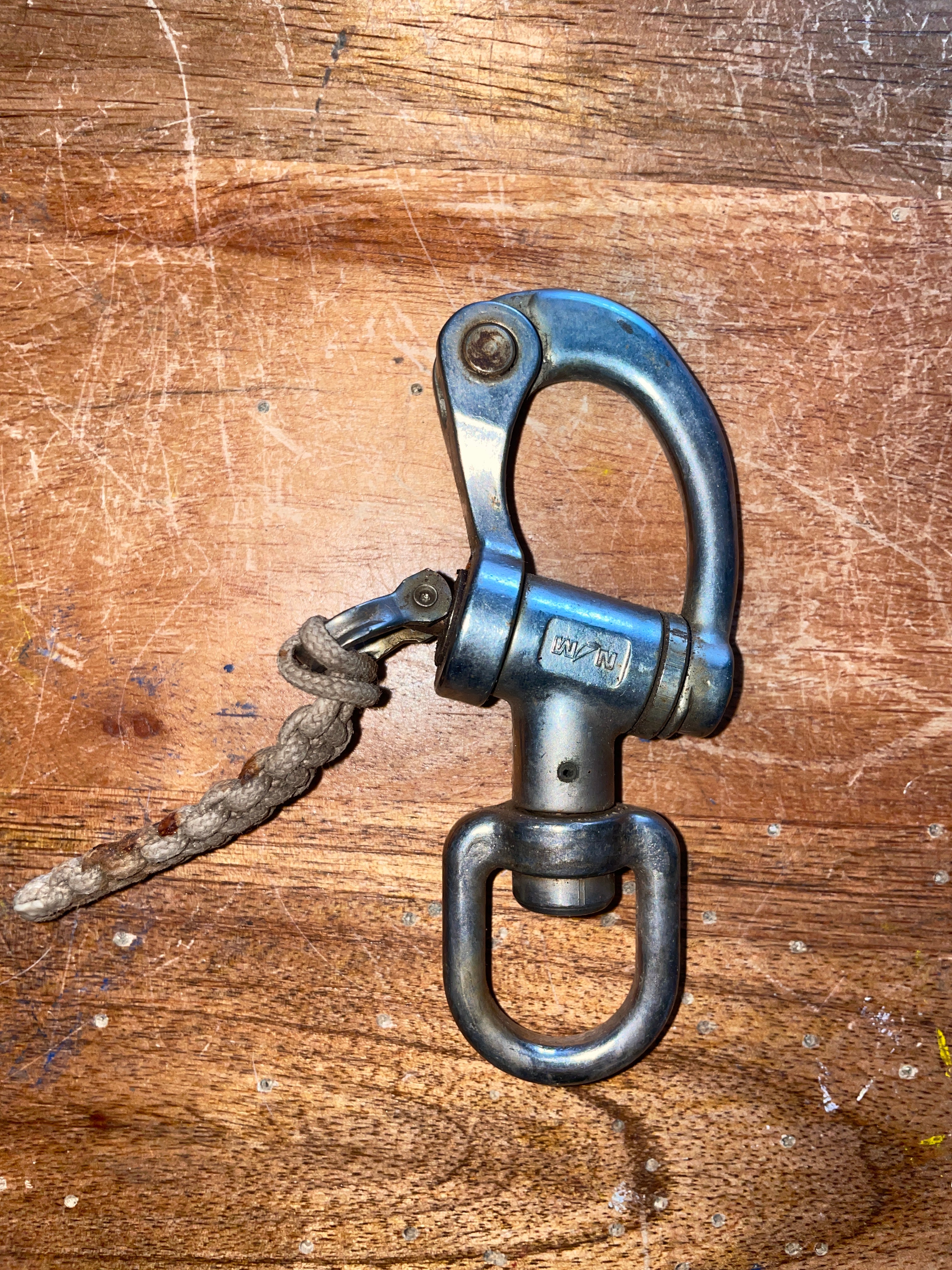 This stainless steel Nicro marine shackle is in great condition. Pat # 3854068. This shackle has the swivel bail but it also can fold in half. The bail has a 3/4” max width. Nice braided pull. This shackle is 4” in length.