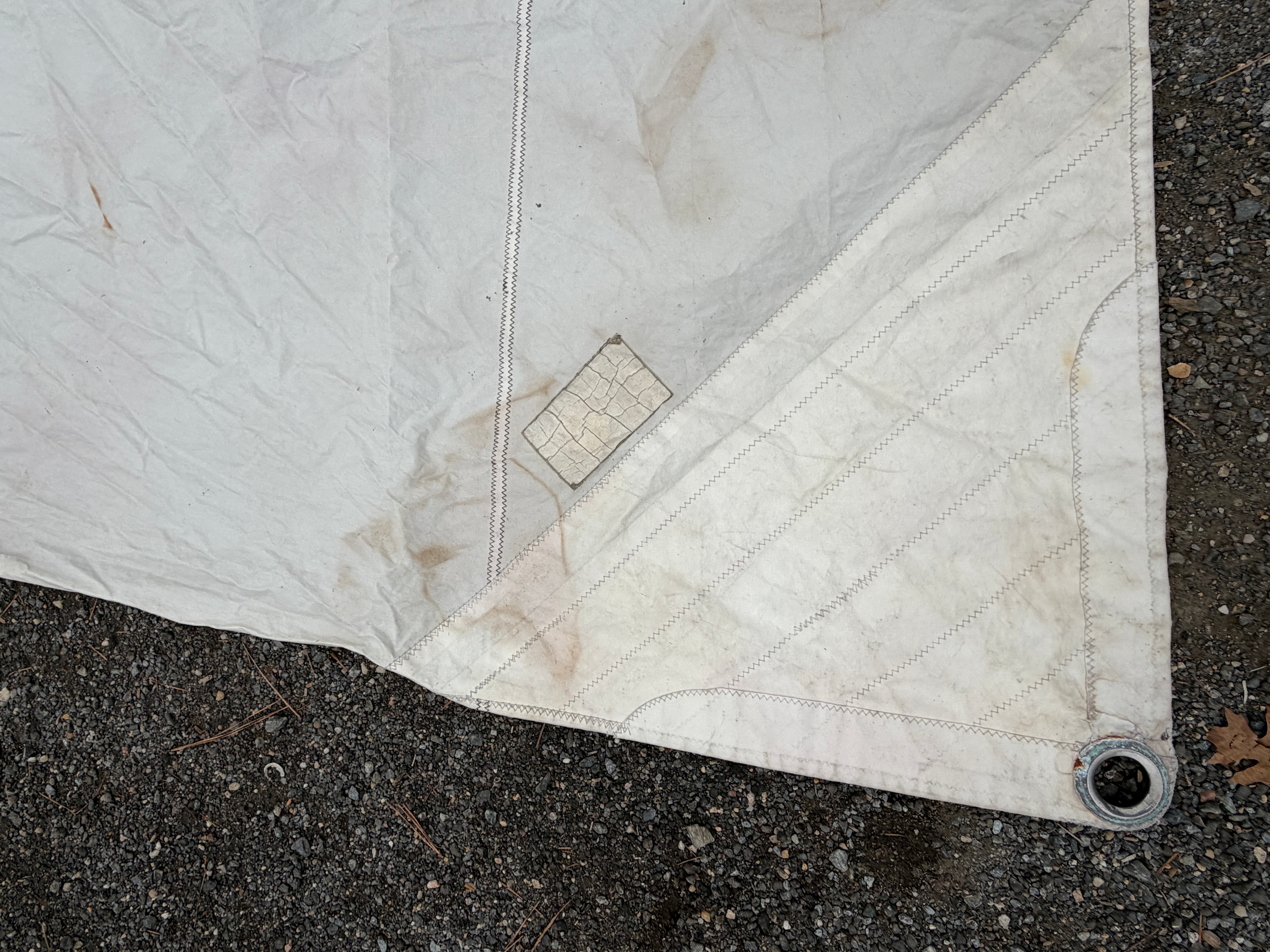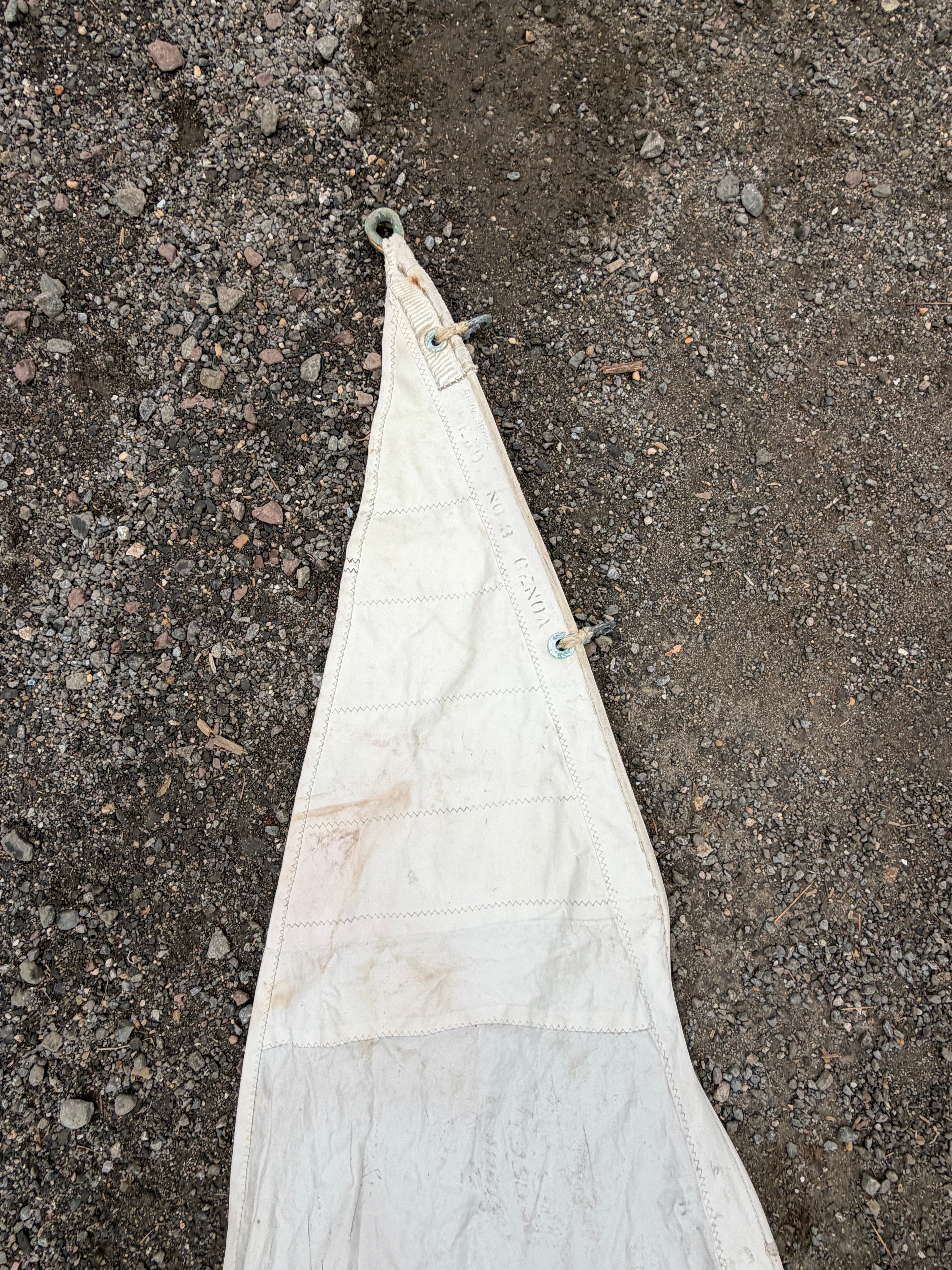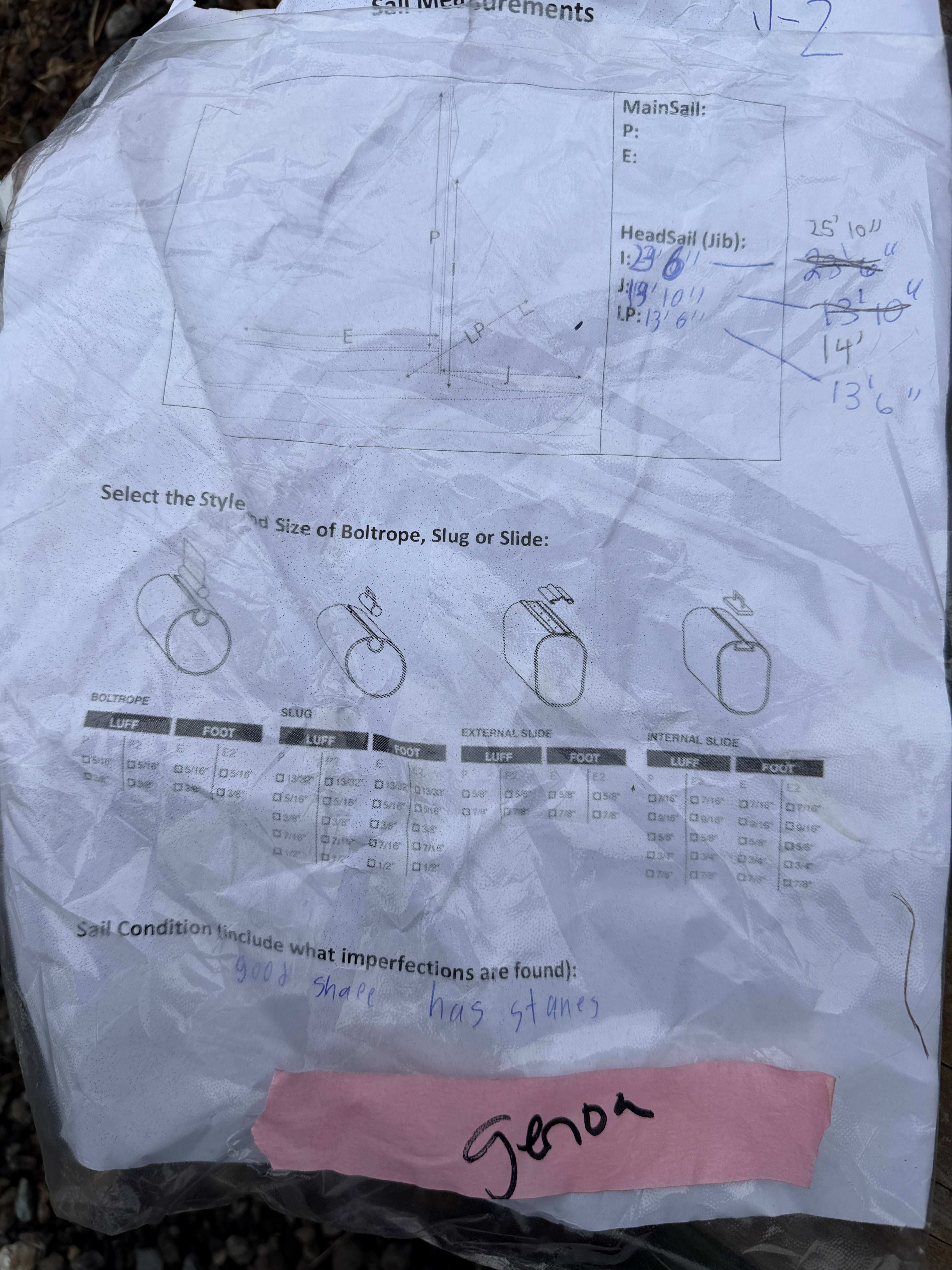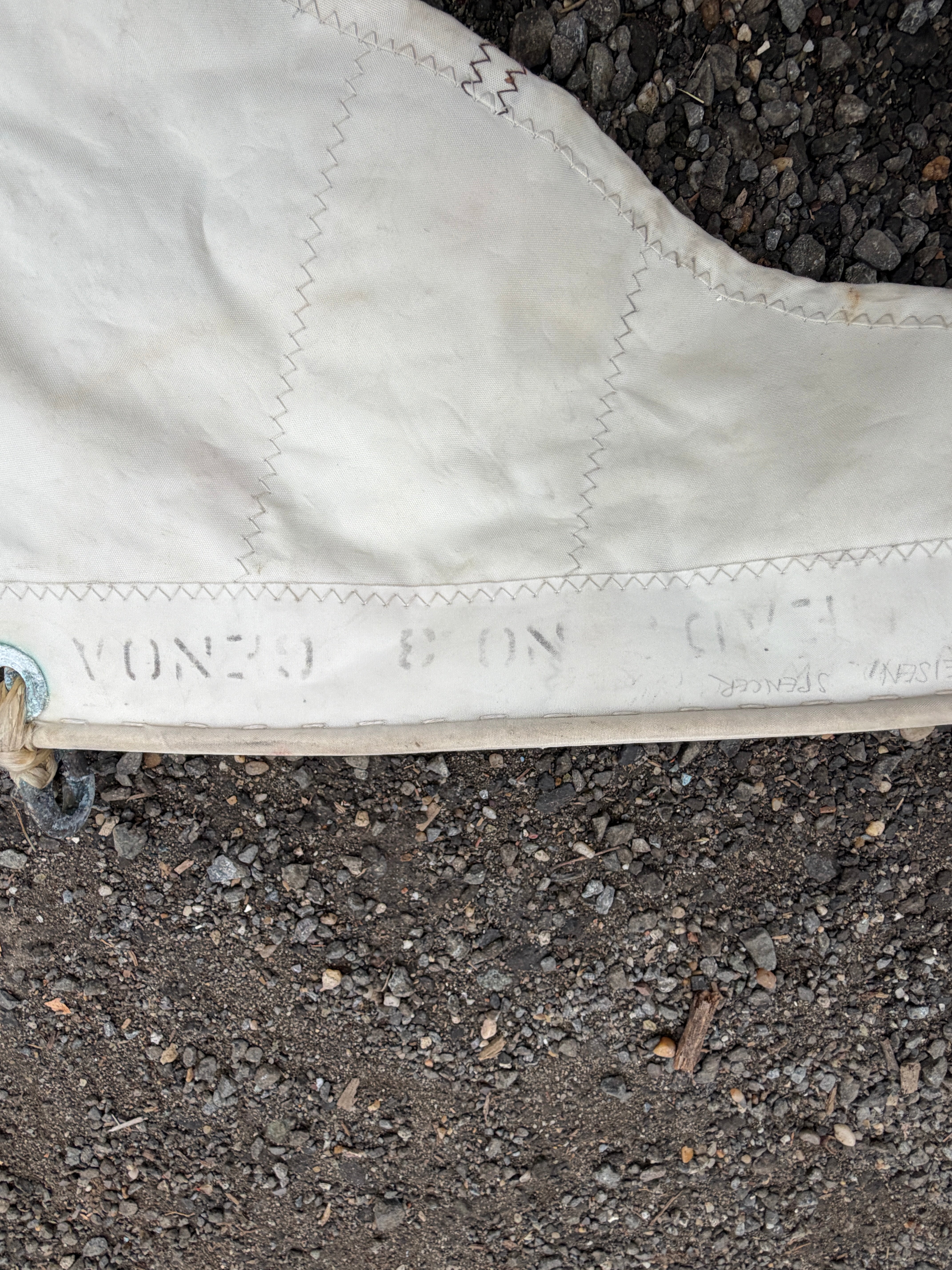 Number 3 Genoa sail. Good condition in that it has no rips or tears. There is a bit of staining to it. The sail measures 25'10" x 14' x 13'10". Does not come with a bag.