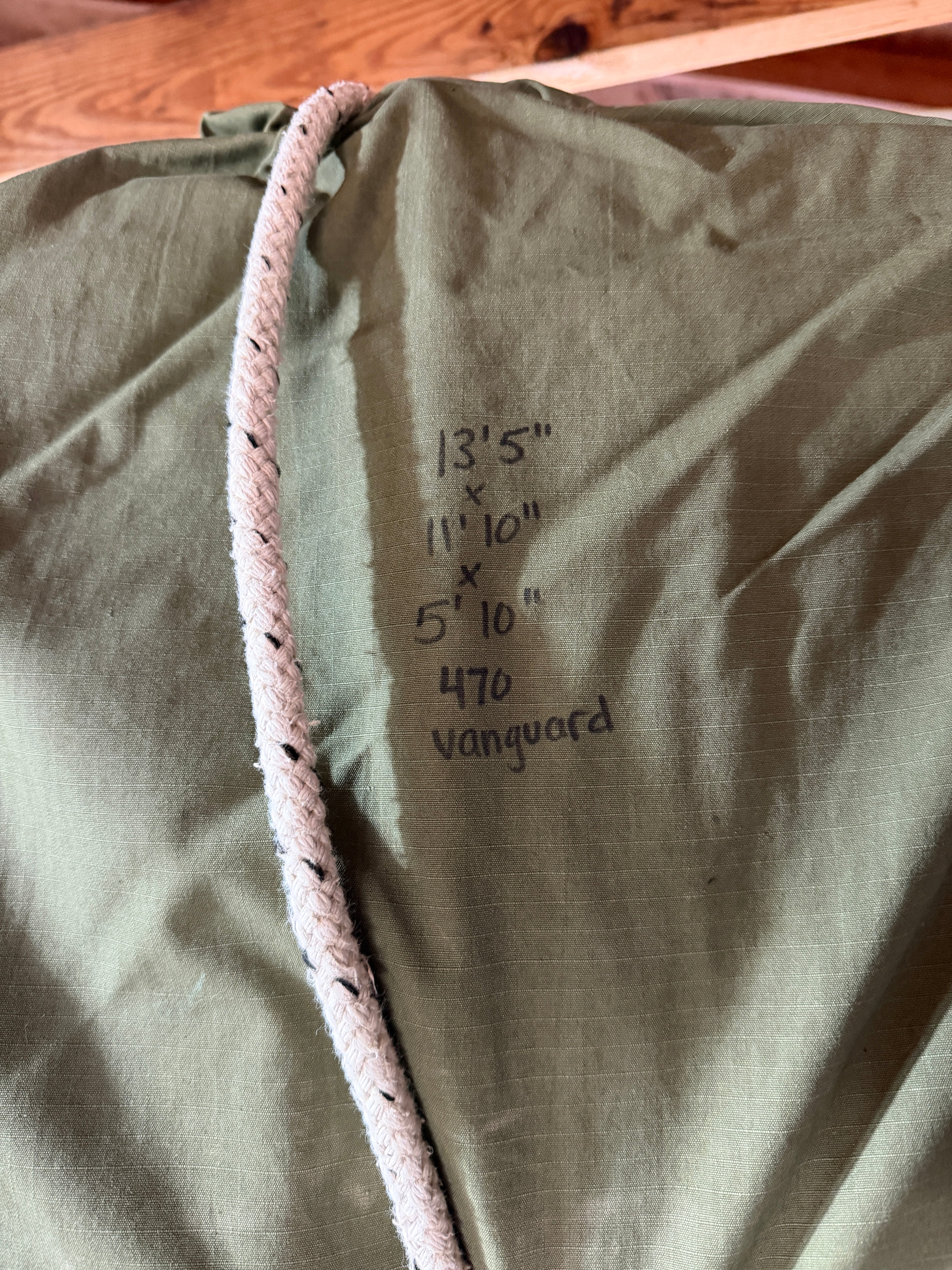 This small sail was removed off a vanguard 470 class racing sailboat. Made by northern sails. Measures 13’ 5” x 11’ 10” x 5’ 10”. Has no rips or tears. The plastic window is in great condition. Would also make a great sunshade!