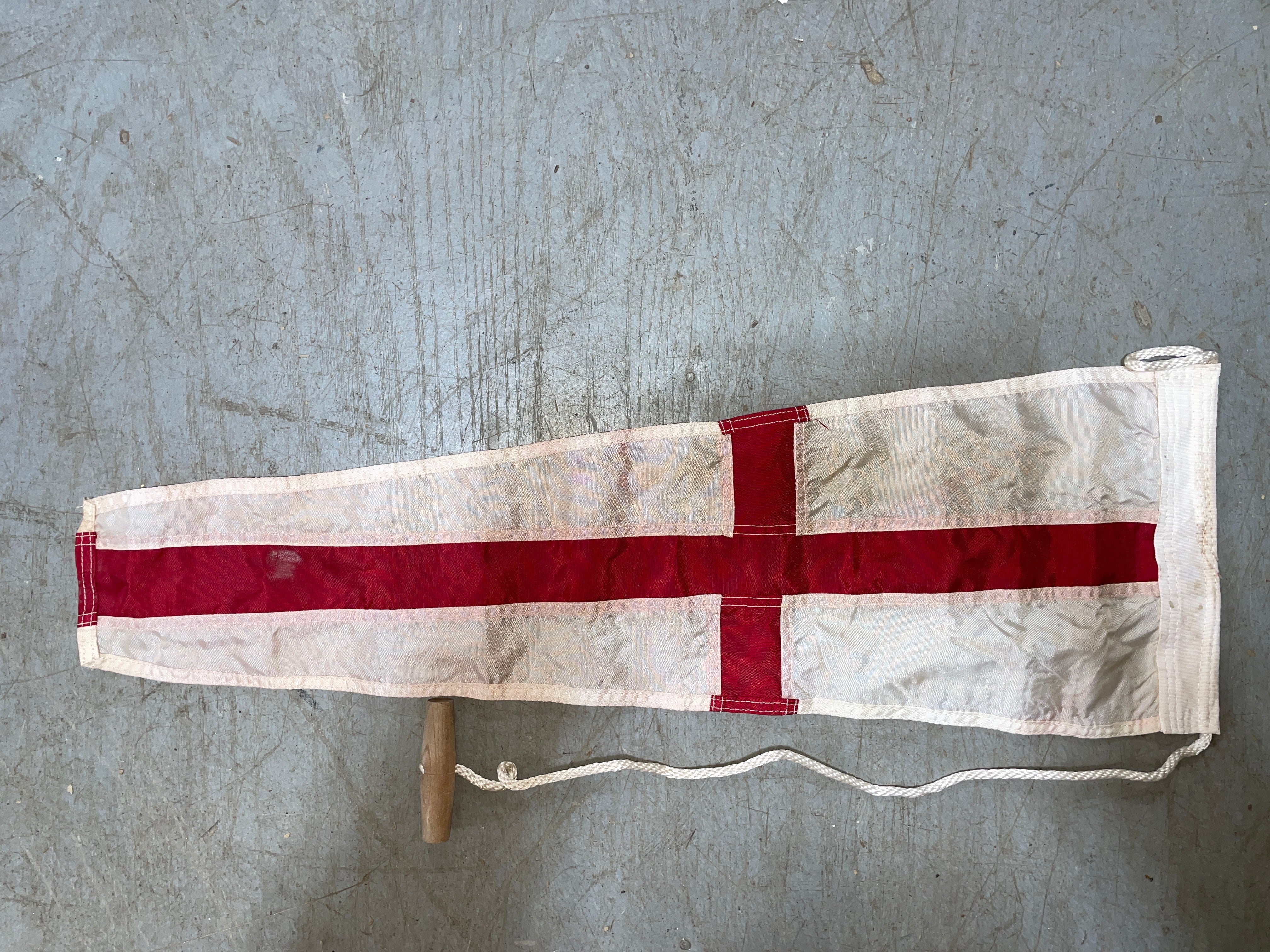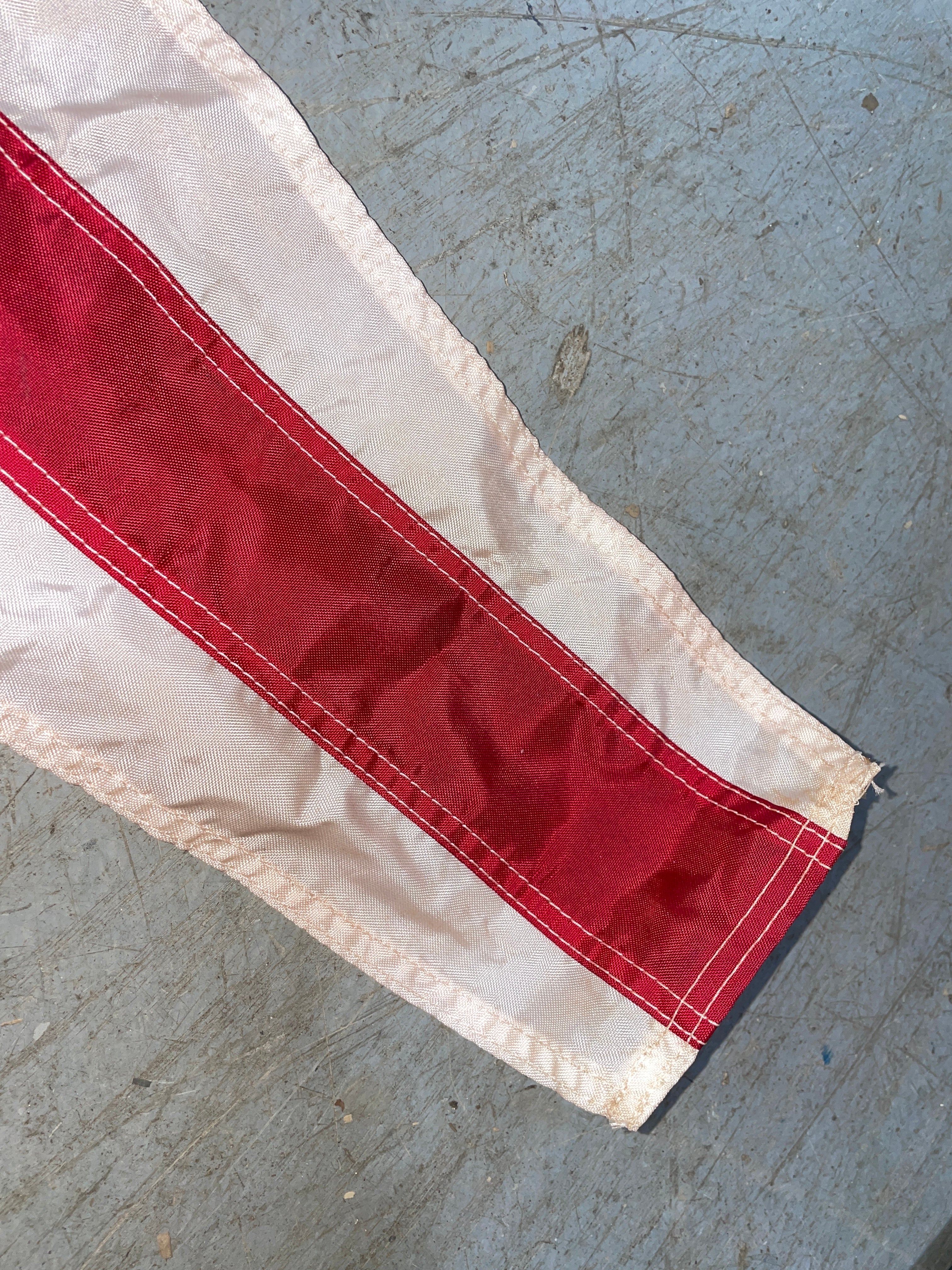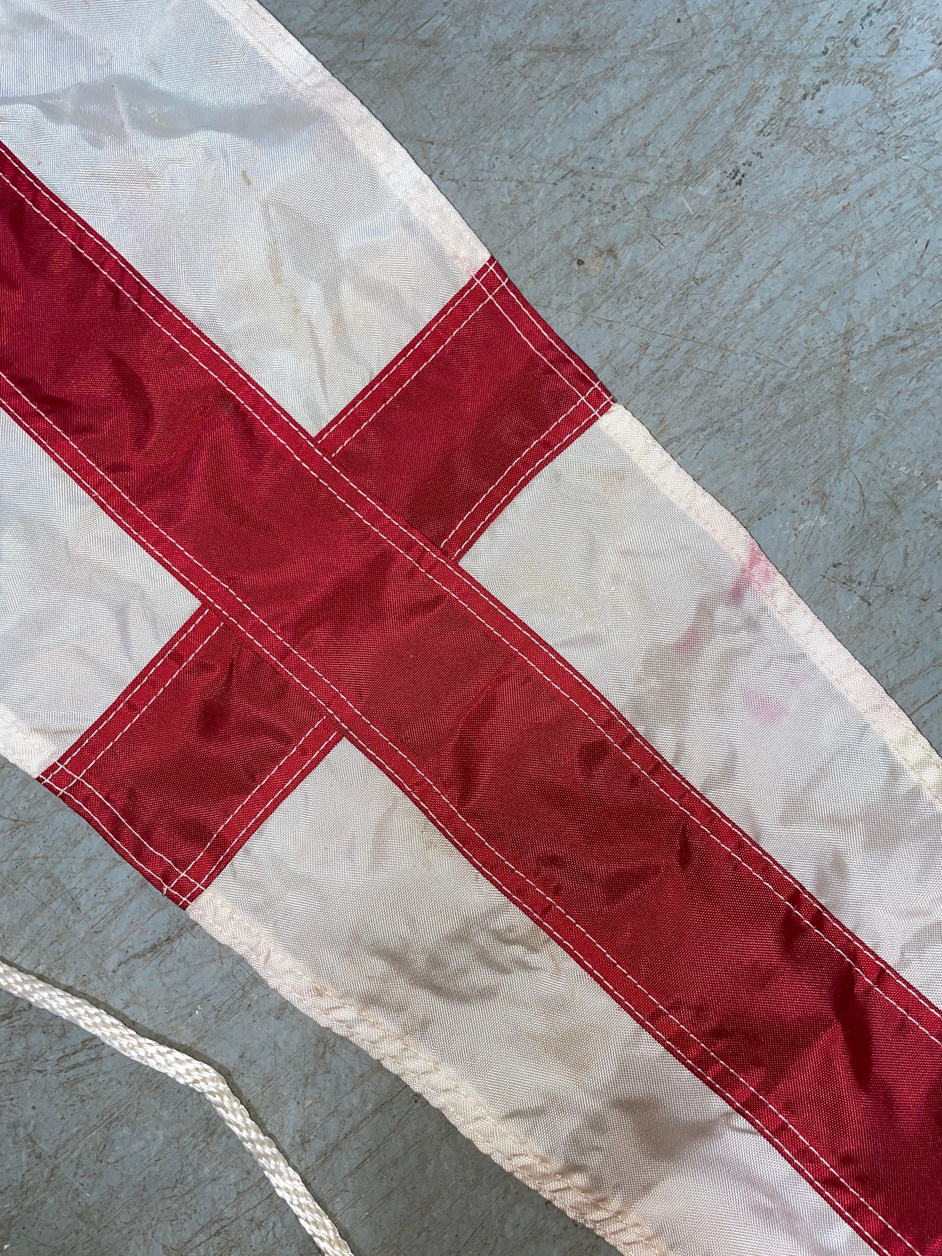 This Red Cross signal flag is in fair condition. Has color fading and some staining but overall fair condition. This is one we never get in! It measures 26" long x 8 1/2" wide.