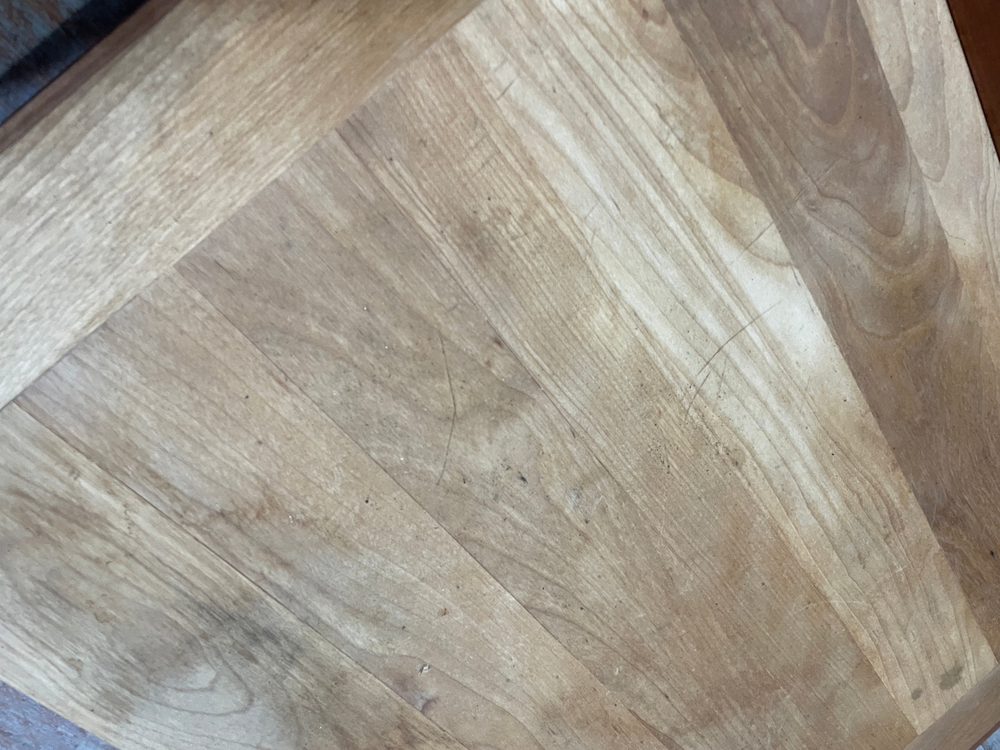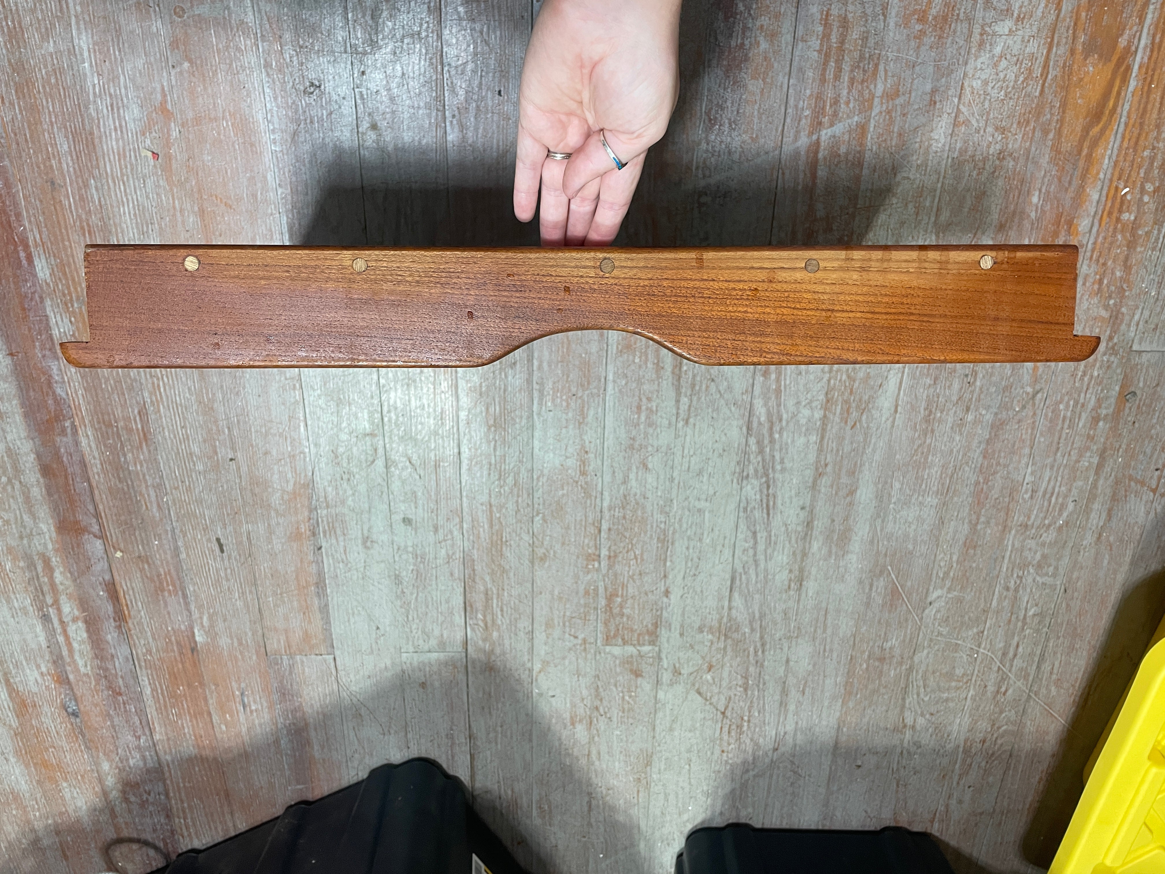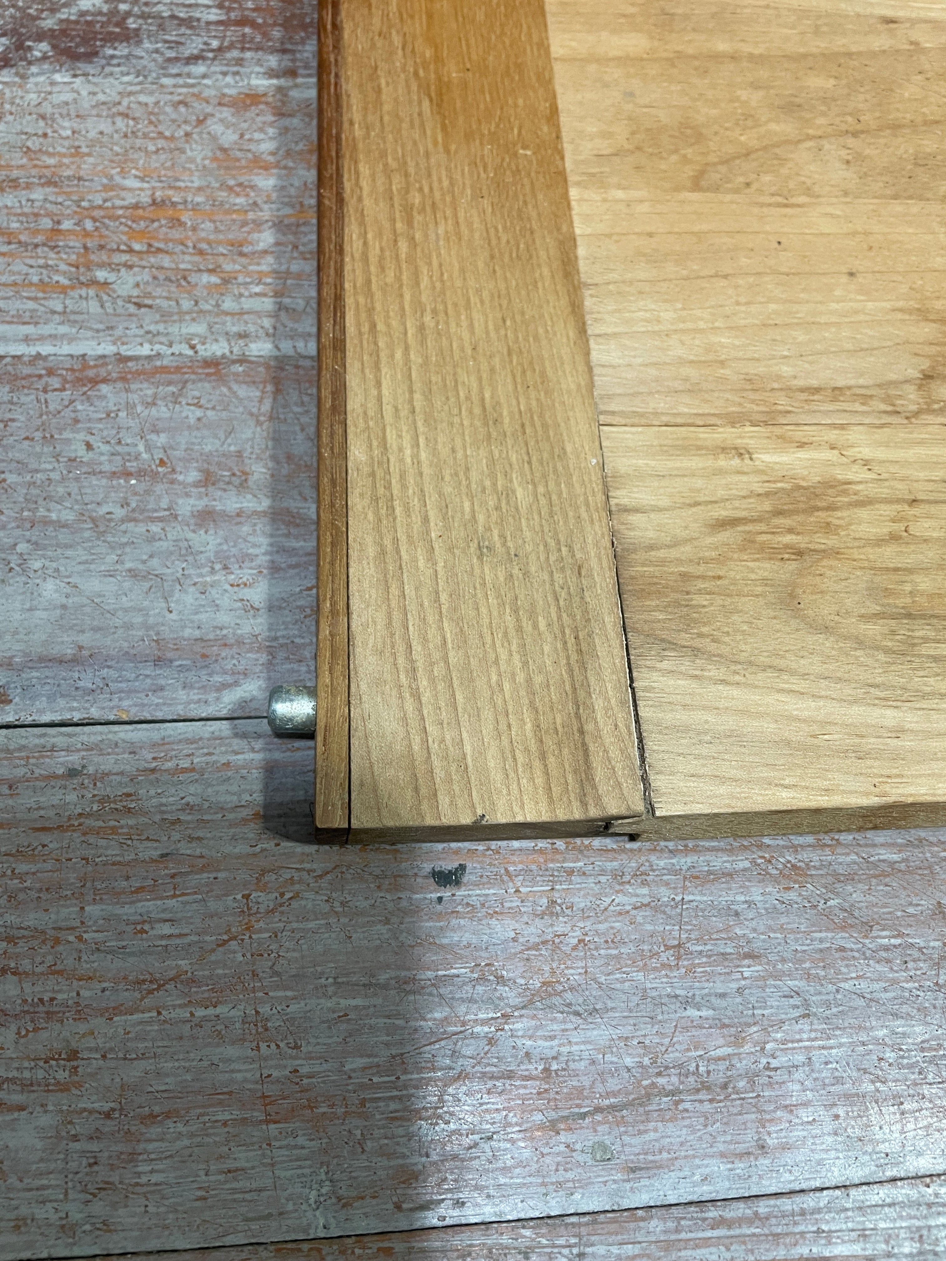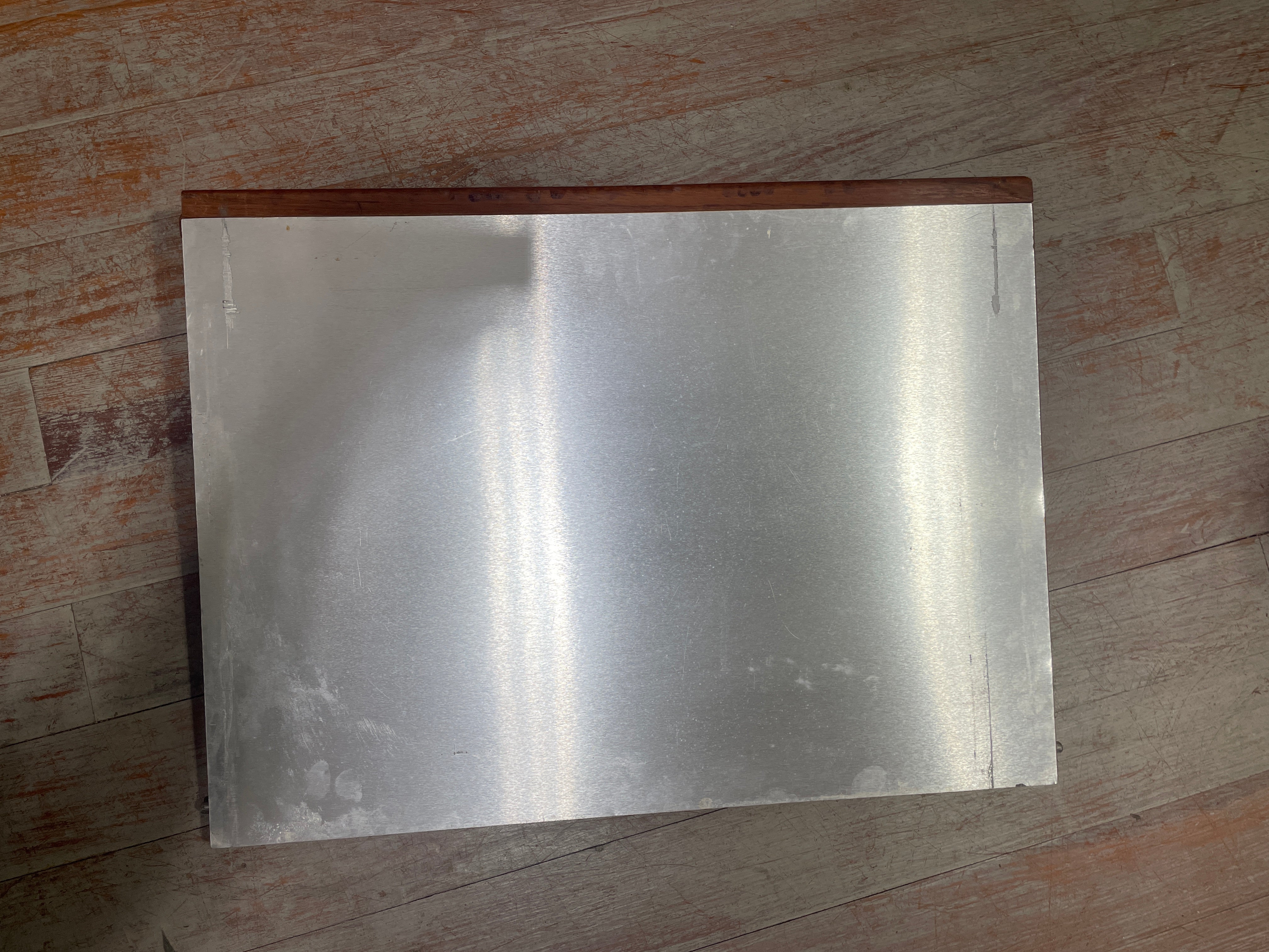 This oven topper / cutting board is in okay condition. The board is cracking at the bottom but it is secured onto a stainless steel plate. This piece measures 22 3/8" long x 17 5/8" wide x 5/8" thick. The face measures 22 3/8" long x 2 3/4" tall.