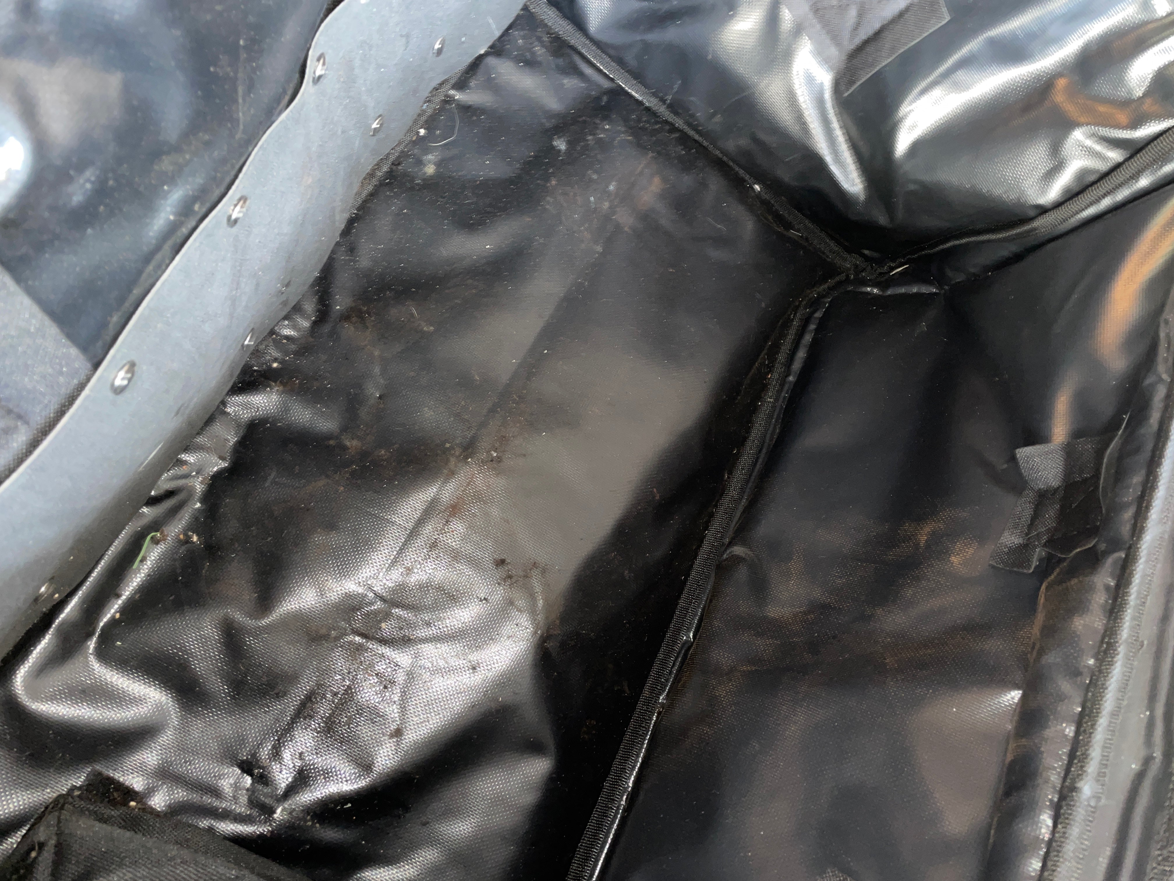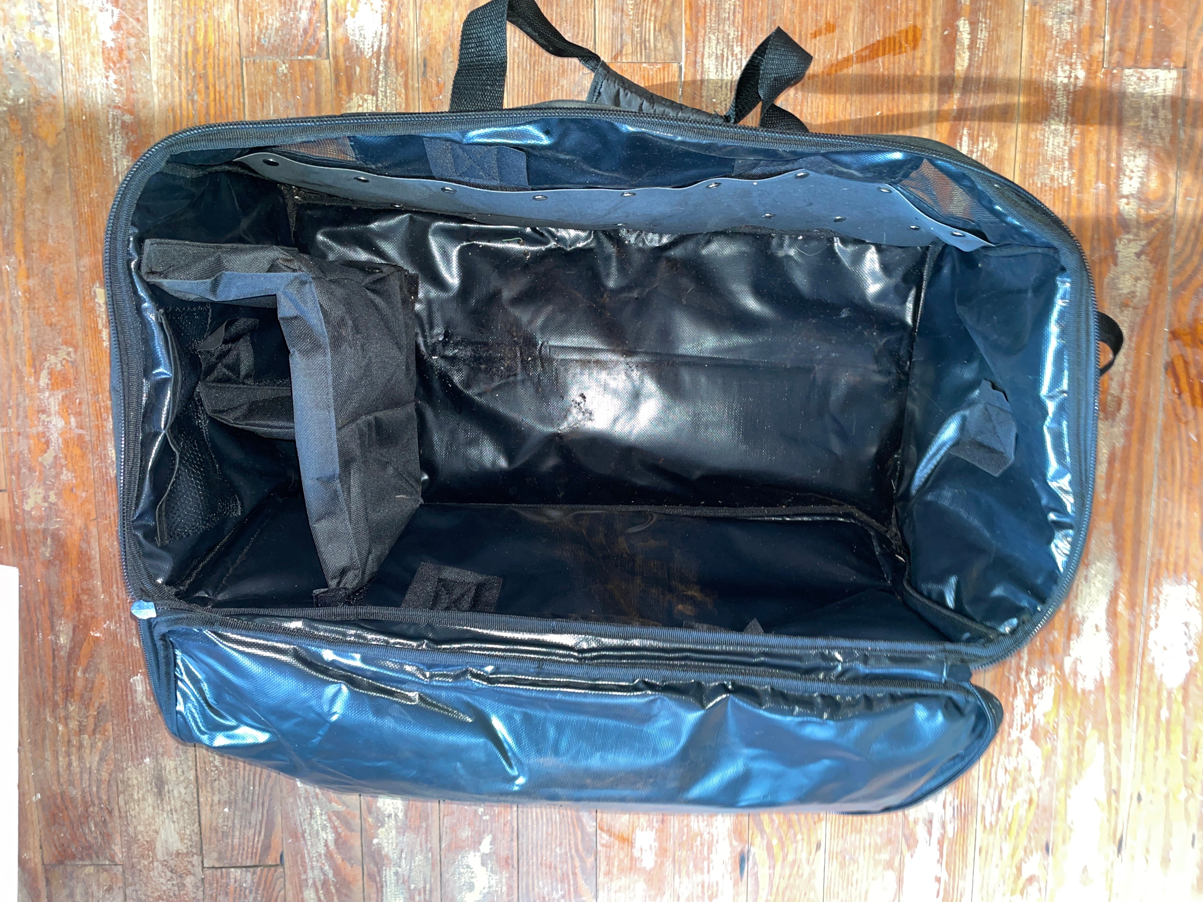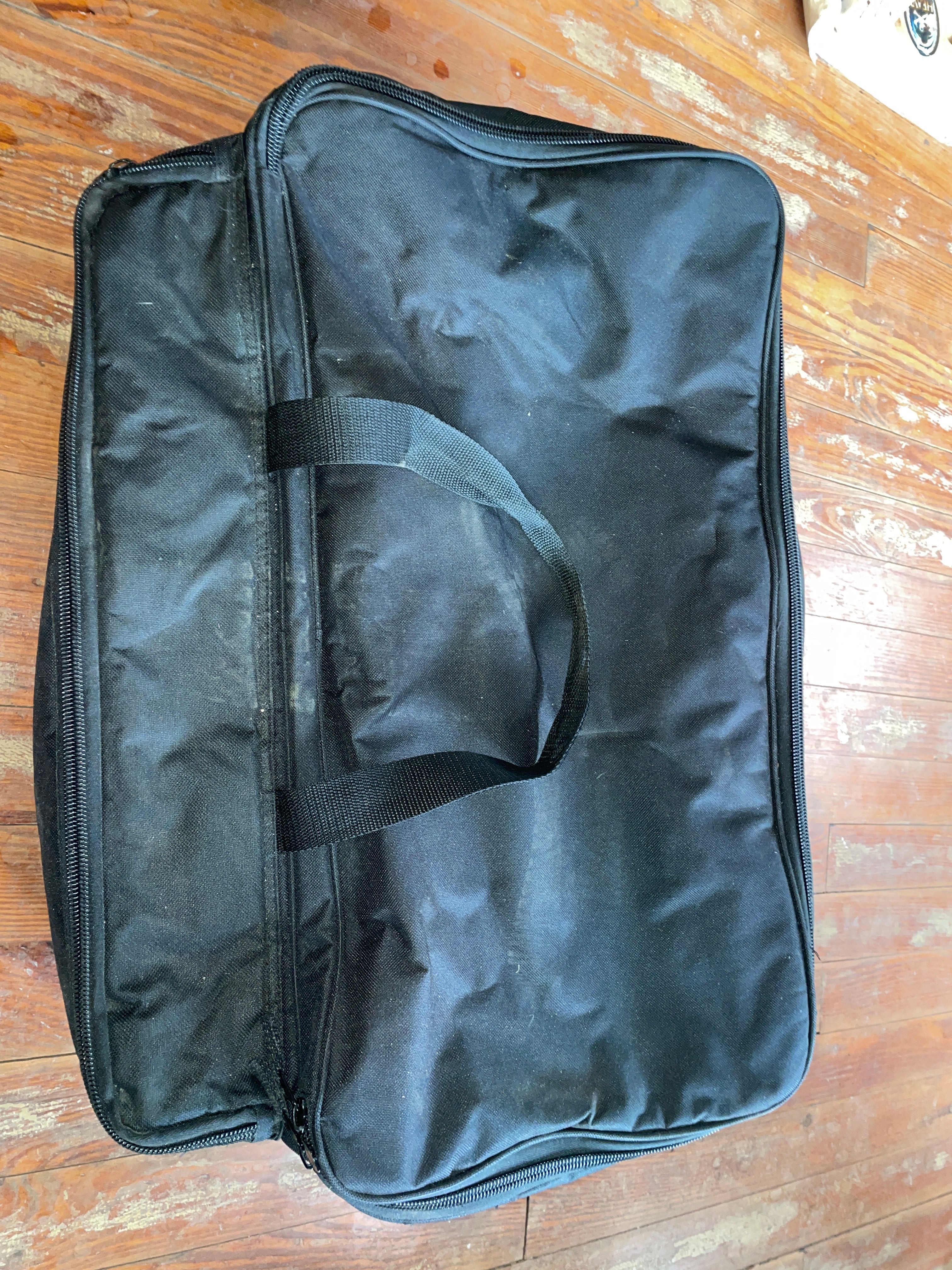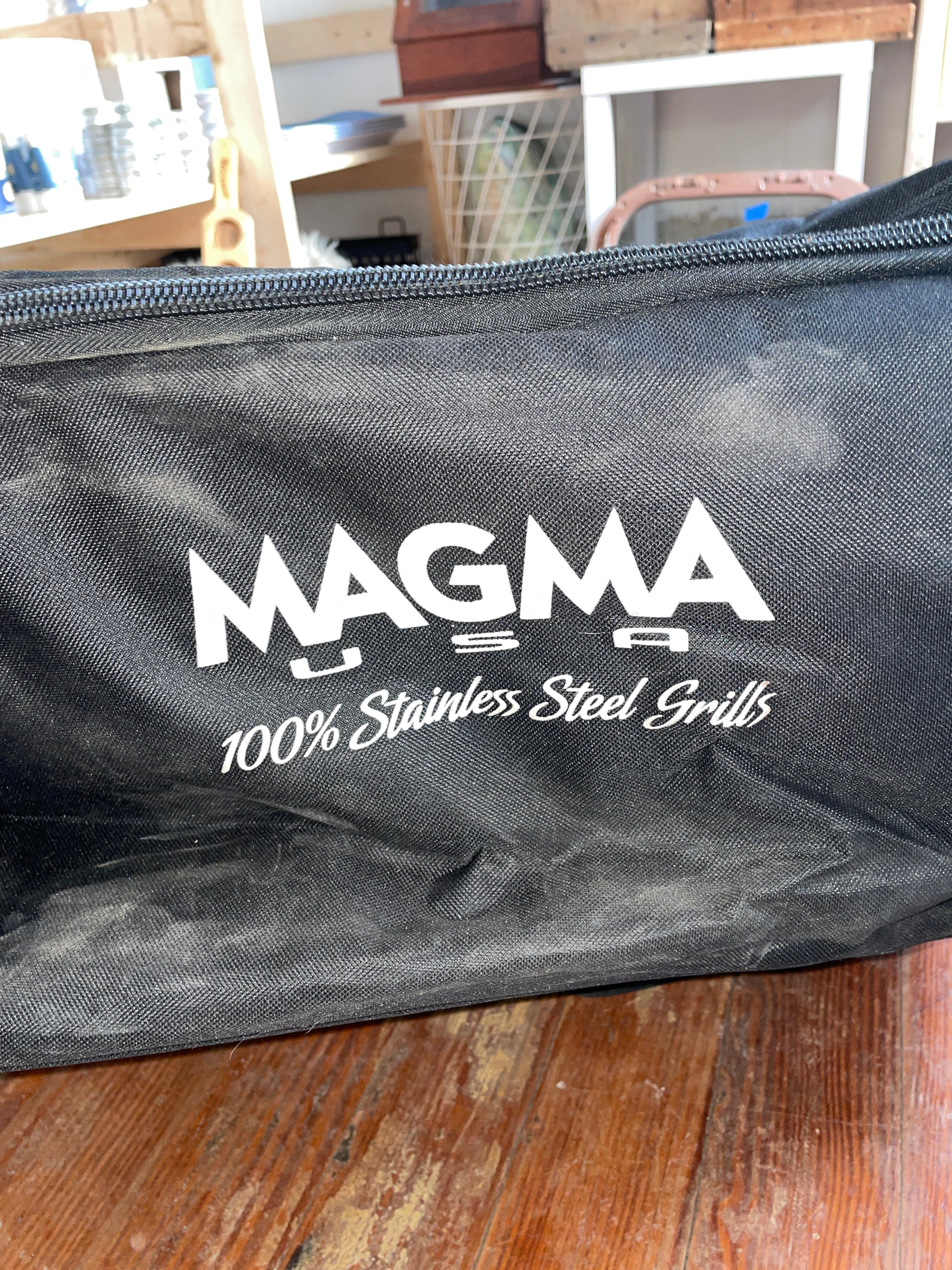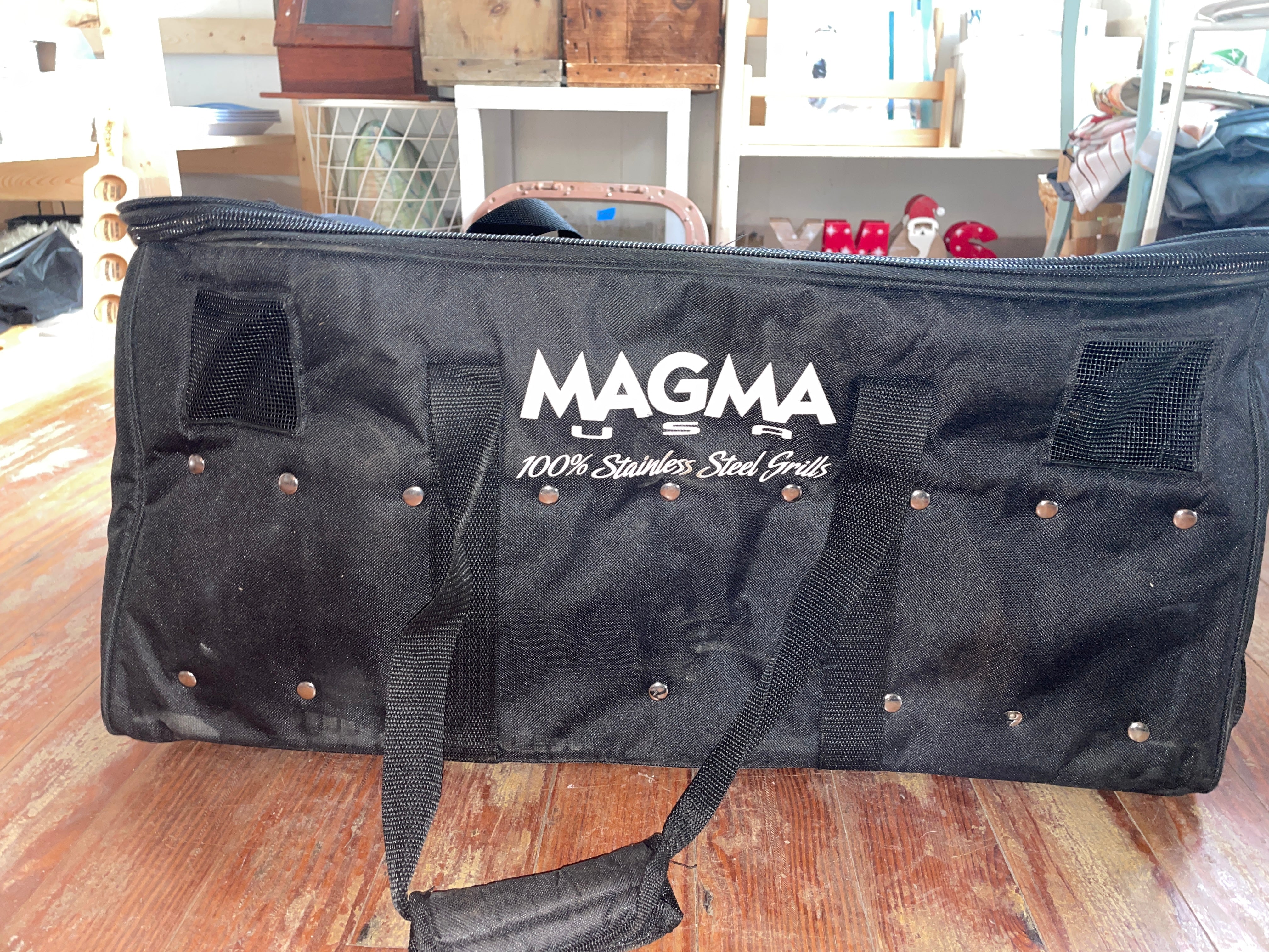 This padded magma grill carrying case is in like new condition (just slightly dirty). It fits most grills, has the side compartment inside for propane canisters. Also has a front pocket for carrying utensils and other handy things.