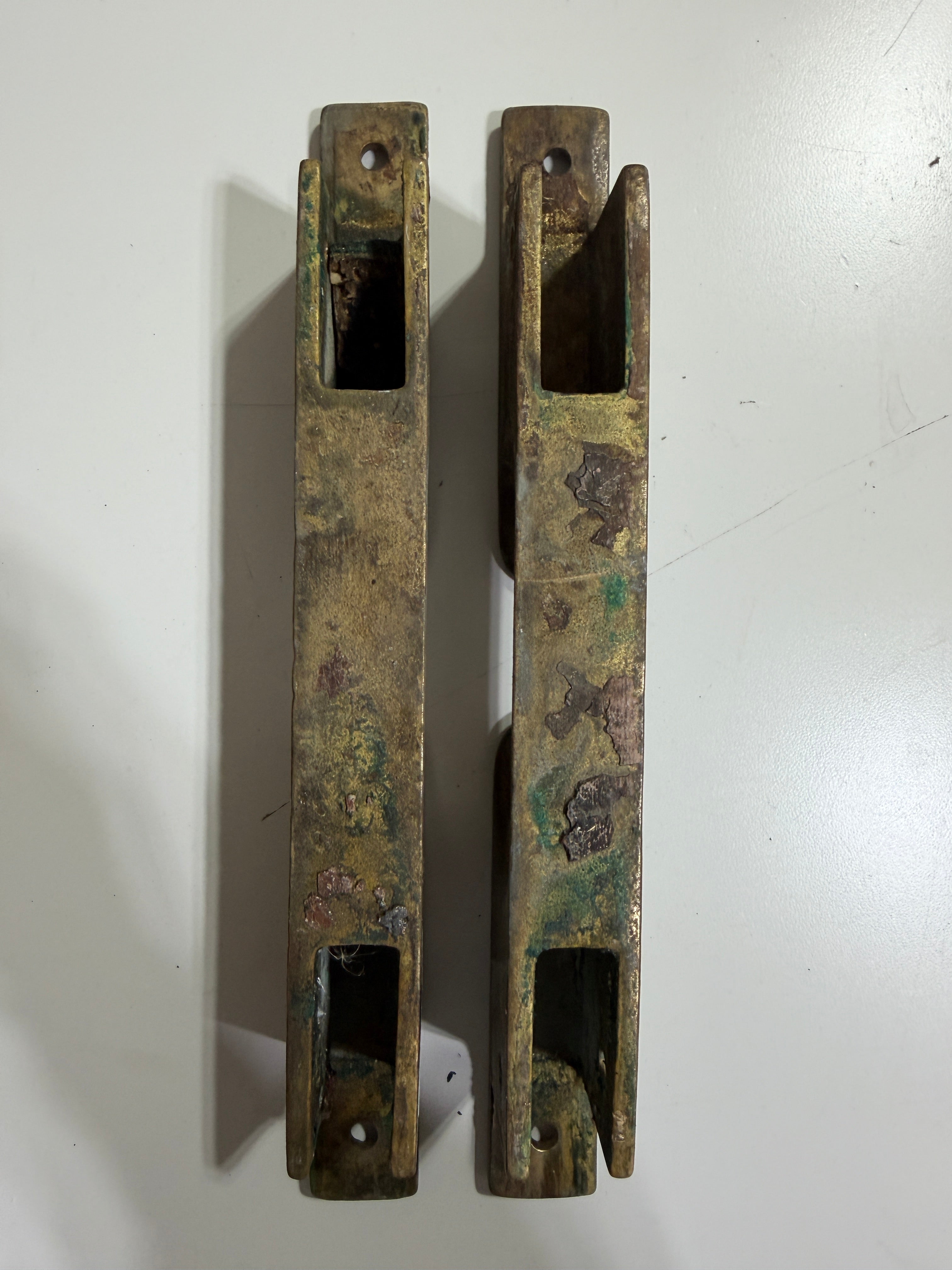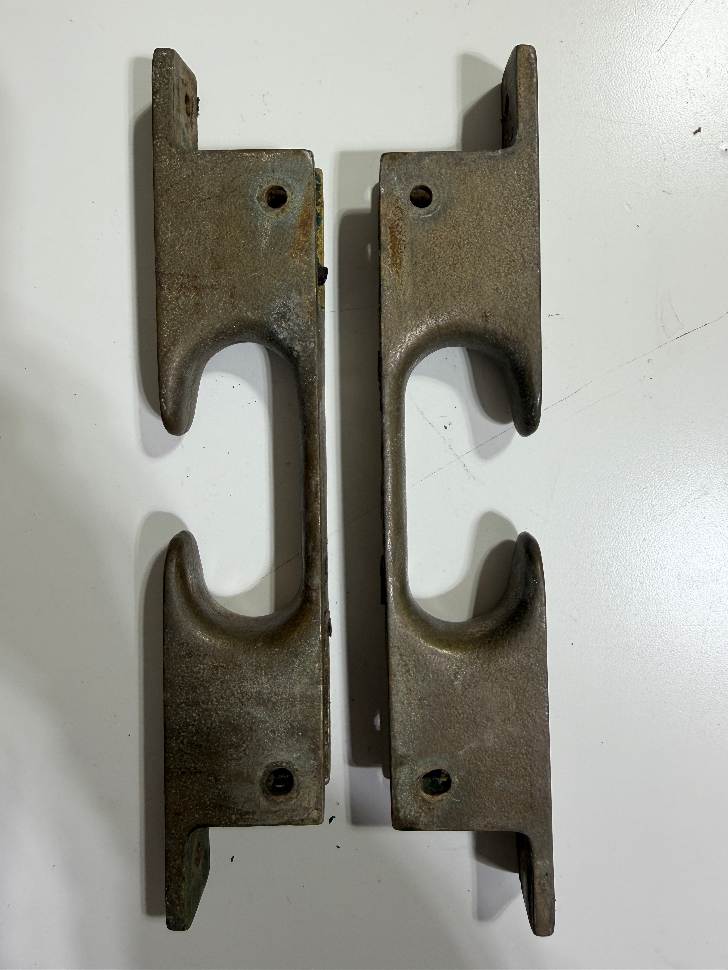 Pair solid bronze toe rail cleats. 10" total length. The area for it to mount into the siding is 5/8" width x 1 5/8" deep each way. The width for line is 1 1/8". Cleats stand 2" tall.