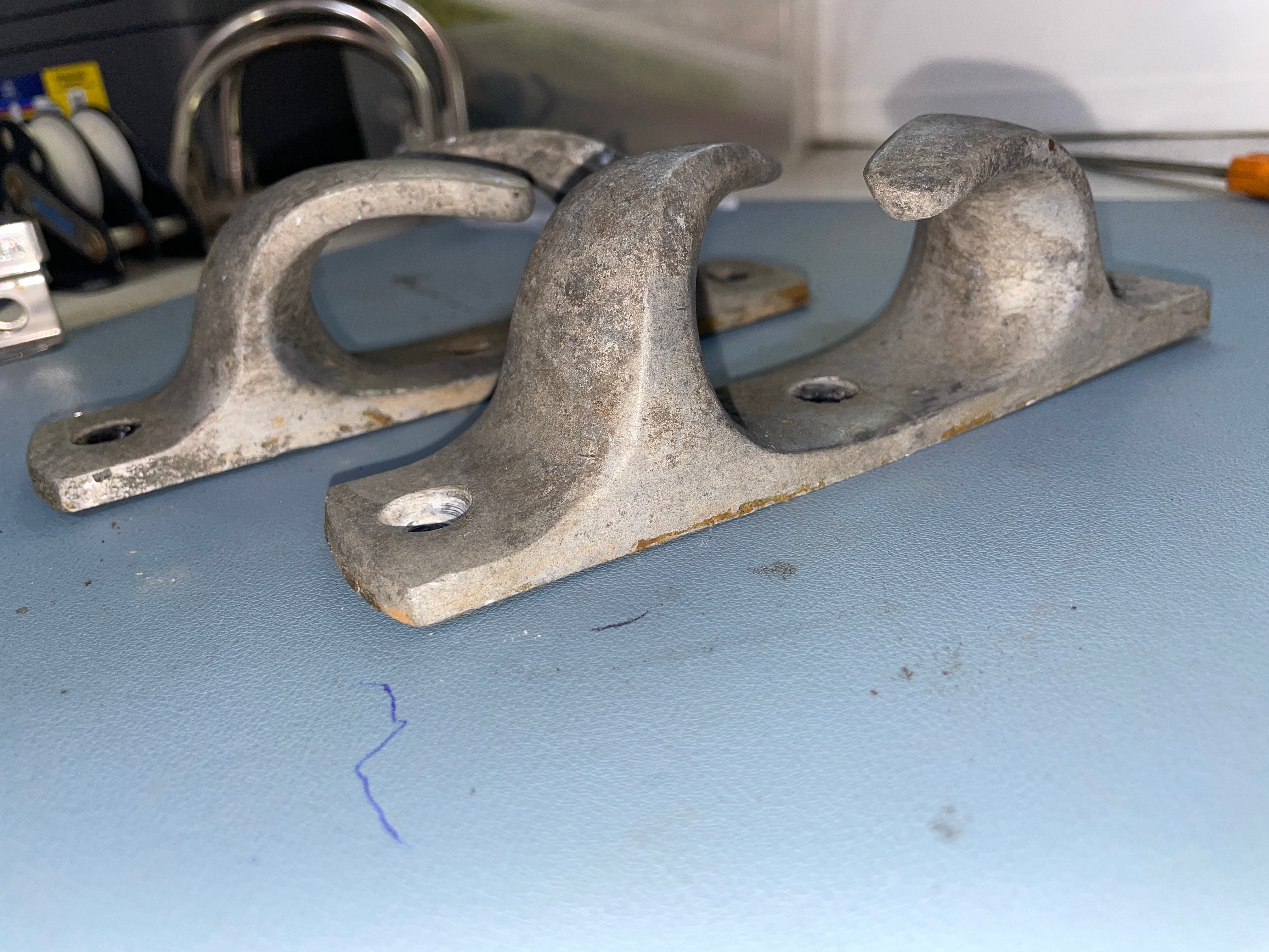 This pair of aluminum chock cleats are in good condition. Usual scratching from use. The cleats are 7" total length. The width for line is 7/8". The base is 1 5/8" diameter and stands 2" tall. The 3 screw install is 2 7/8" apart.