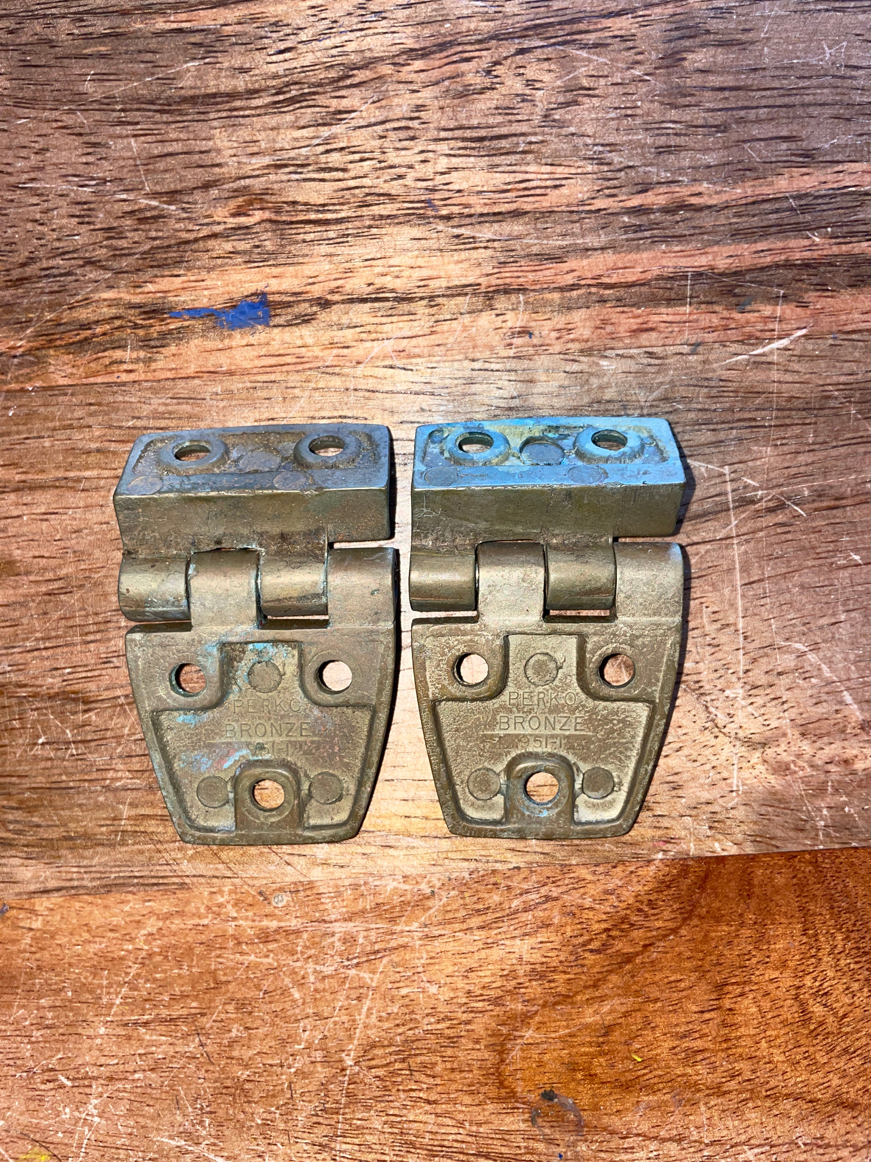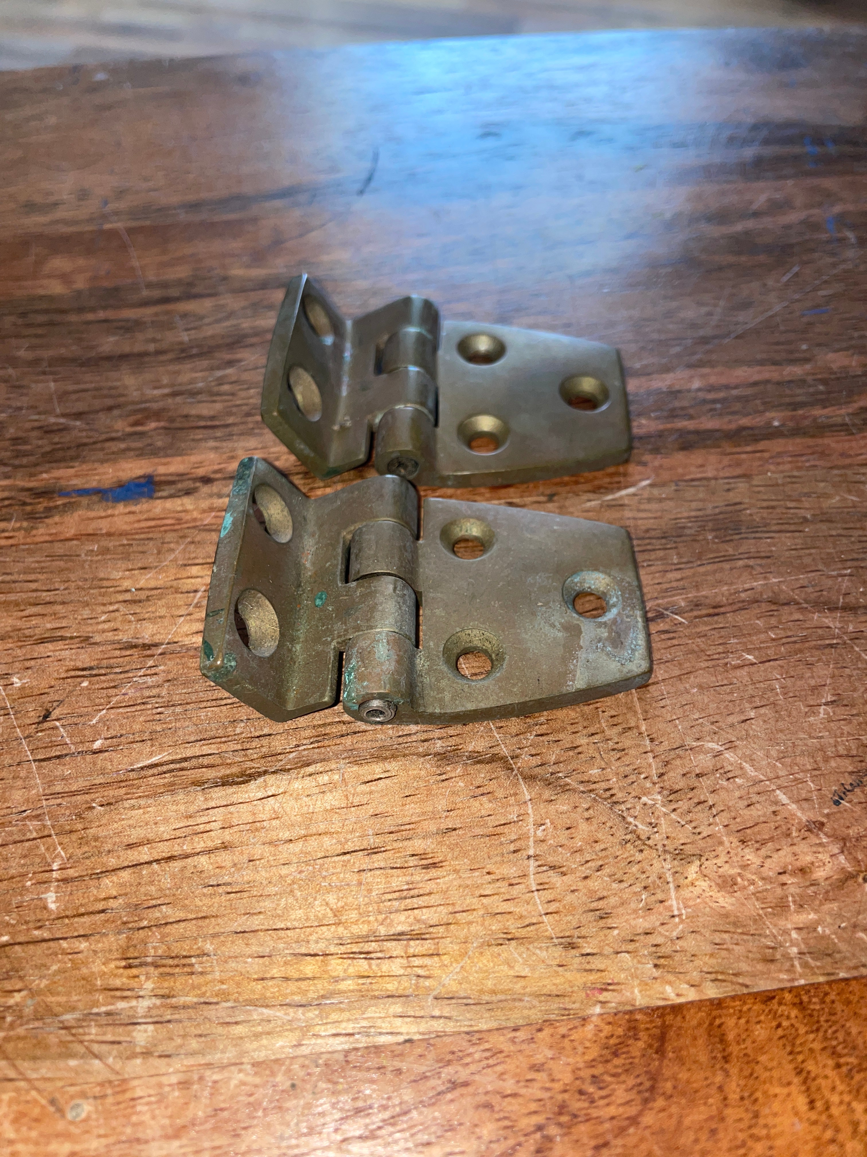 This pair of hinges are in great condition. A little stiff but they do work as should. Measurements included in photos. The screw pattern for the top part is 3/4” apart. The triangle screw pattern is 3/4” x 7/8”.