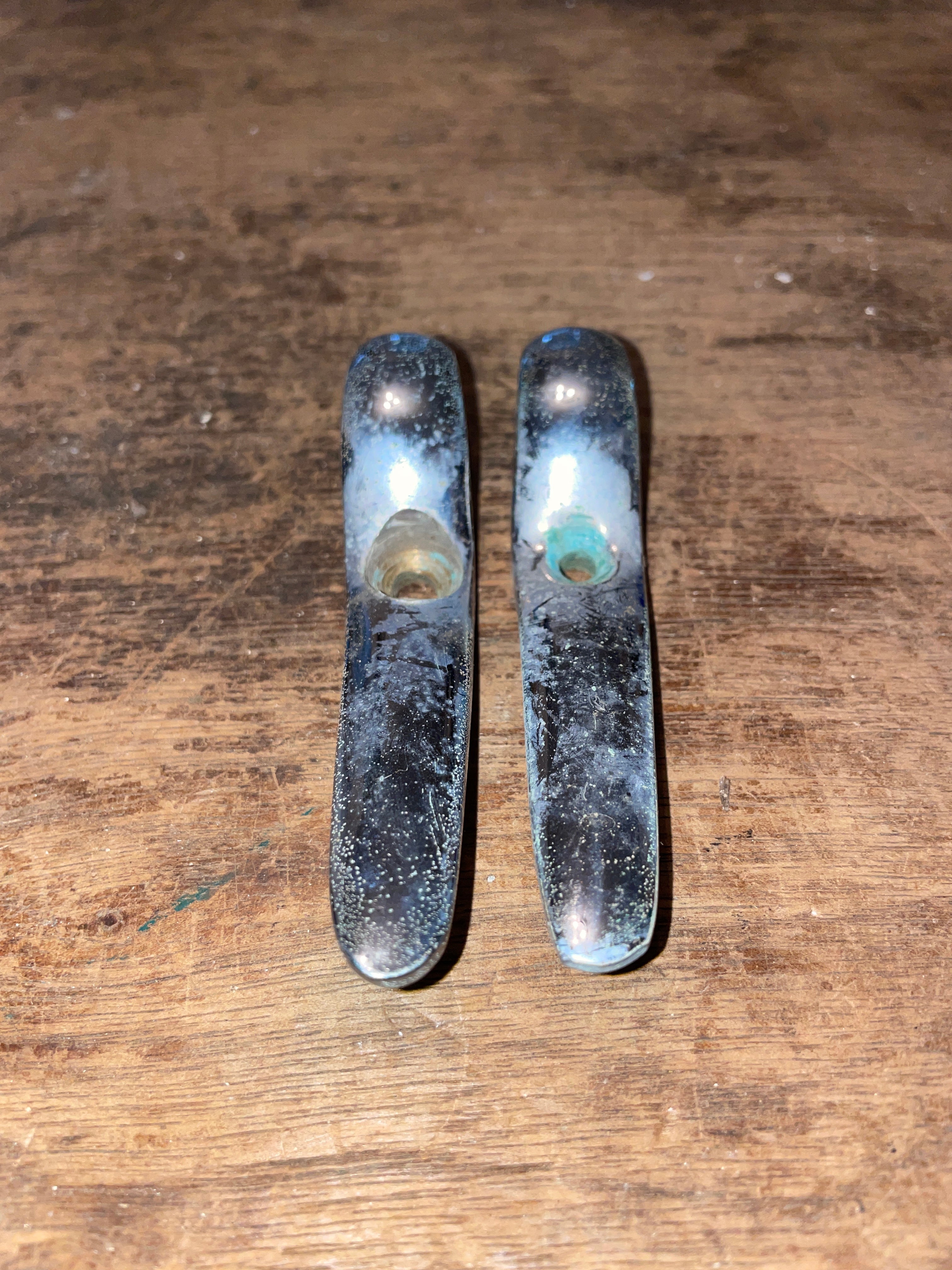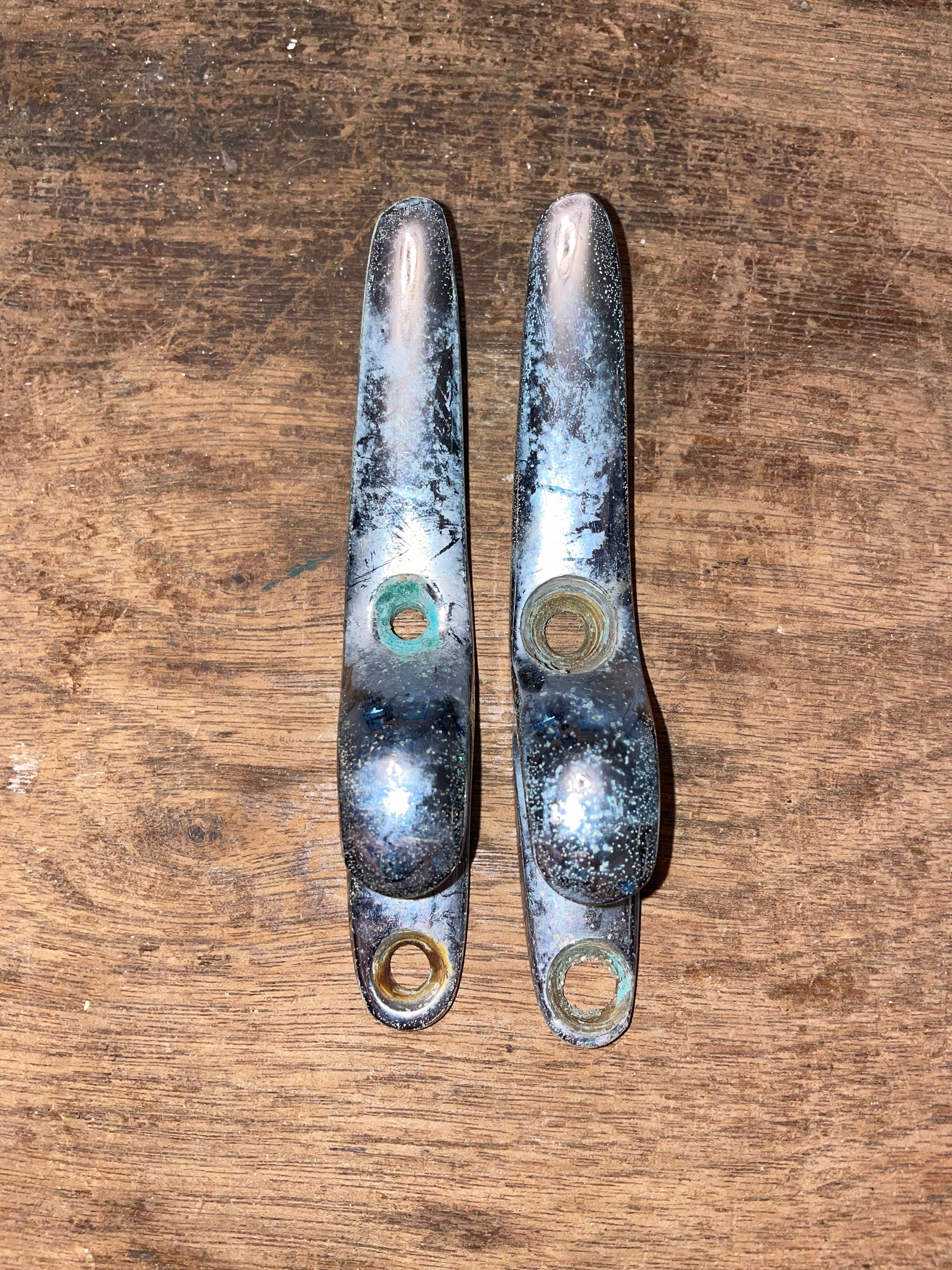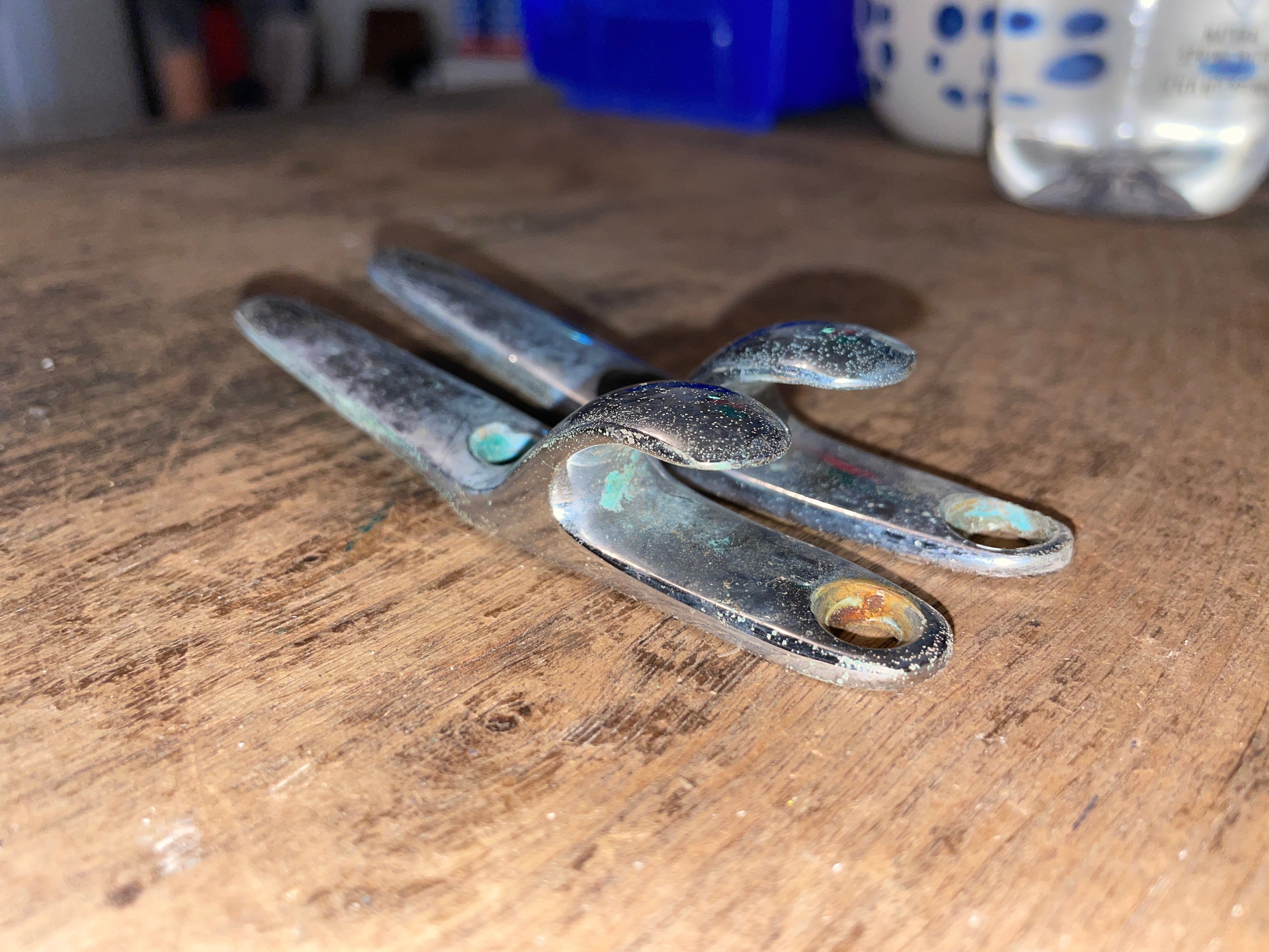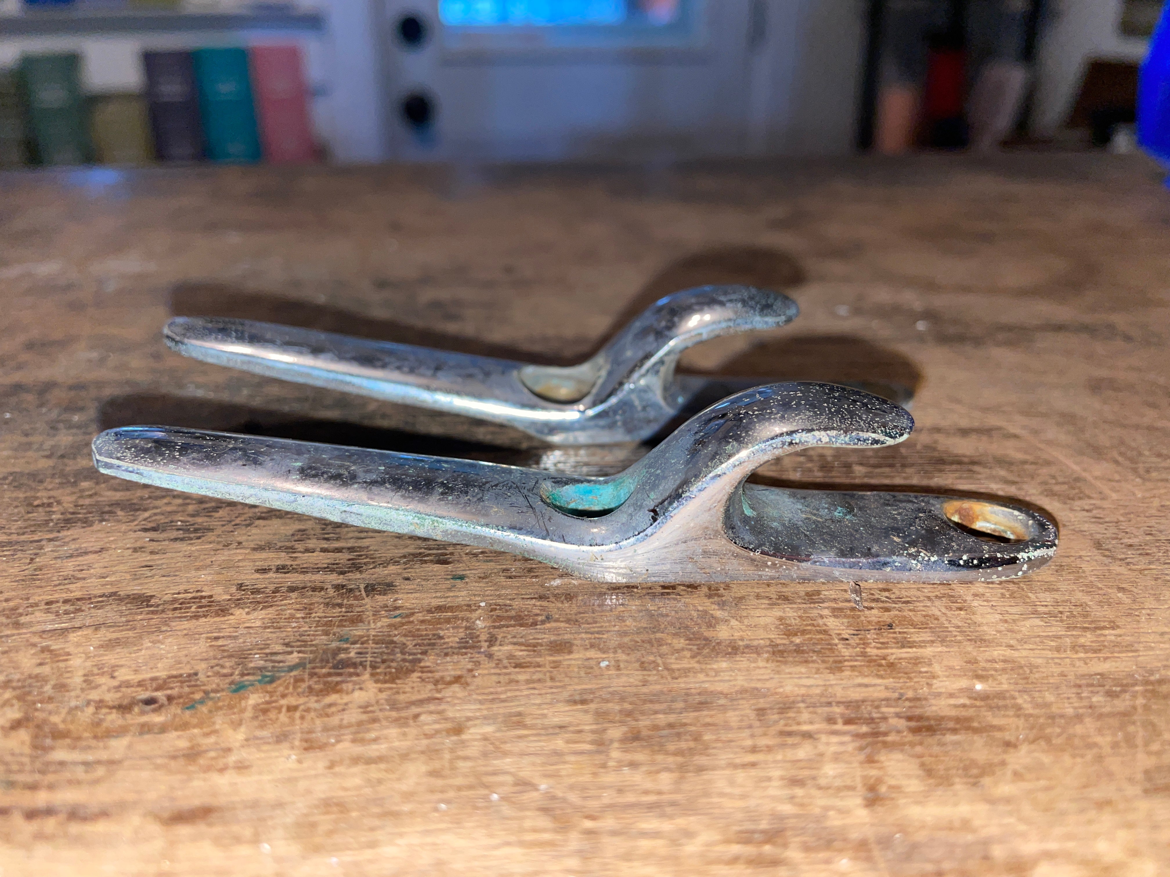 This pair of stainless steel jam cleats are in good condition. They measure 4 3/8” total length. They have a 7/16” width between the cleat. They are angled at the end, 2 bolt install. 1 of the cleats has had the bolt hole widened. They are losing their shine but should clean up nice.