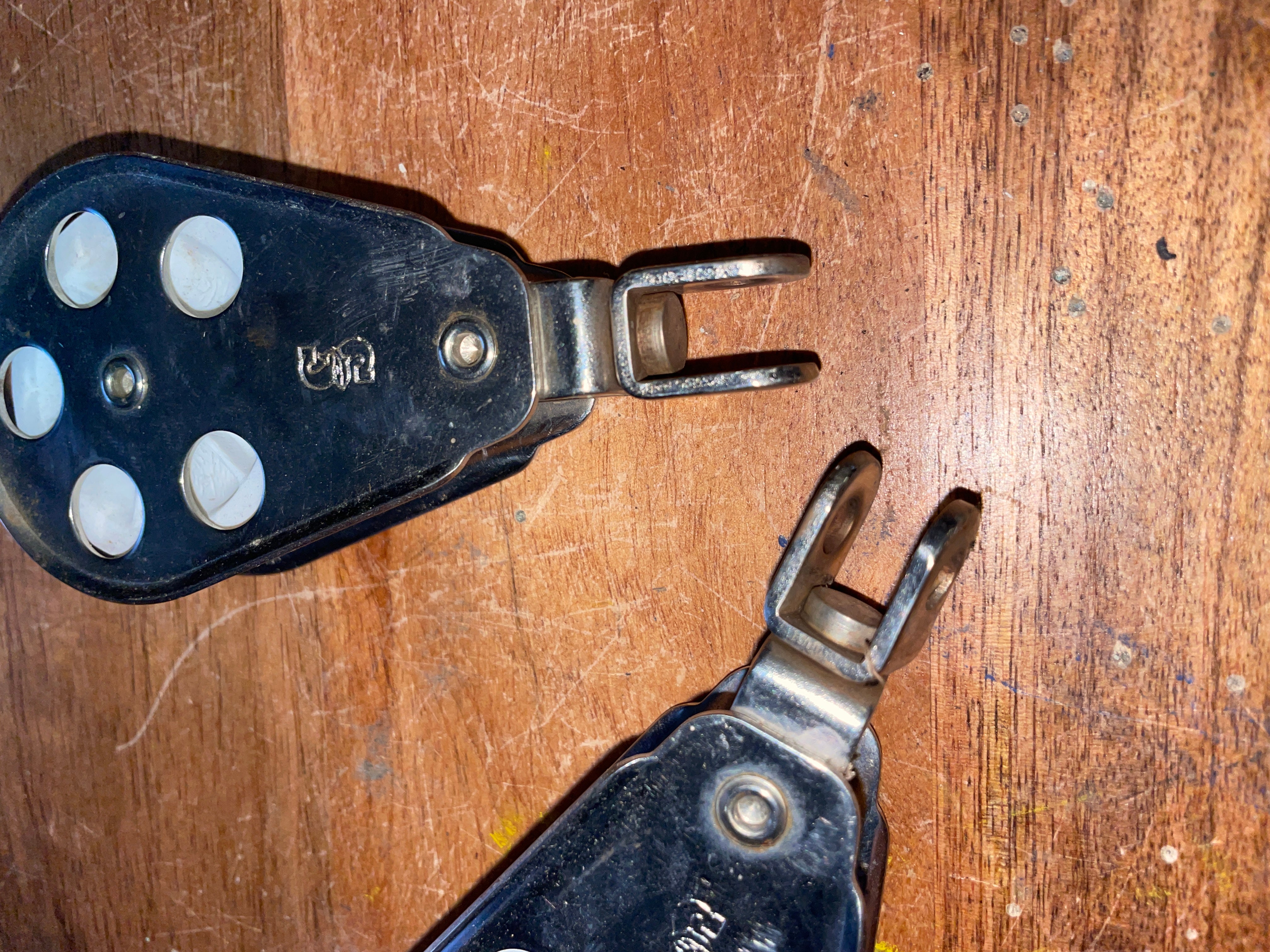 This pair of Schaefer single swivel blocks are in good condition. The sheaves are 1 7/8” diameter and can fit MAX 7/16” line diameter. The top area for a shackle to be added is 5/8” wide and requires a 1/4” pin diameter. The block body is aluminum with the plastic sheave. Total length of the block is 4 3/8” long.