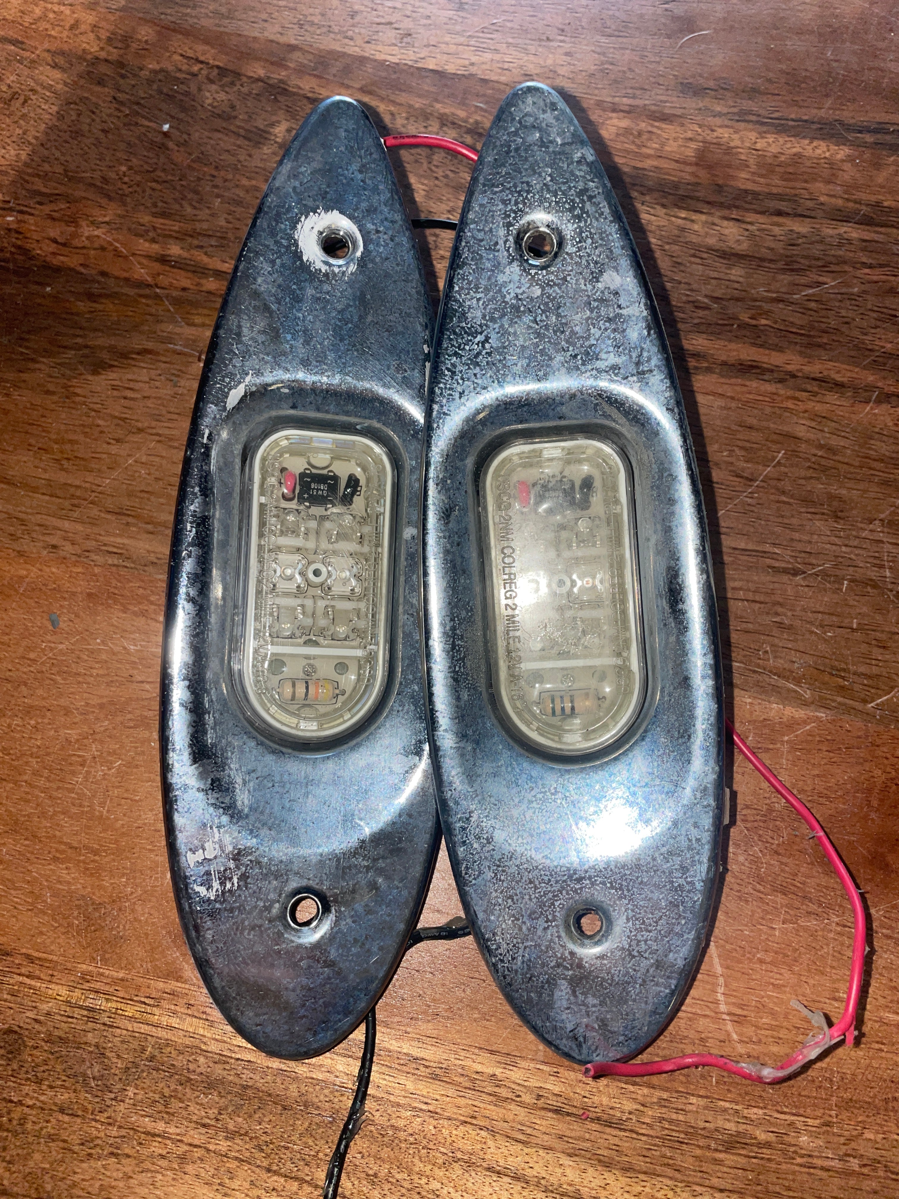 This pair of stainless steel navigation lights are in good condition. Look to have LED replacements for the bulbs. 2 wire install. These measure 7 3/4” long x 2 3/8” wide. They are 12VDC.