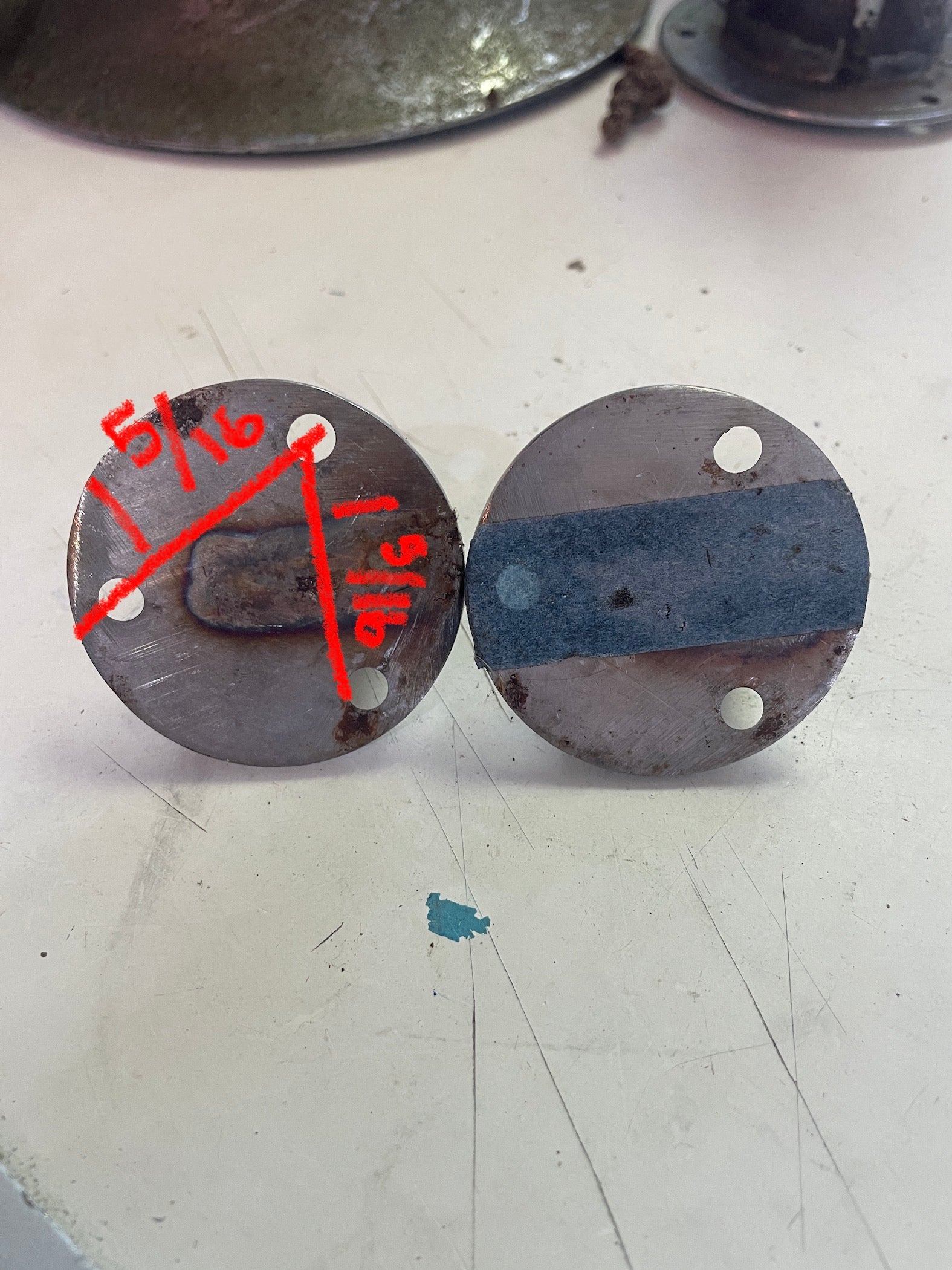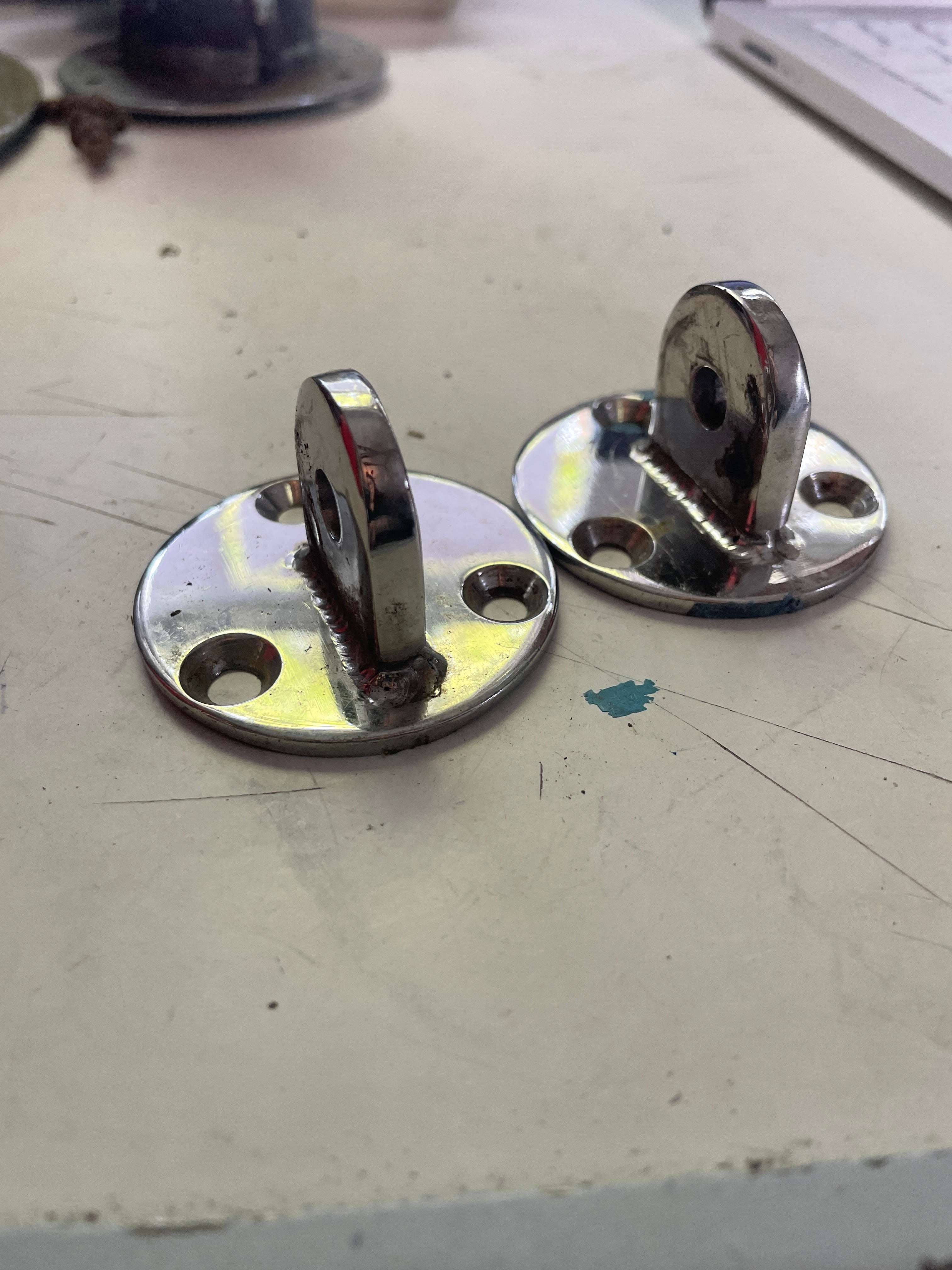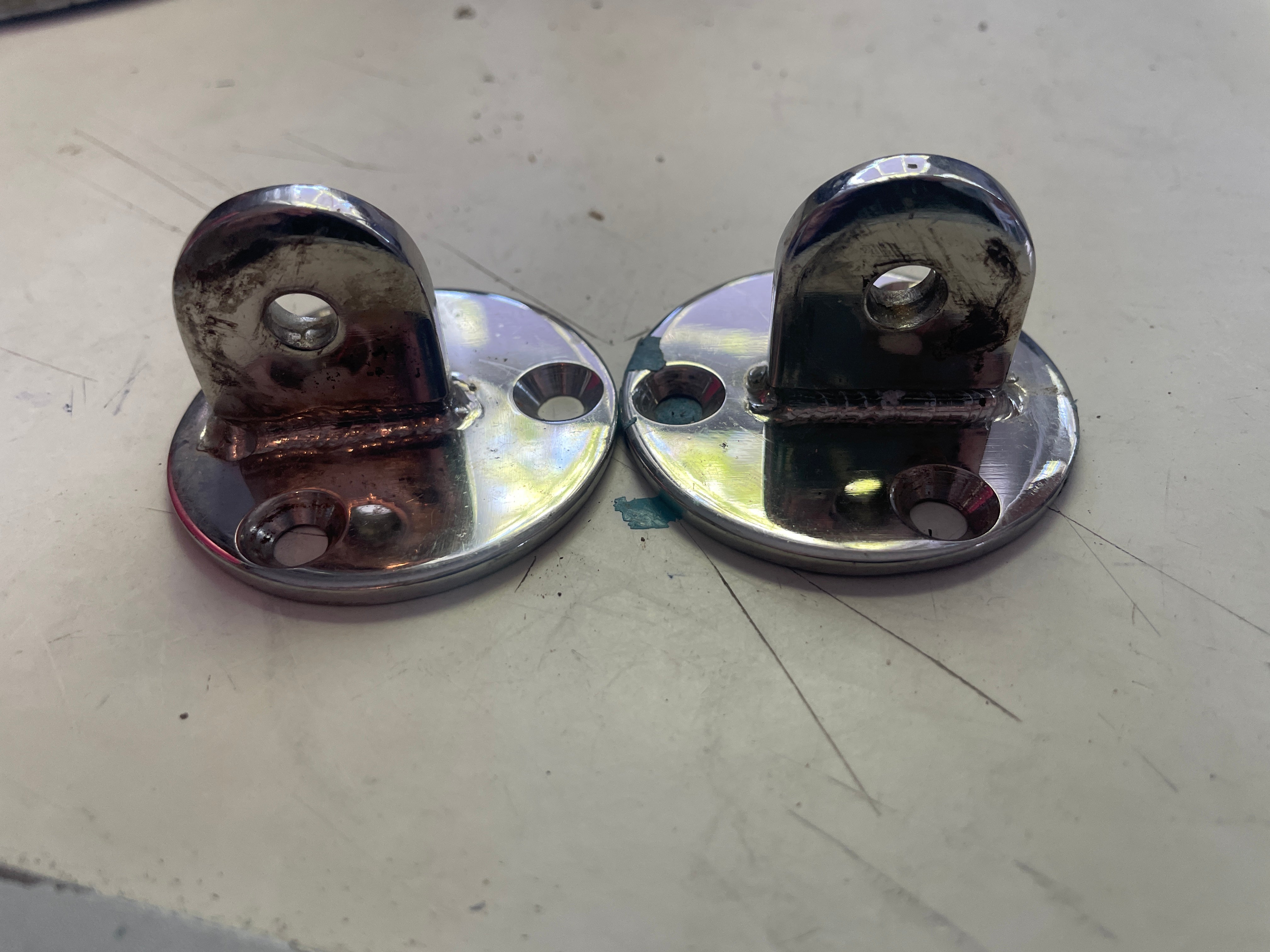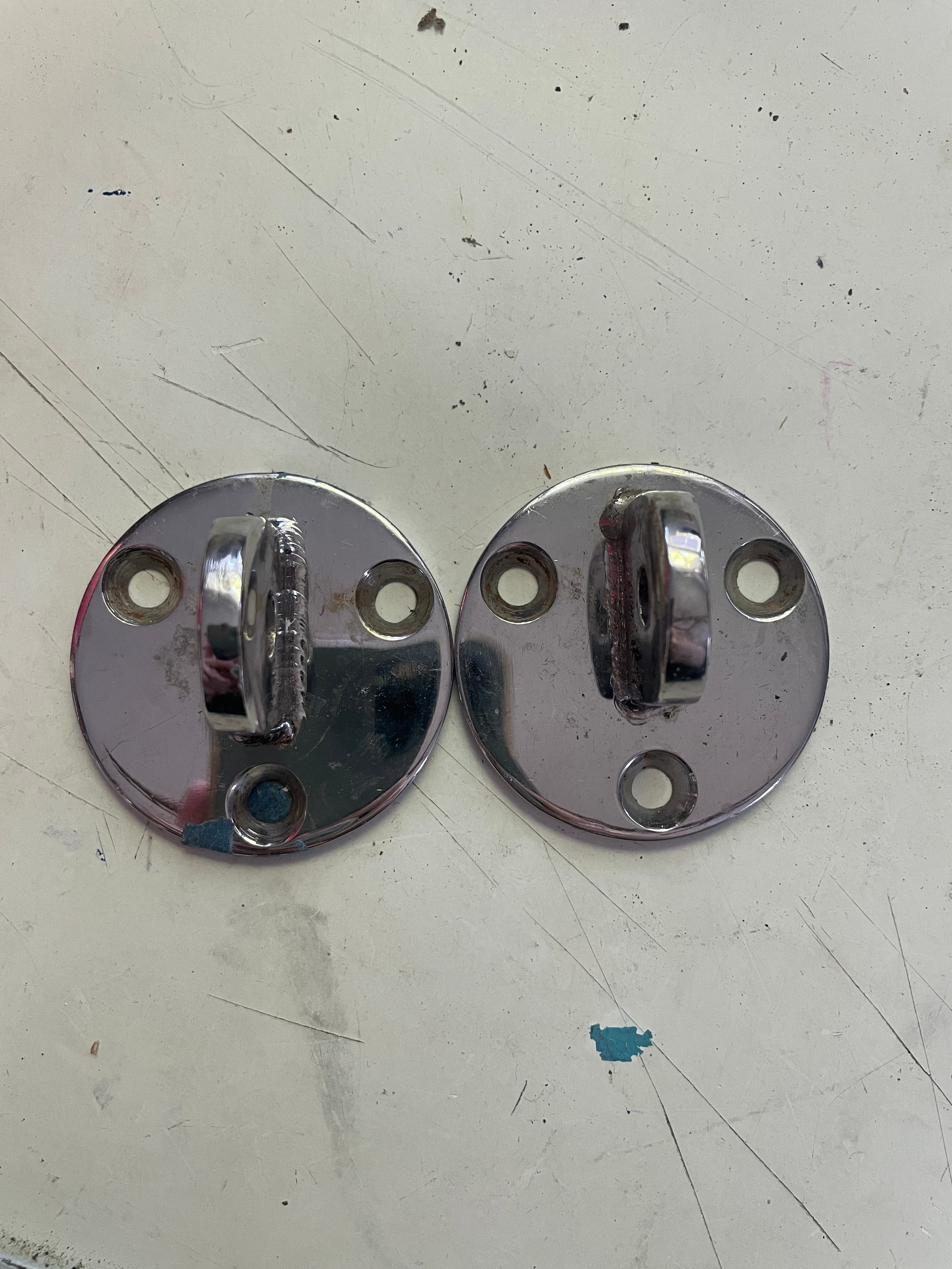 Pair of stainless steel fittings. These are 2” diameter at the base. They have a 3 screw install pattern that is 1 5/16” apart. The center mounting hole is 1/4” diameter.