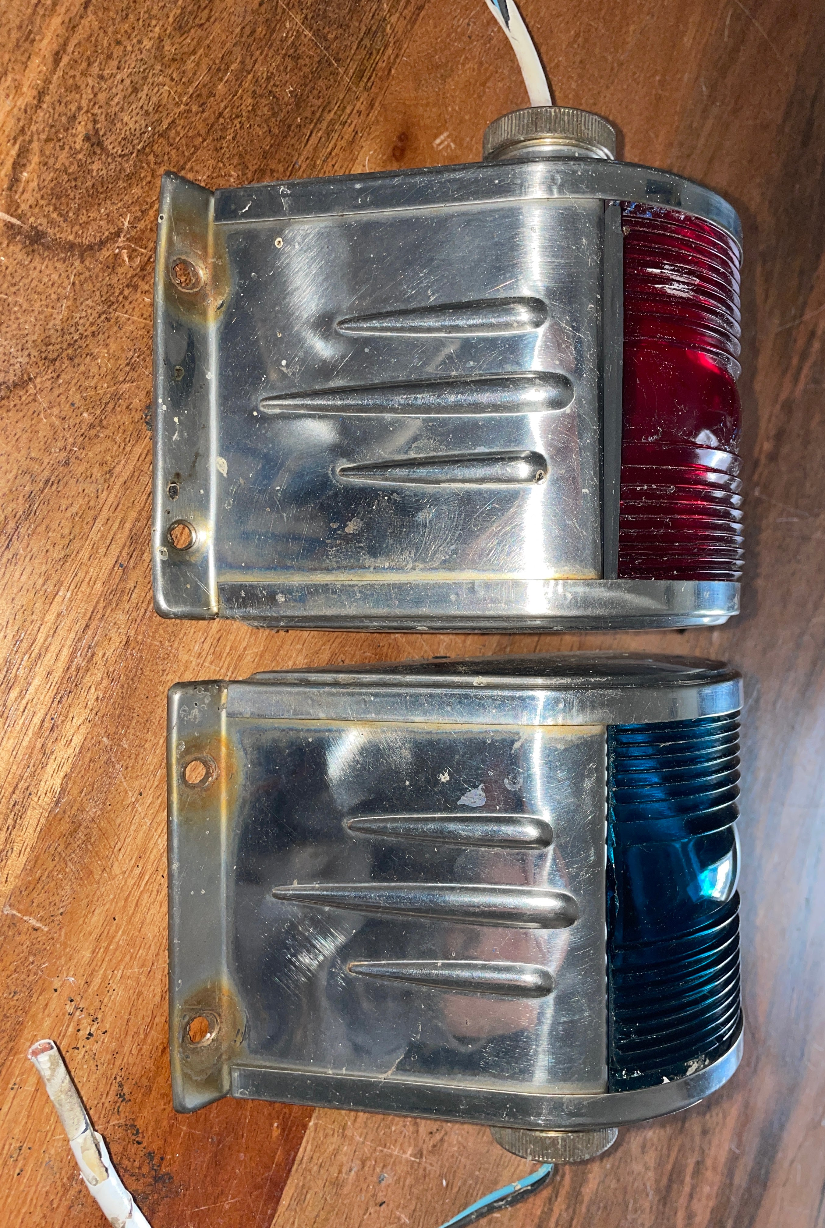 This pair of navigational lights is in great condition. The lens are glass. There are some slight chips but the glass overall is solid and should not crack further. The stainless bodies are in good condition. These lights measures 6” long x 3 3/4” wide. 2 wire install. These are model 0-5993 and 0-5994.