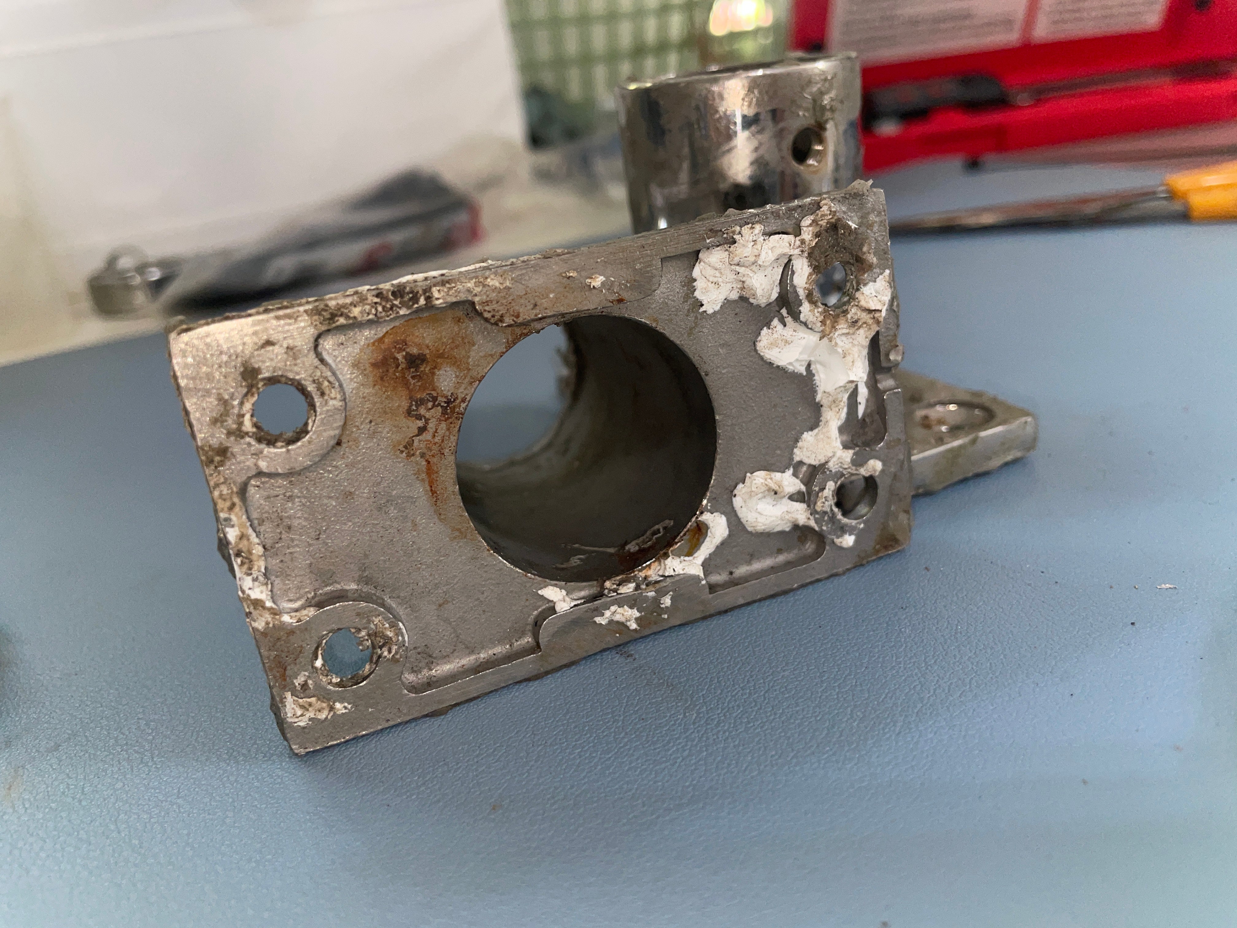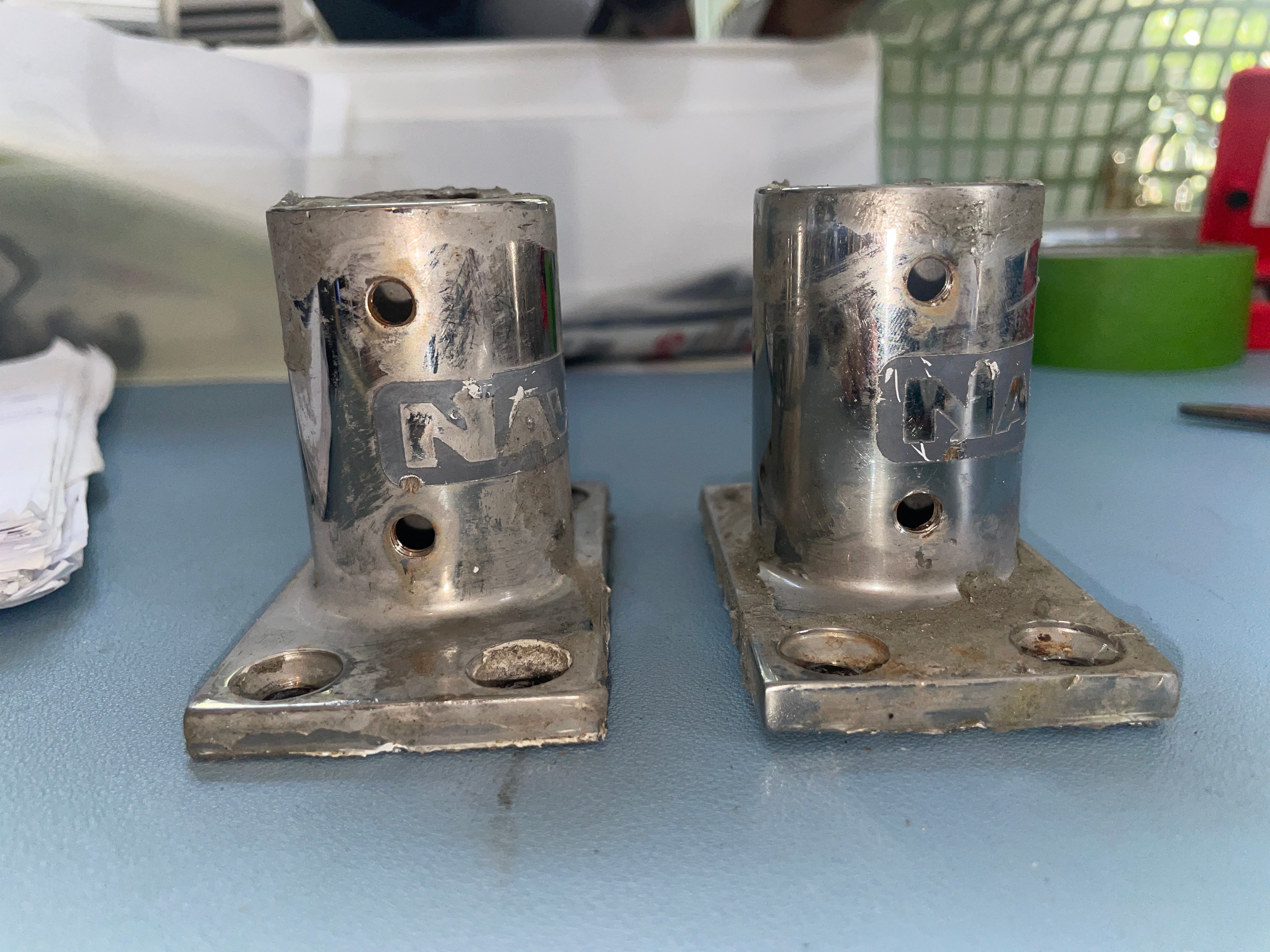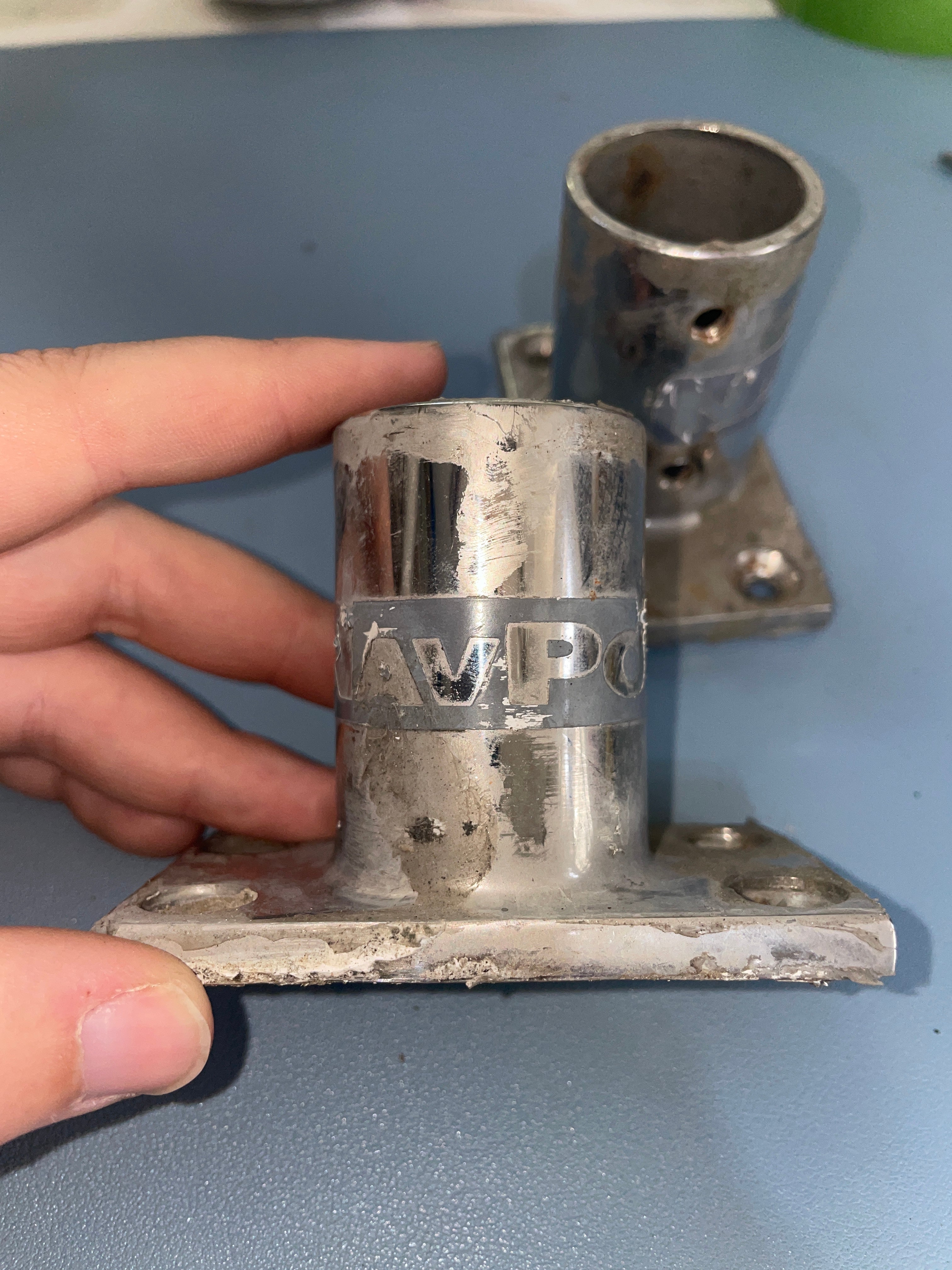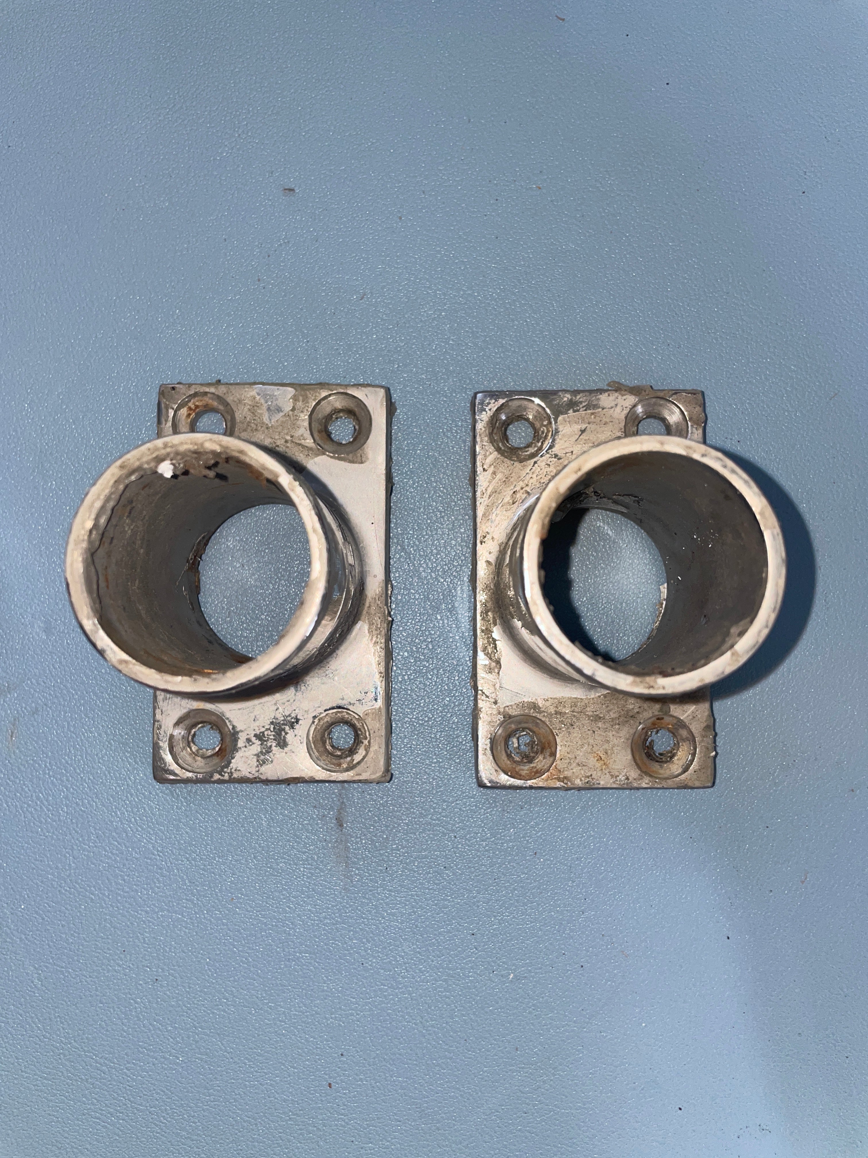 Good condition. They are stainless steel, very dirty. They fit 1 1/4" tubing diameter. The base is 3 1/4" x 1 7/8".