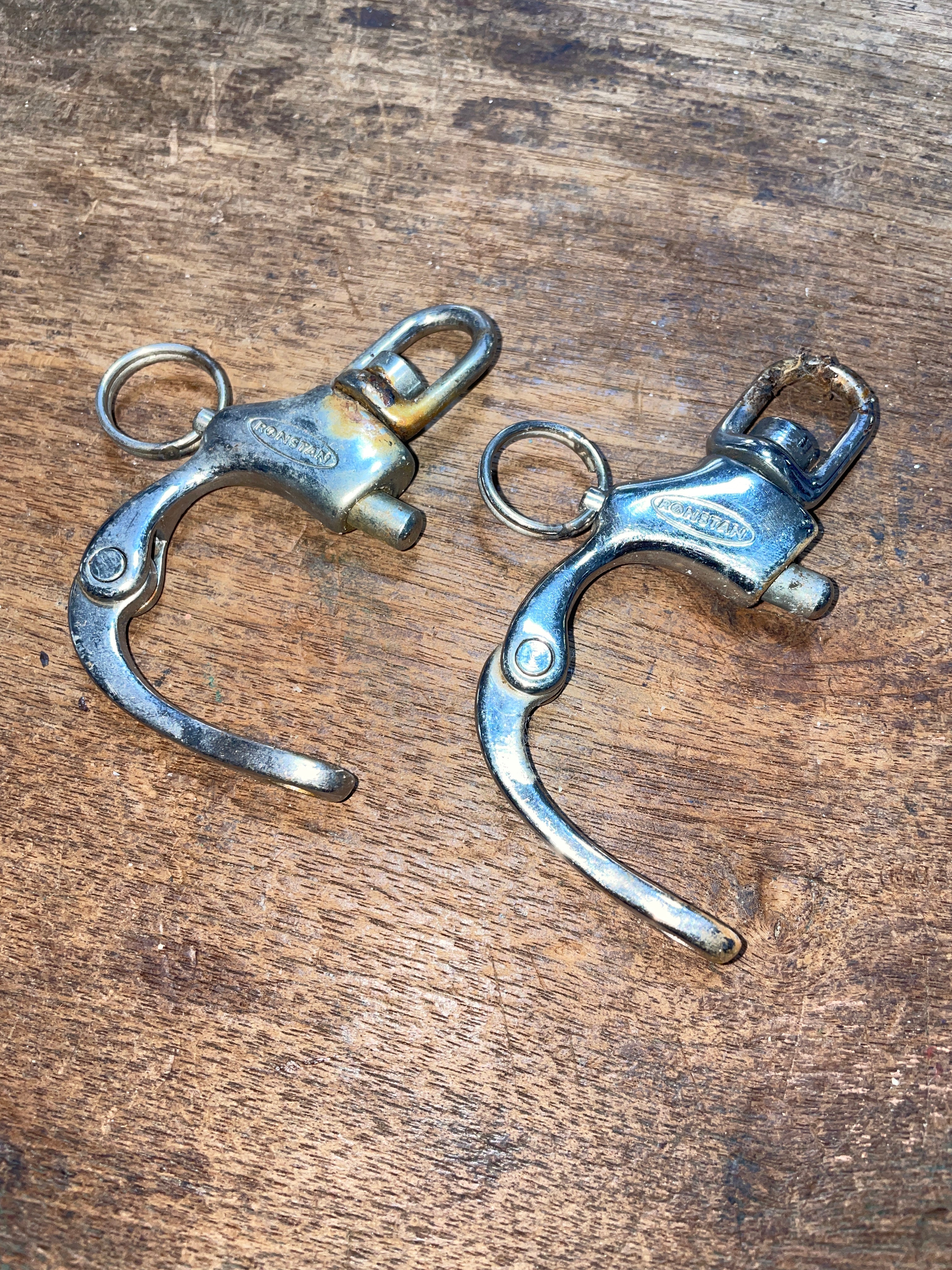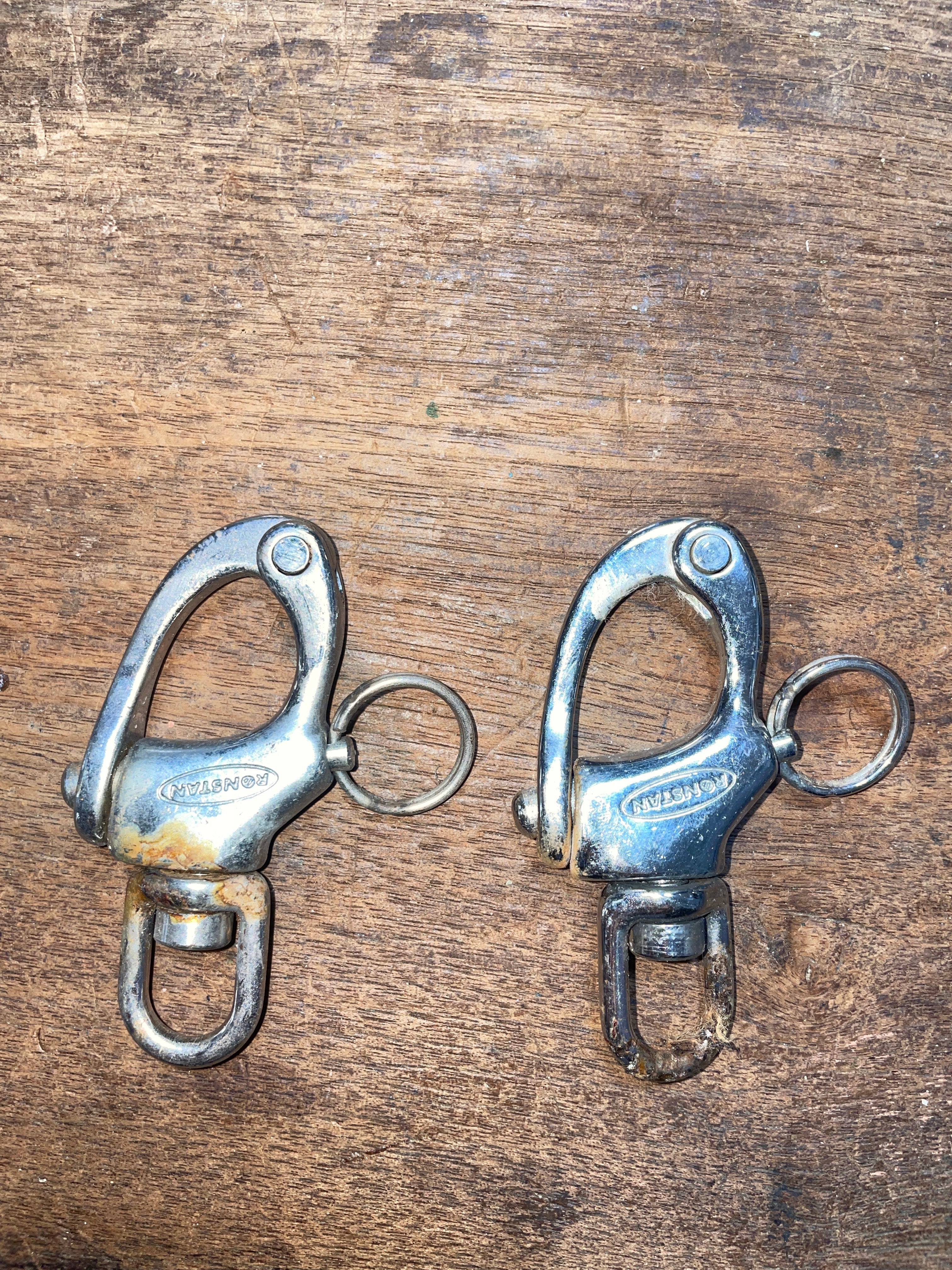 This pair of Ronstan stainless steel shackles are in good condition. They do have some minor rusty spots, however they work as should. 3” total length. The bail is MAX 7/16” width.