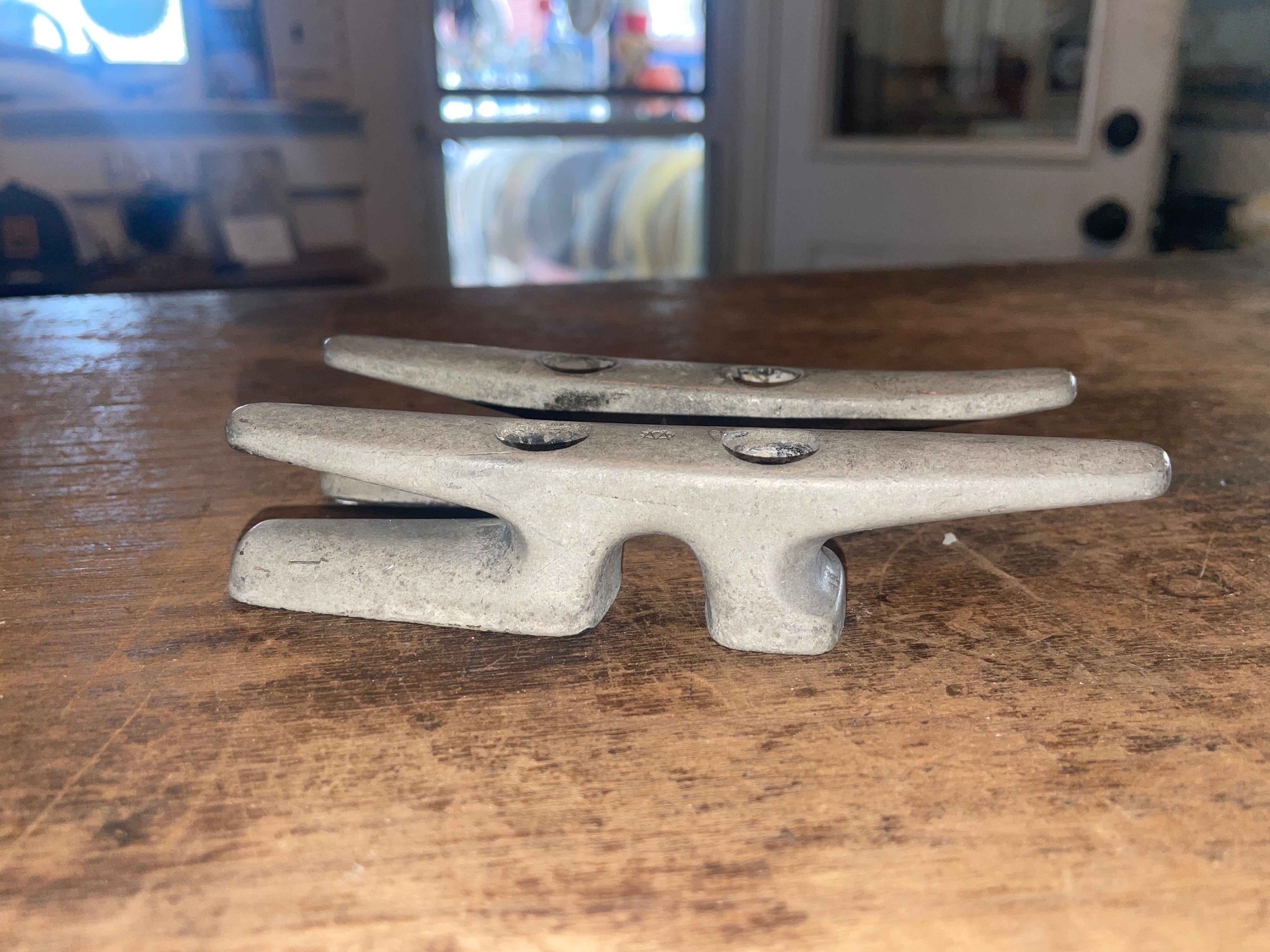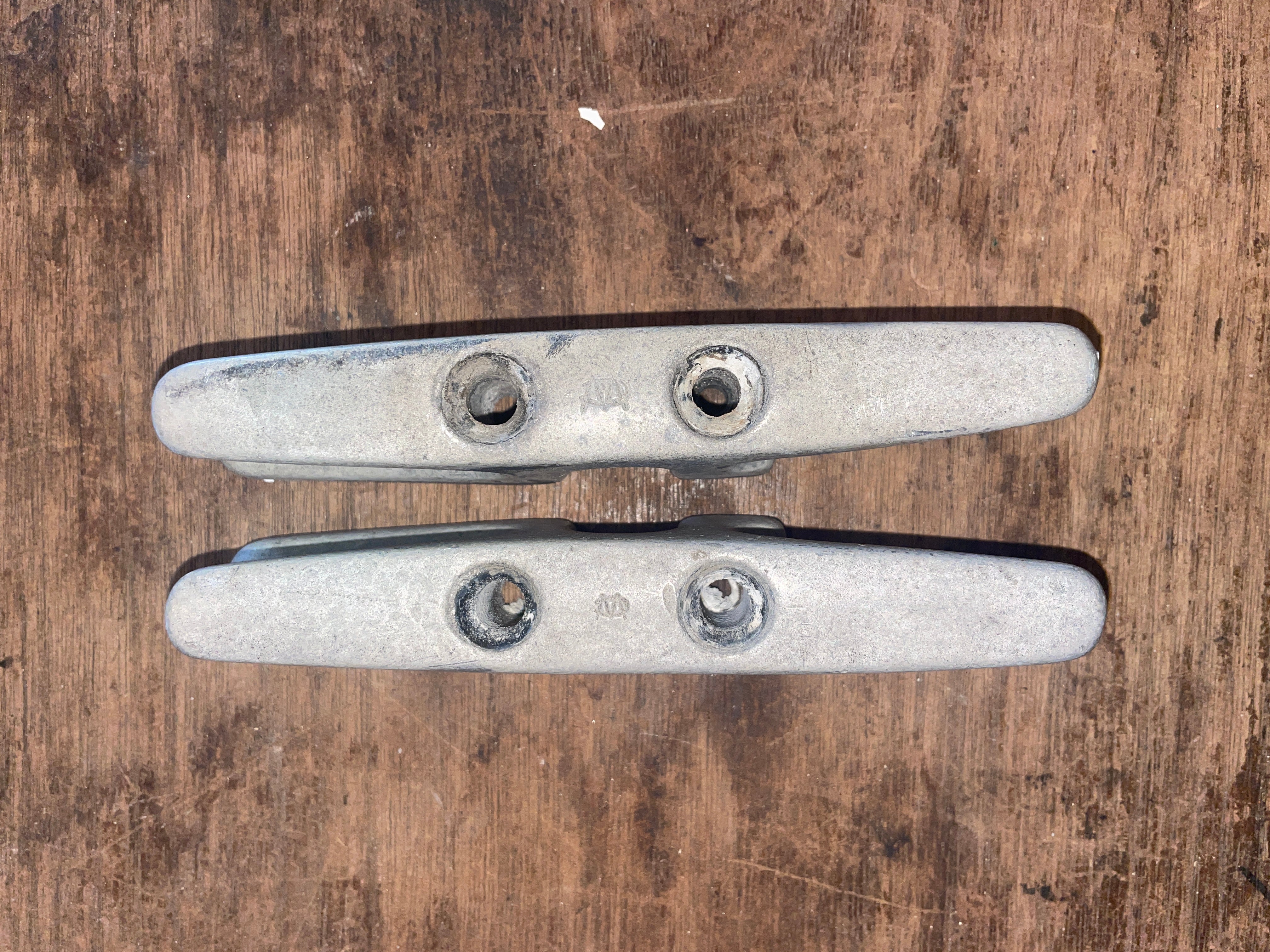This pair of Wilcox crittenden aluminum cleats are in great condition. They are 5” total length. Base is 3 5/8” long. 2 through bolt install. Bolt pattern is 1 1/4” apart. Stands 1” tall.