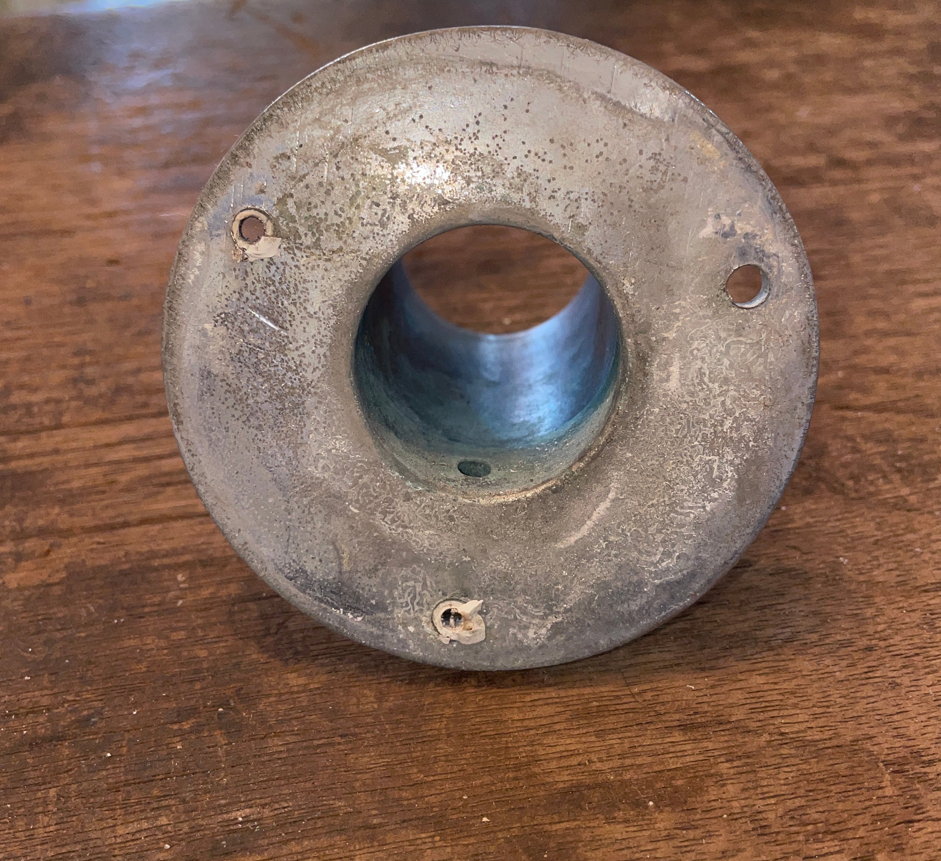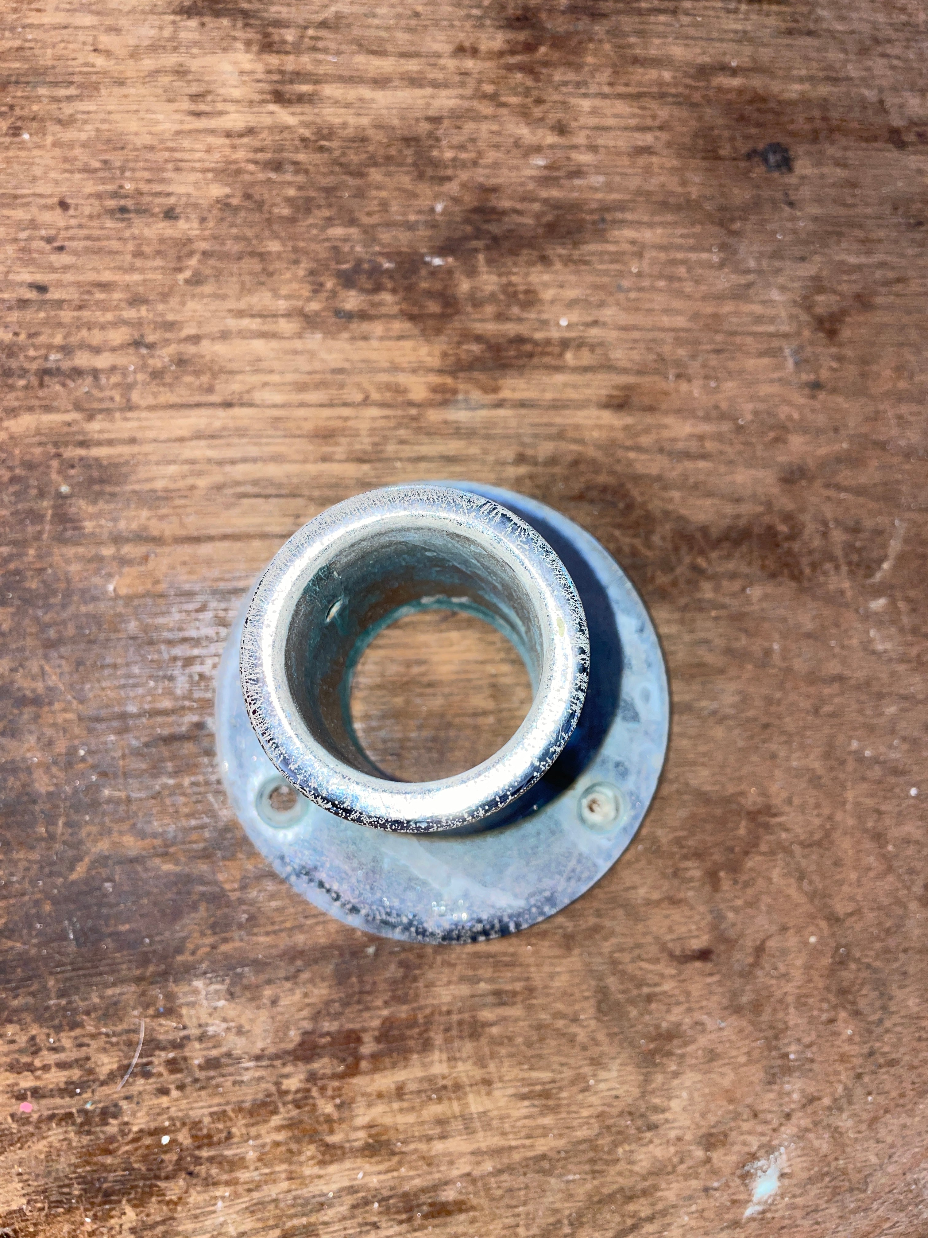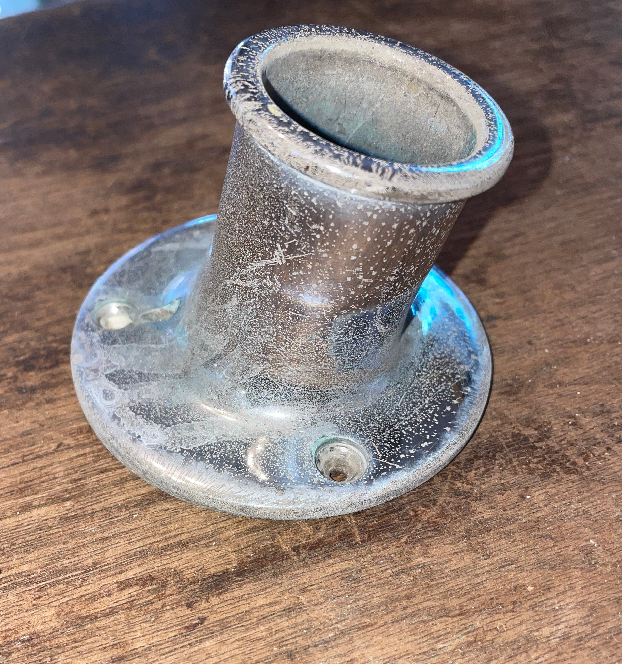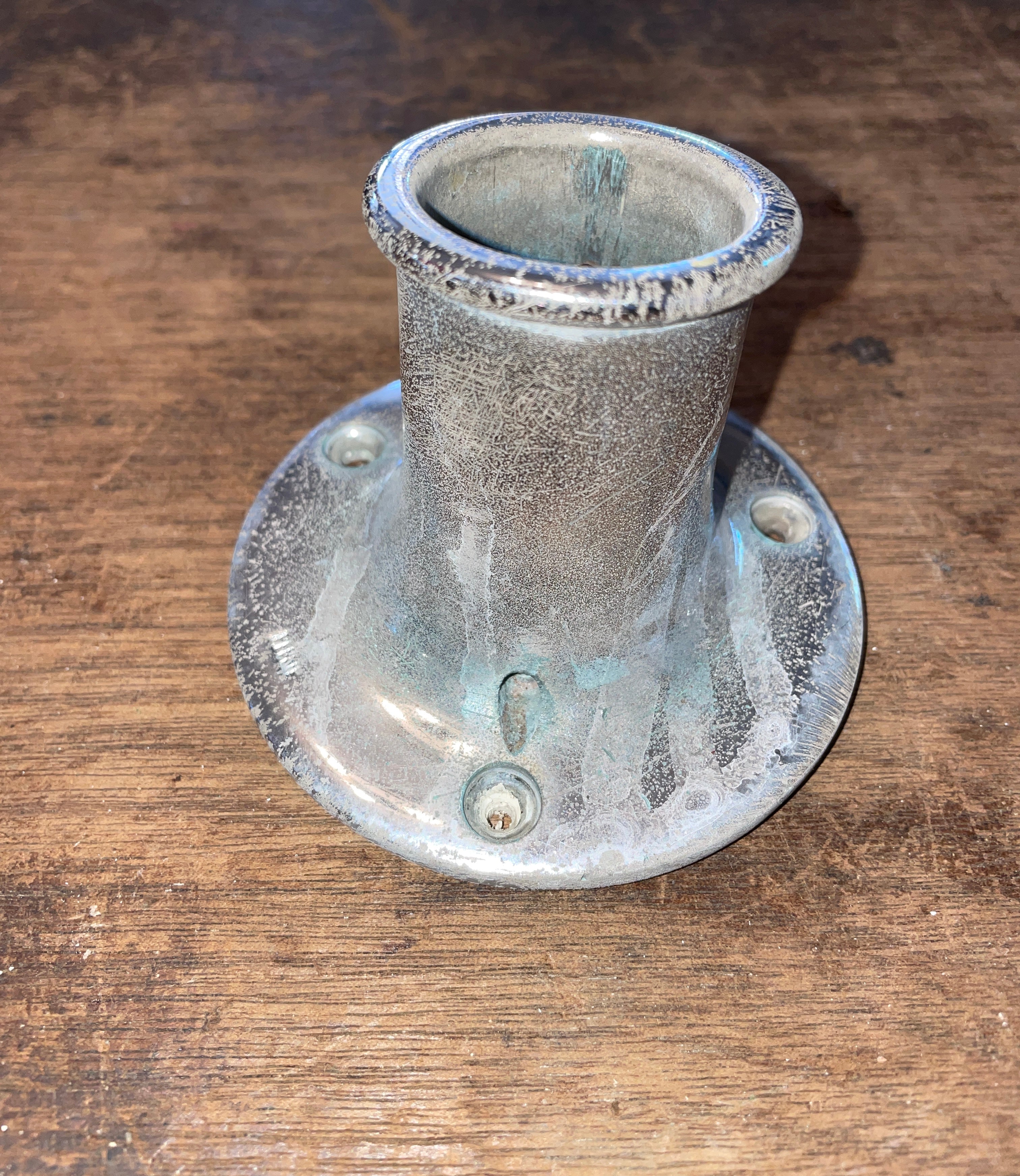 This perko chromed bronze flag holder is in good condition. The chroming is started to come off. Can fit a 1 1/4” pole. The base is 1 1/8” diameter, with 3 bolt install.