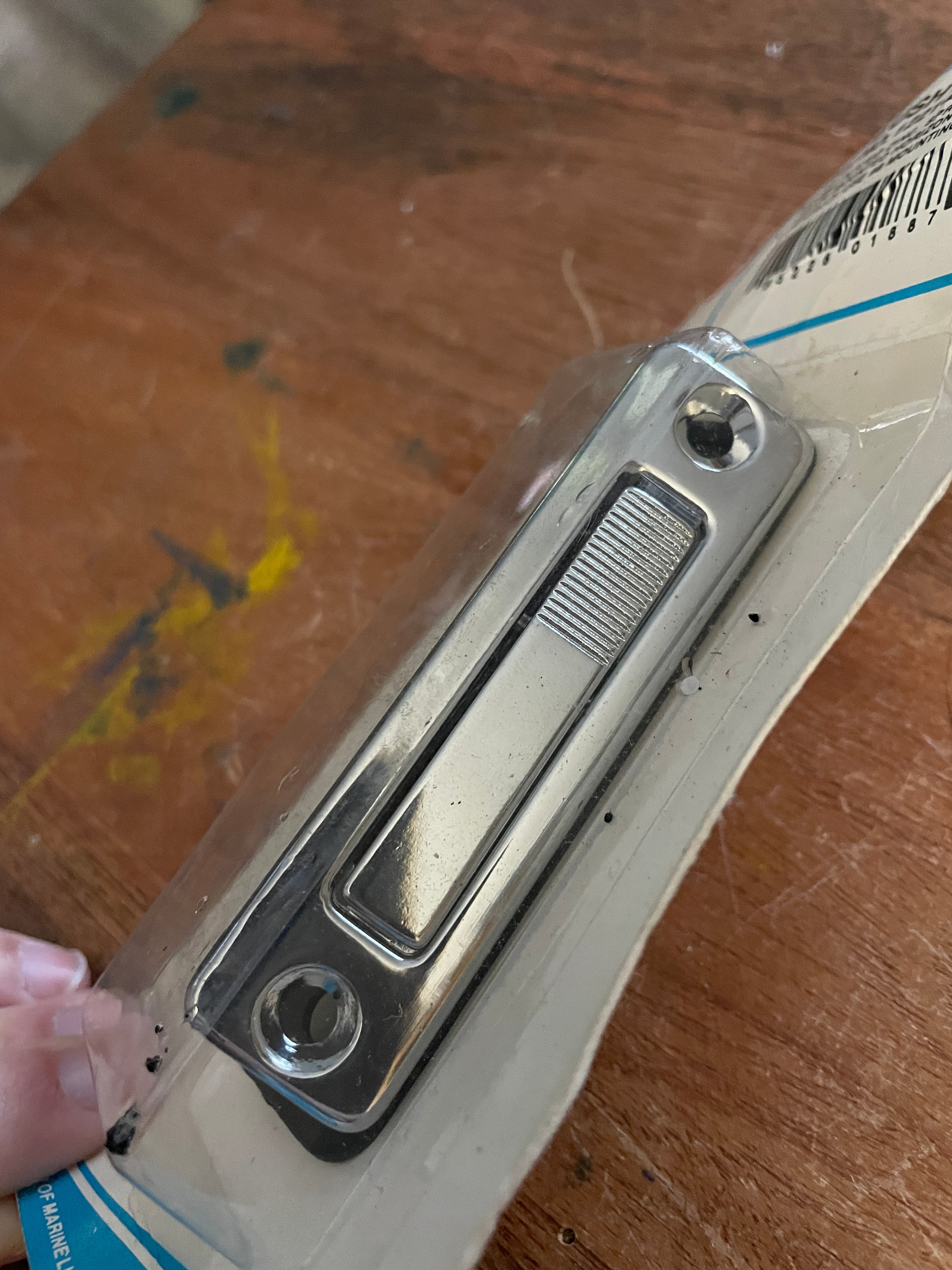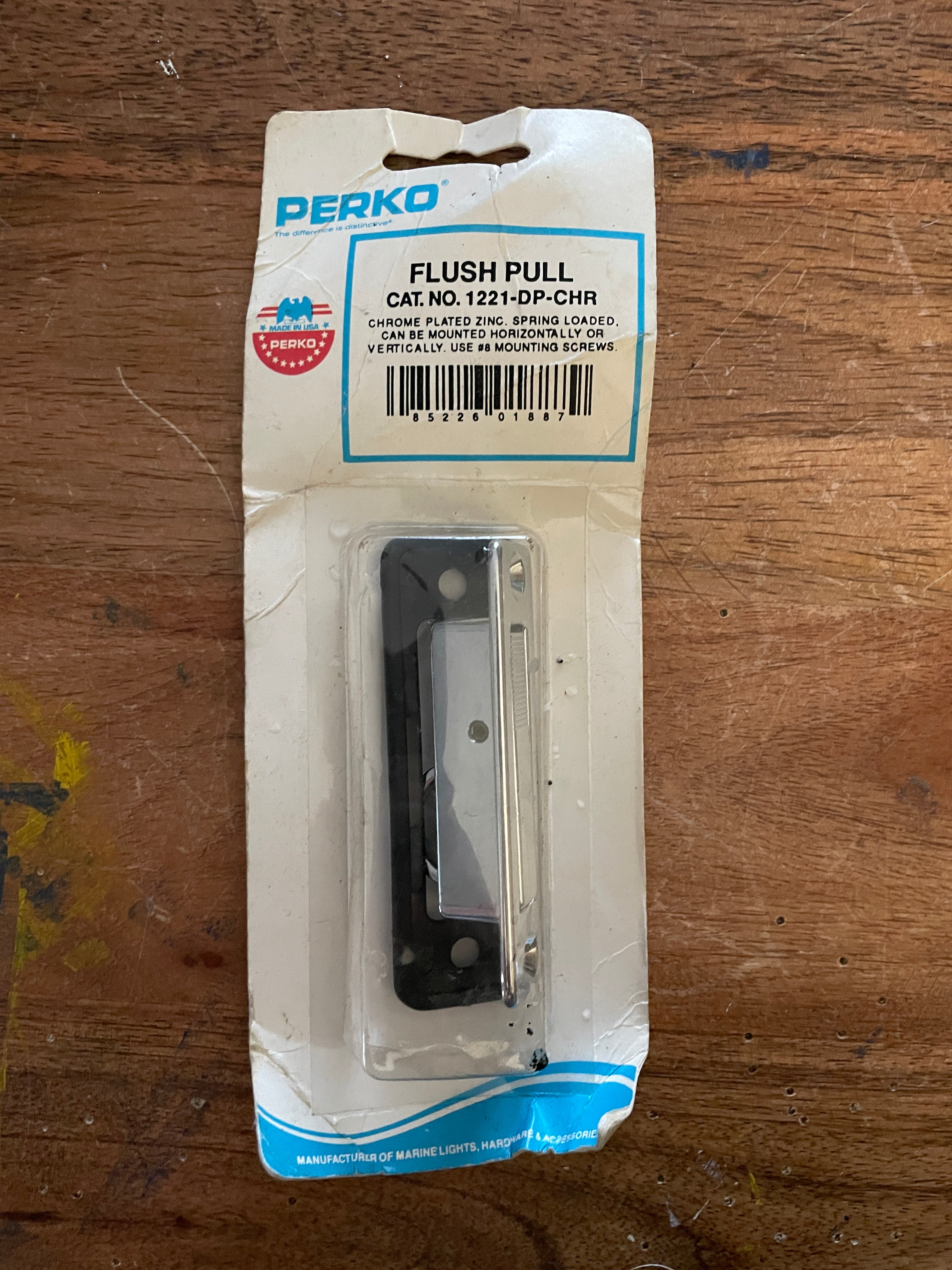 Brand new Perko flush pull. It is category number 1221-DP-CHR. It is chromed plated zing. Spring loaded. Can be mounted horizontally or vertically. Use #8 mounting srews.