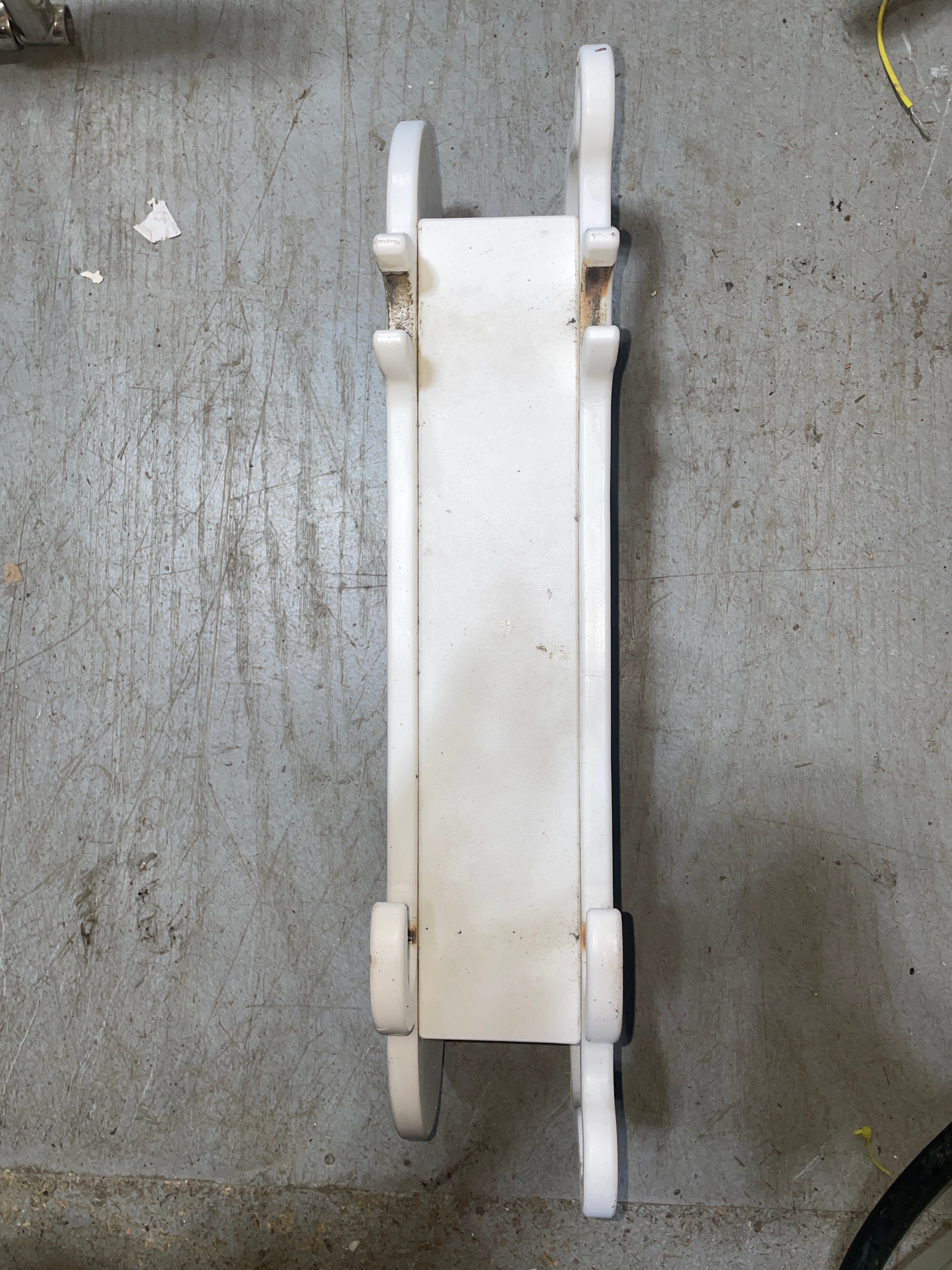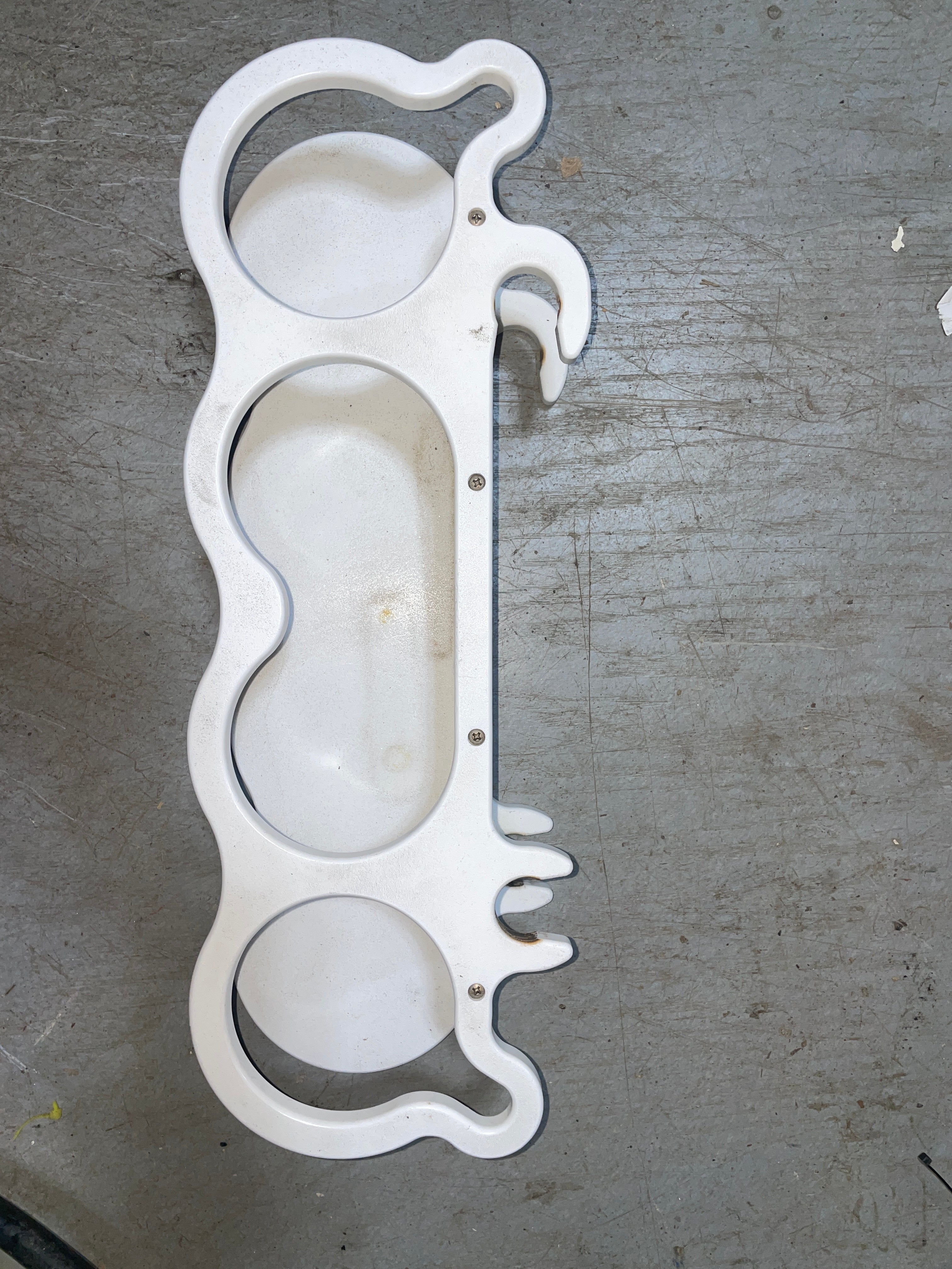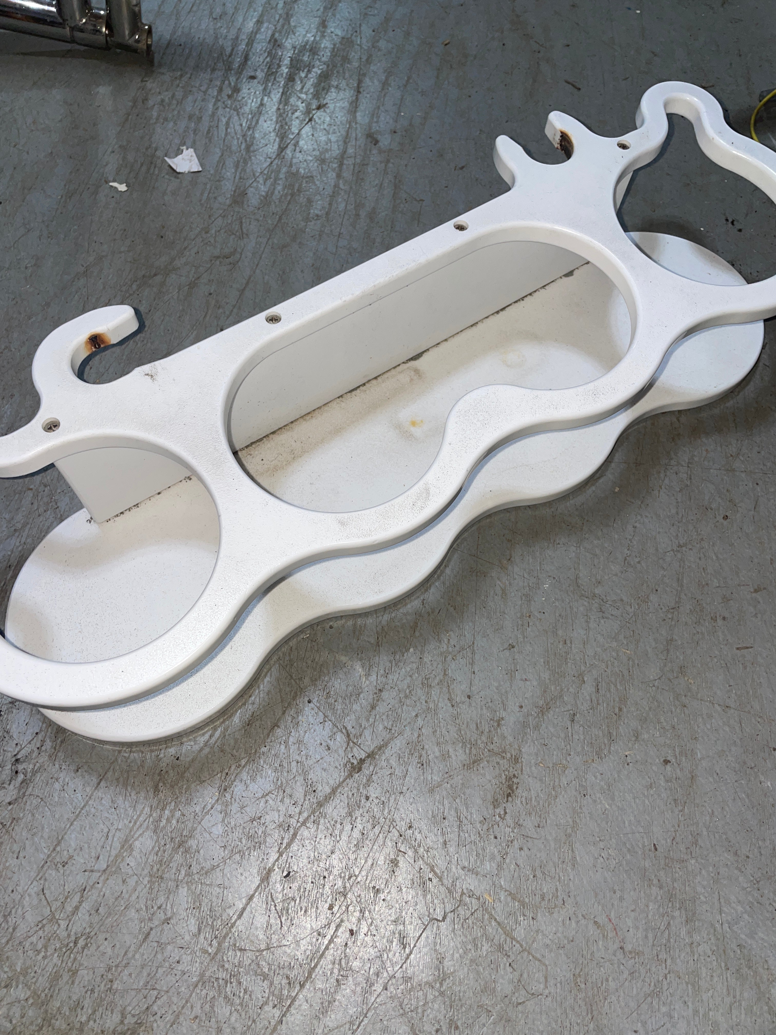 This white poly Edson cup holder is in great condition. It measures 17 1/2” long x 6” wide x 3 1/2” tall. Has 4 cup clots. Fits for a guard with 9 1/2” center to center measurement.