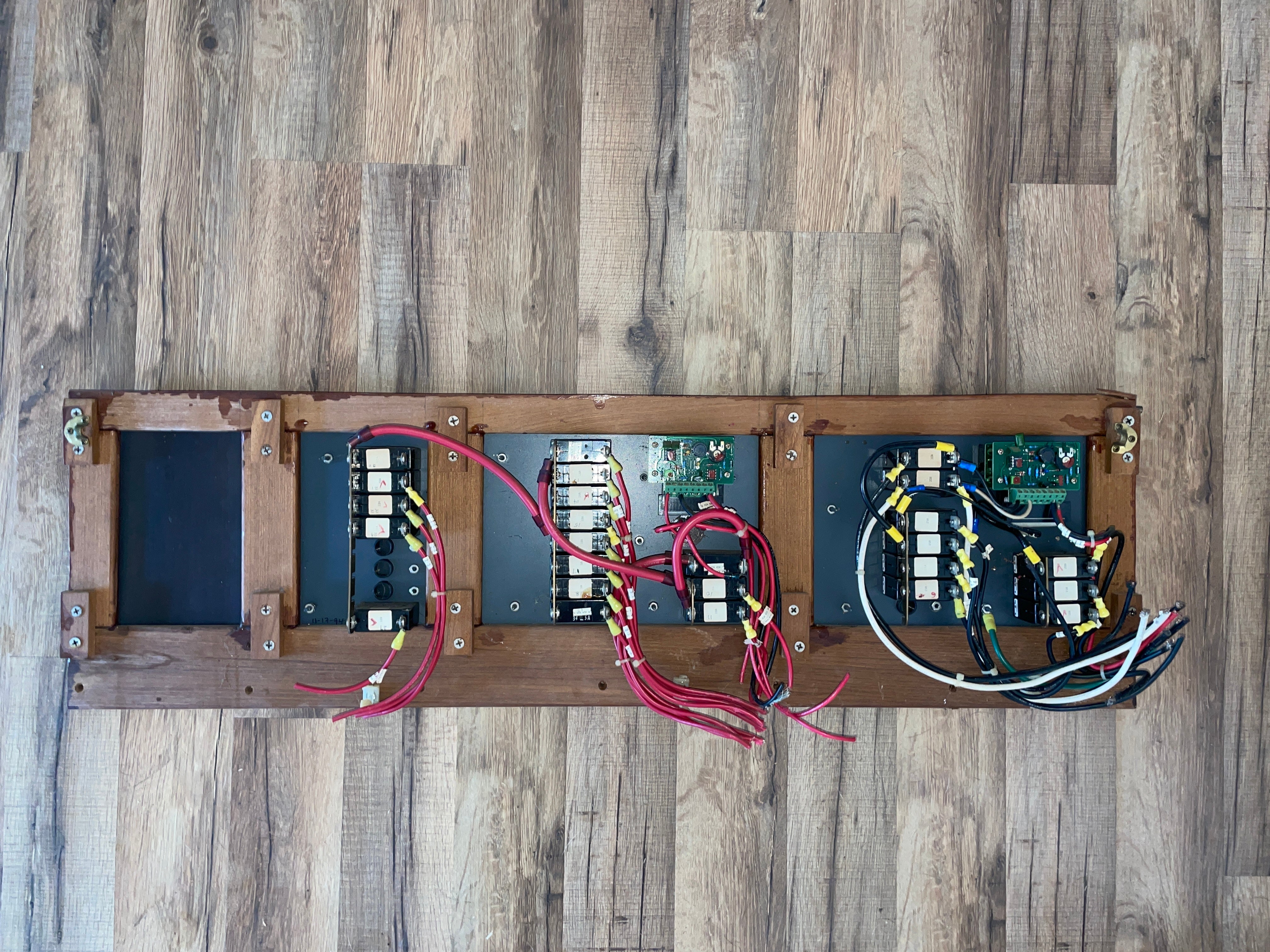 This bundle of electrical panels are all in great condition! All are made by professional mariner. The first is the AC Panel. It is 8 total switch (only 7 actual switches in it though). The DC panel is 11 switches, all are in great condition. The third panel is the accessory panel. It has 8 total switches (only 5 actual switches in it). All comes mounted inside a teak door that measures 35 3/4” long x 10 3/4” wide. This complete system was removed off a Cabo Rico 38.
