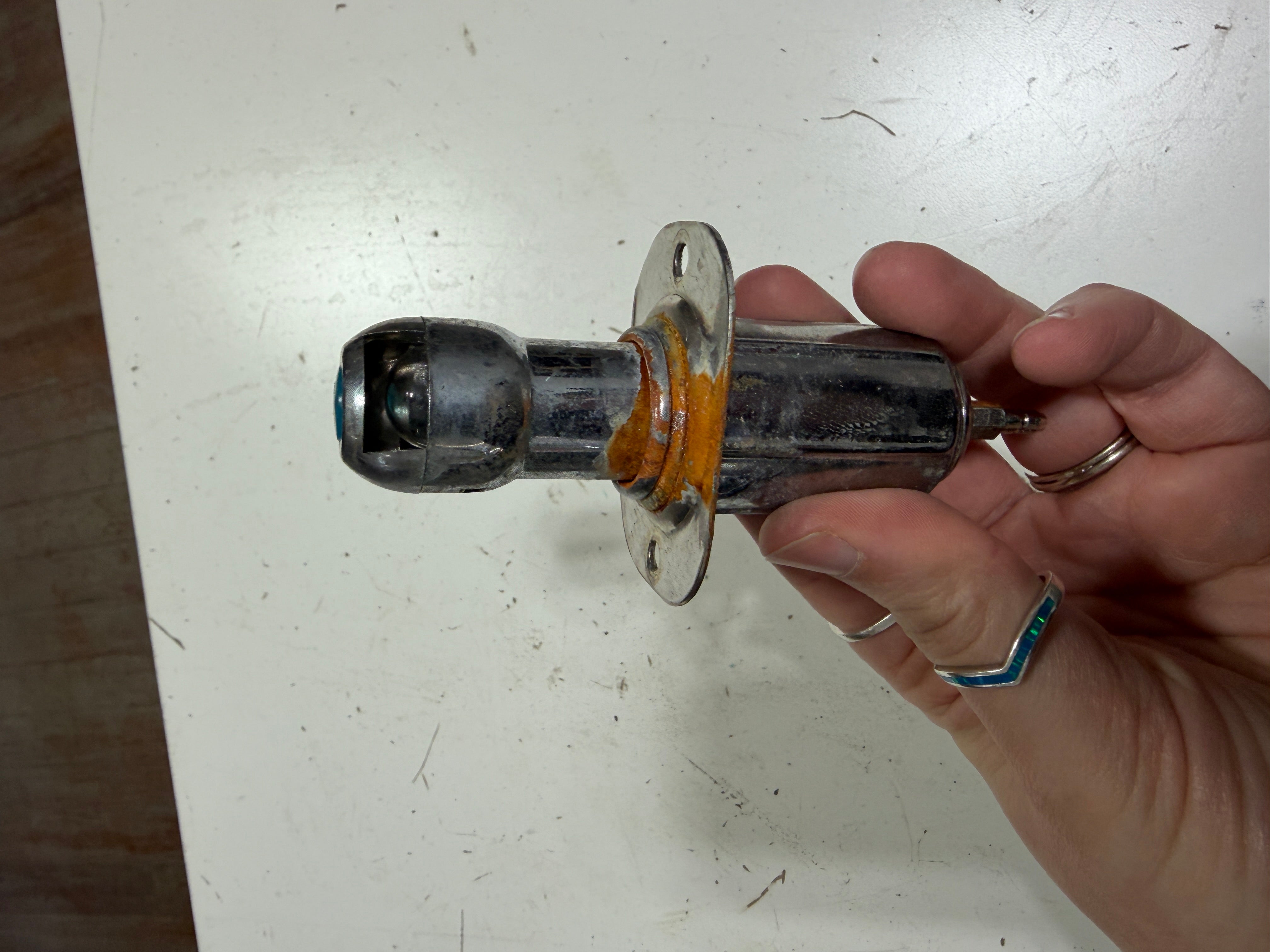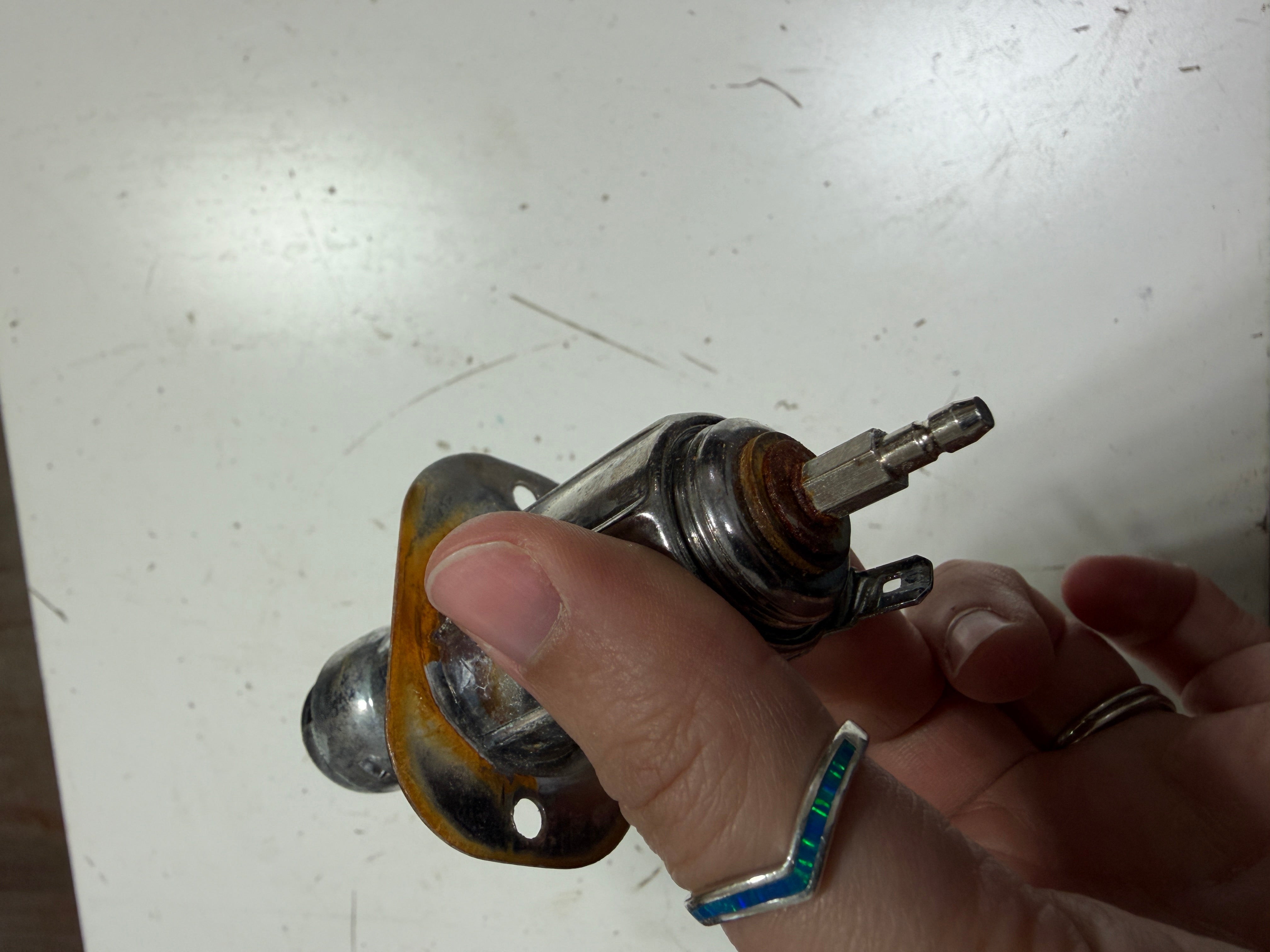 Push Light. It is 4 1/4" total length. The mounting area is 2 1/8" x 1 1/2". It does have a rusty area but the light pushes and comes back up smoothly.