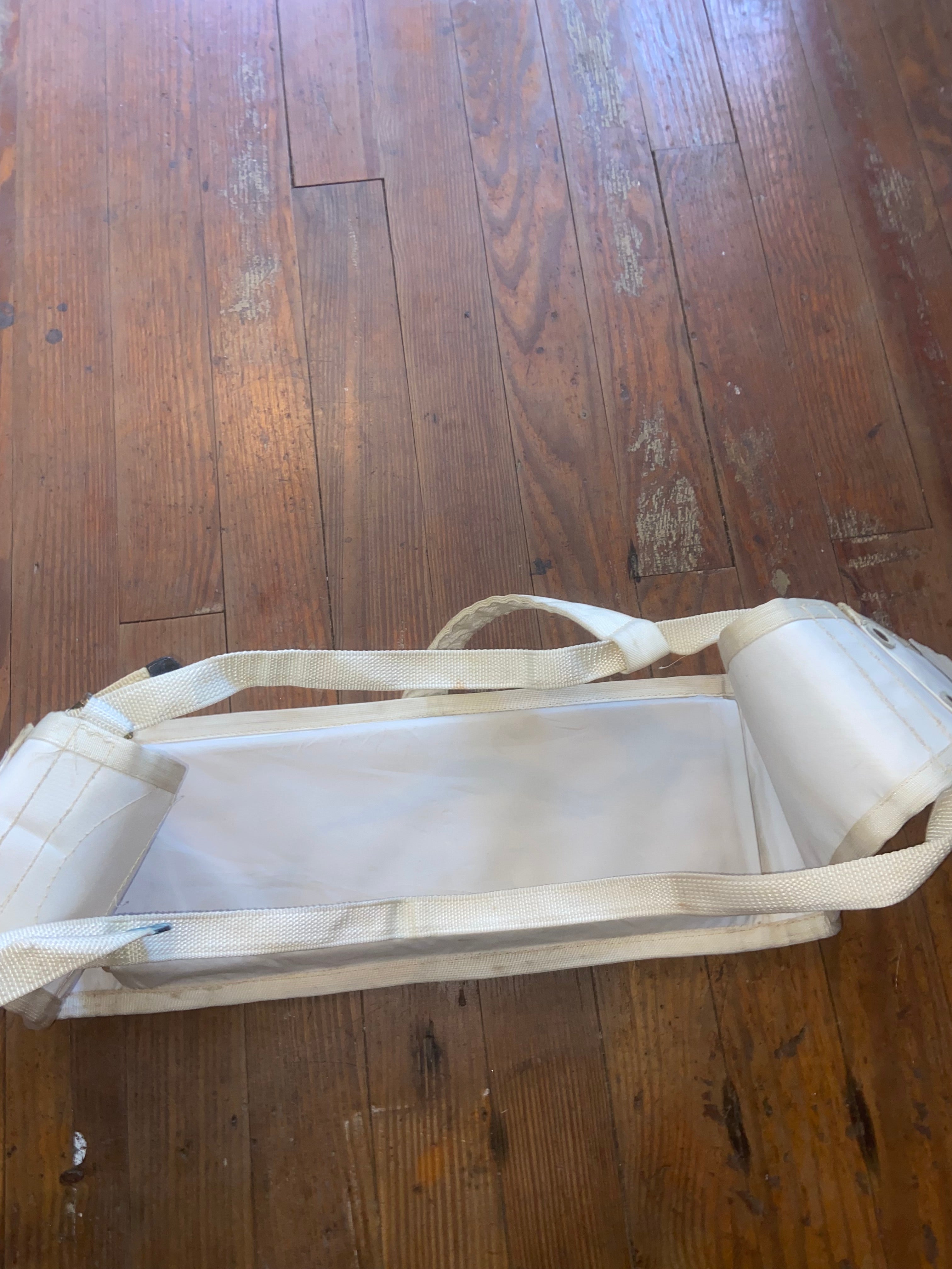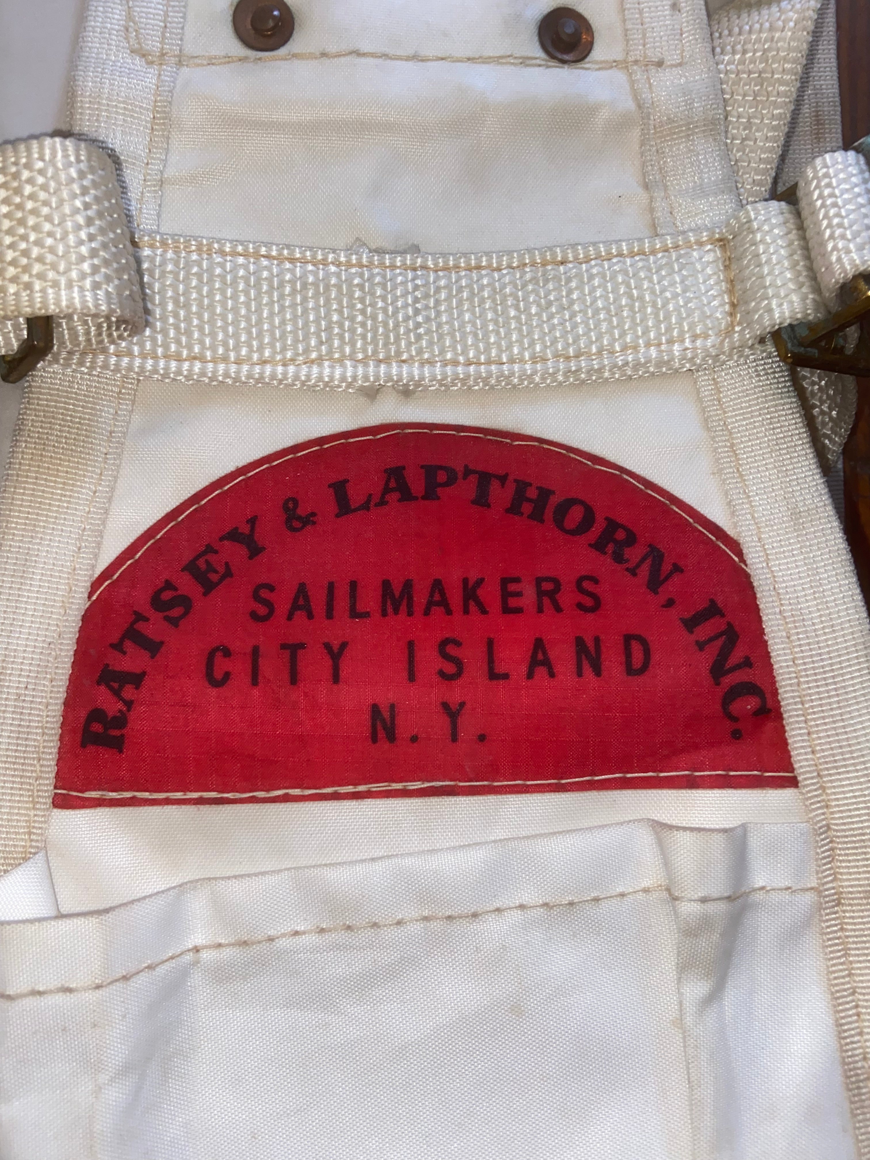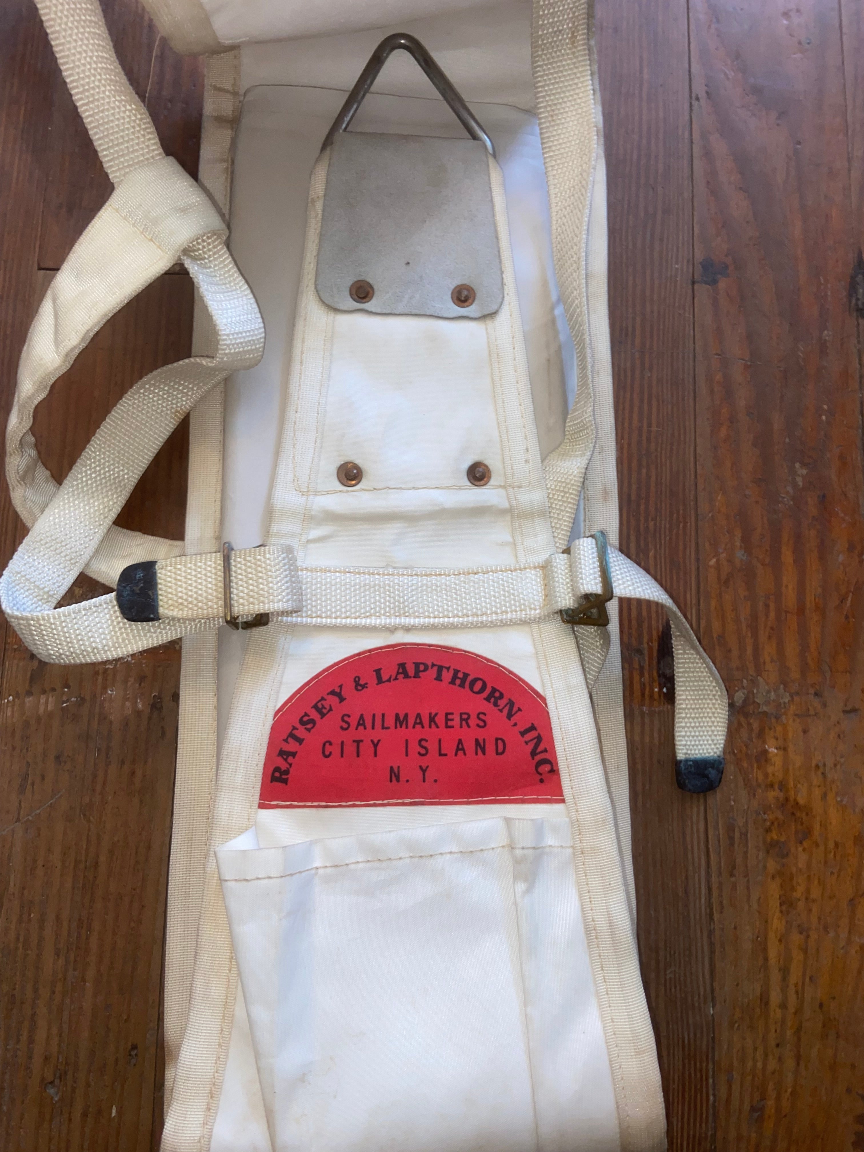 This bosuns chair is in overall good condition. White in color, it is dirty but would clean up. Made by ratsey and lapthorn inc. Measures 20” long. Very sturdy. Has side pockets for tools and other items.