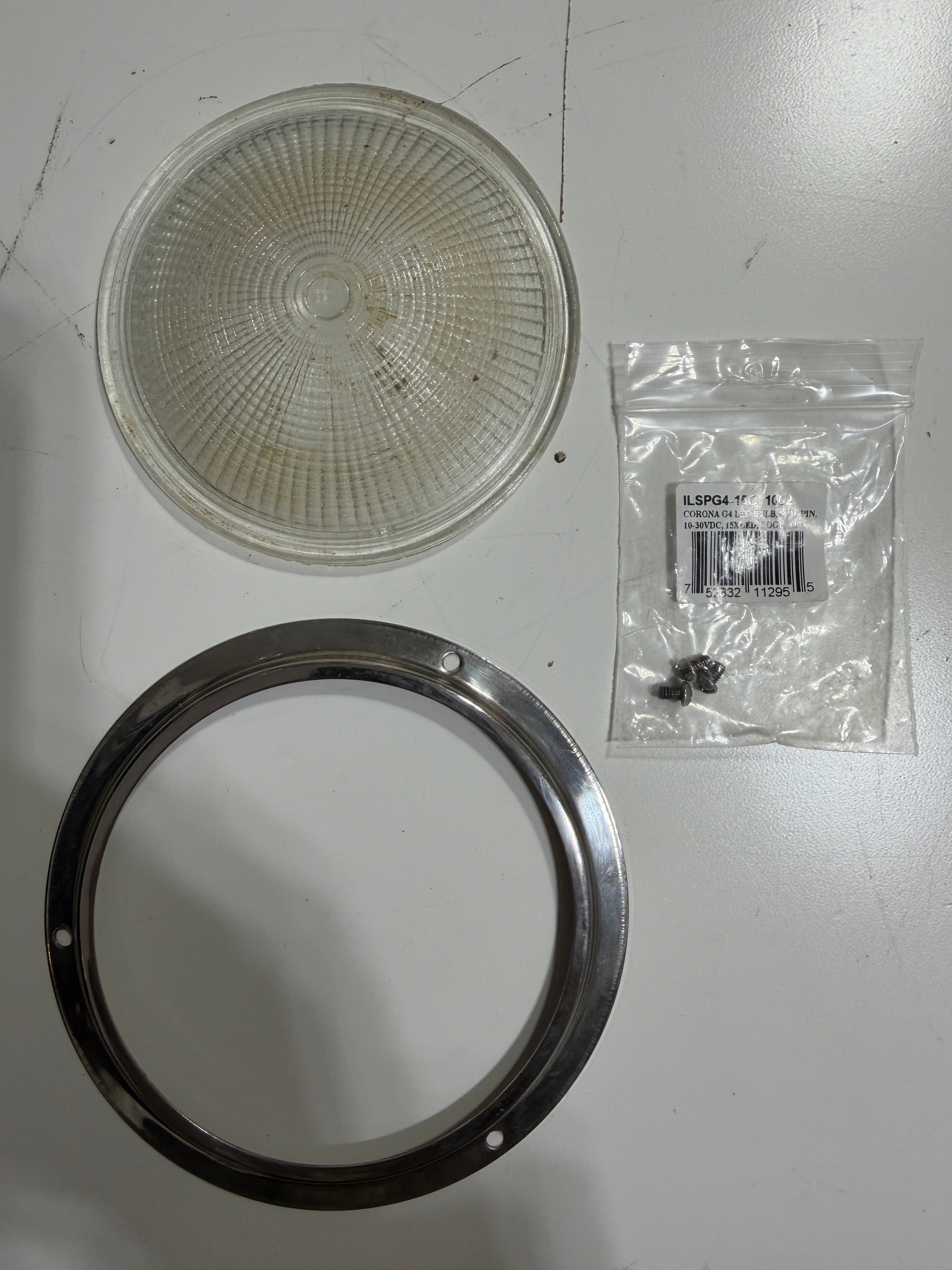 This is a glass replacement lens. The trim is stainless steel. 4 3/4" total diameter of the trim ring. Comes with the screws.