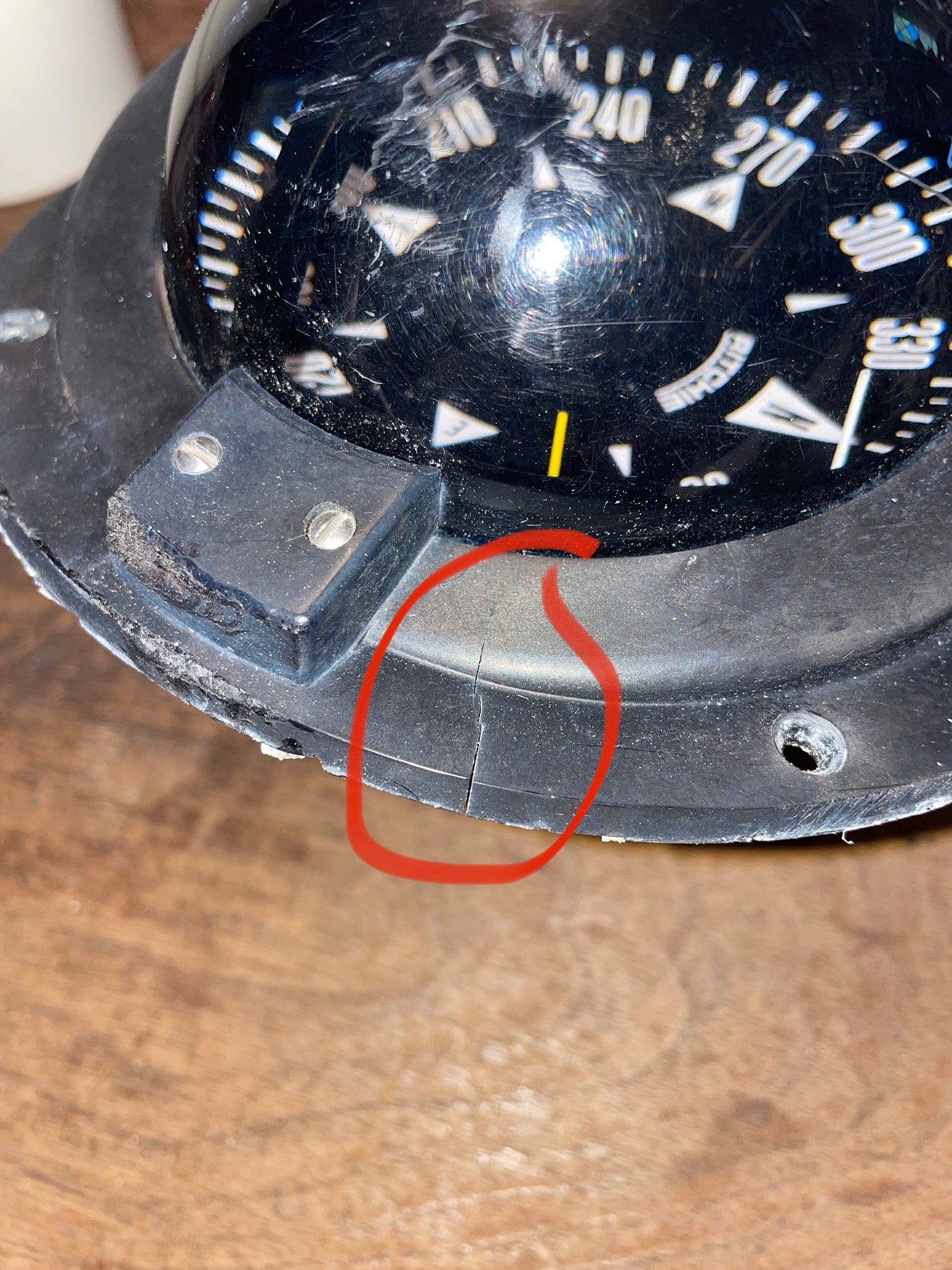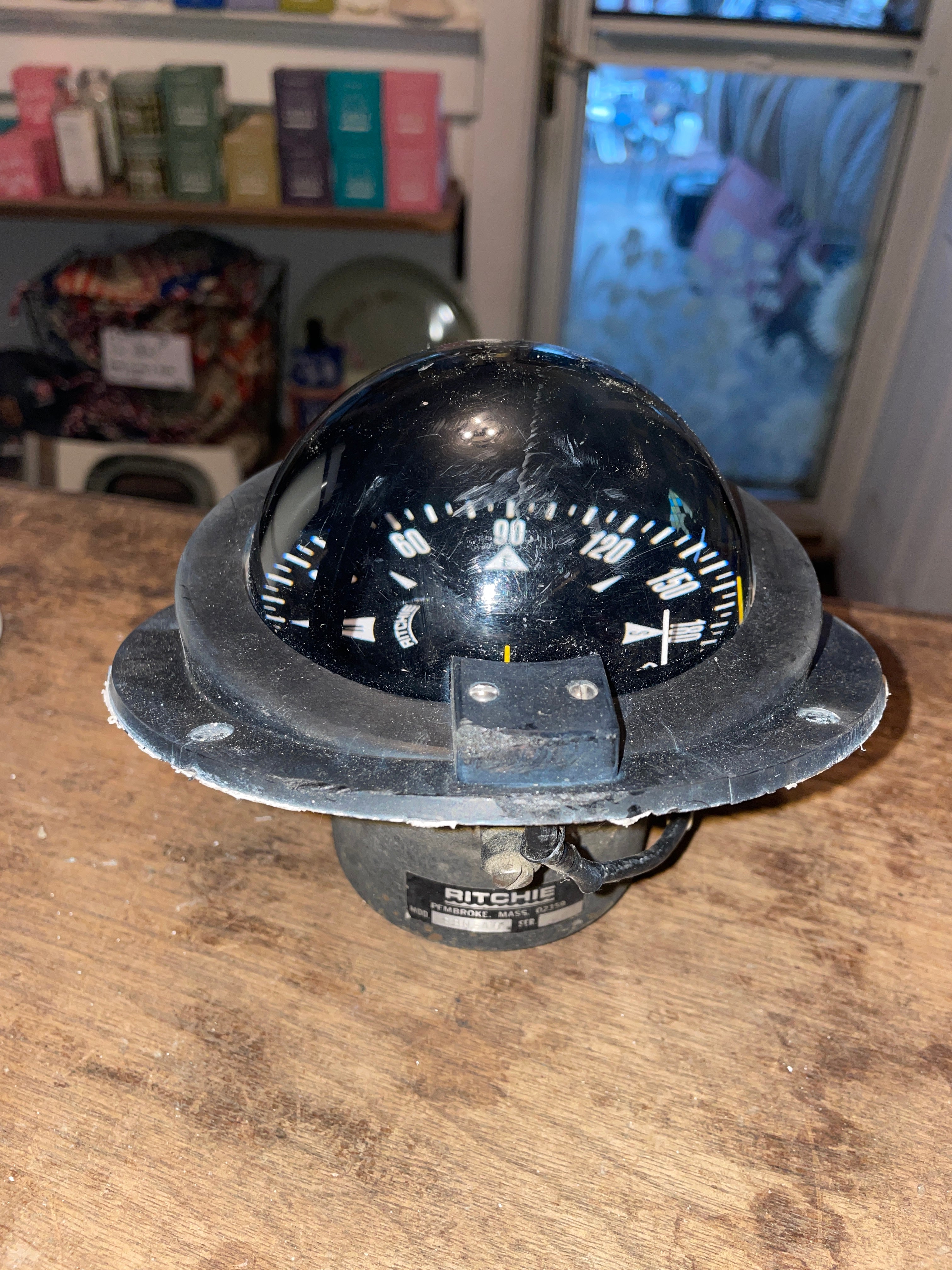 This Ritchie SBN-40 compass is in good condition. It does have scratching to the dome. The compass diameter is 6 1/4”. Bottom is 3” diameter. Does have a crack in the top plastic part. Please look at the photos it is circled.