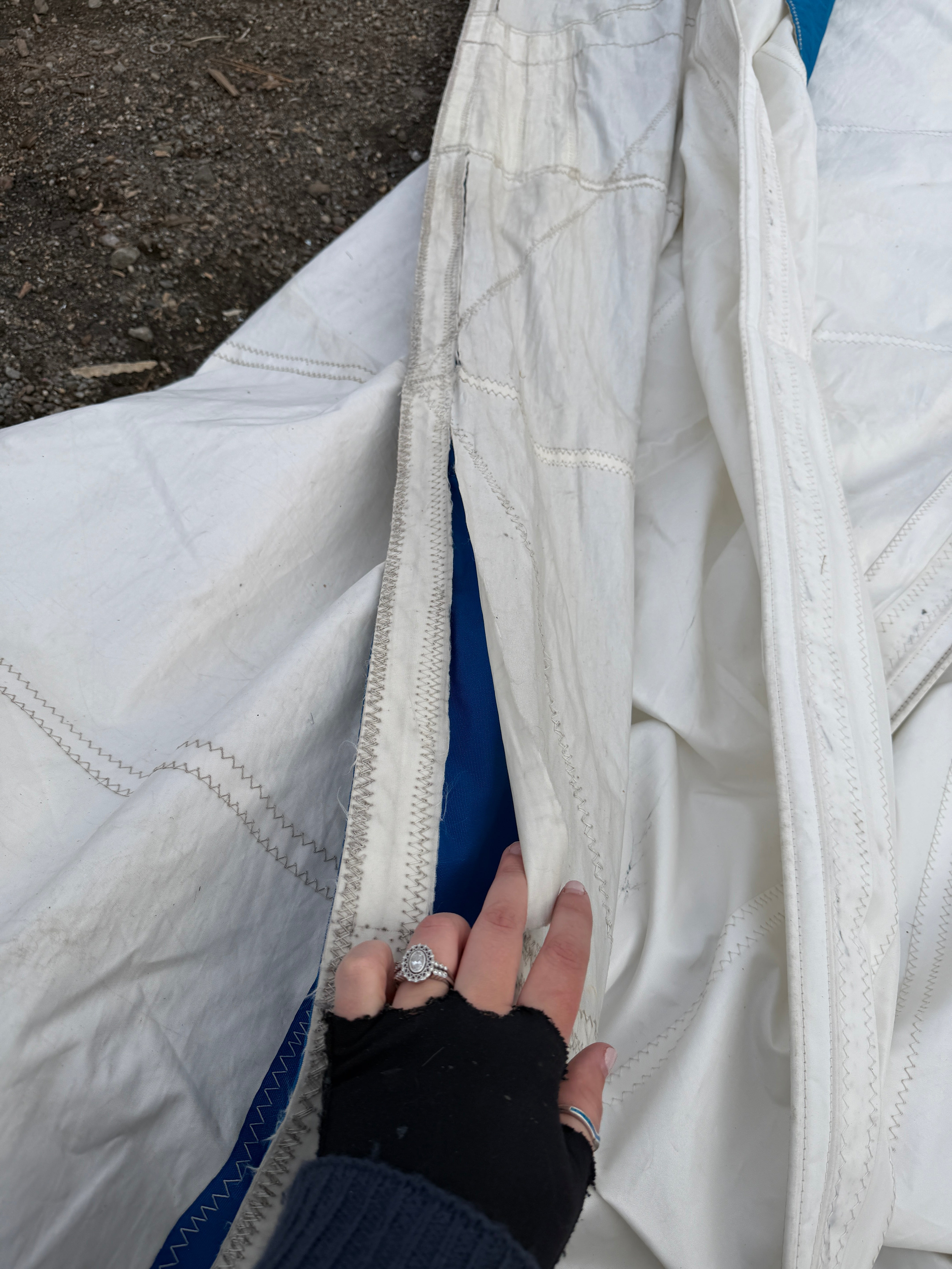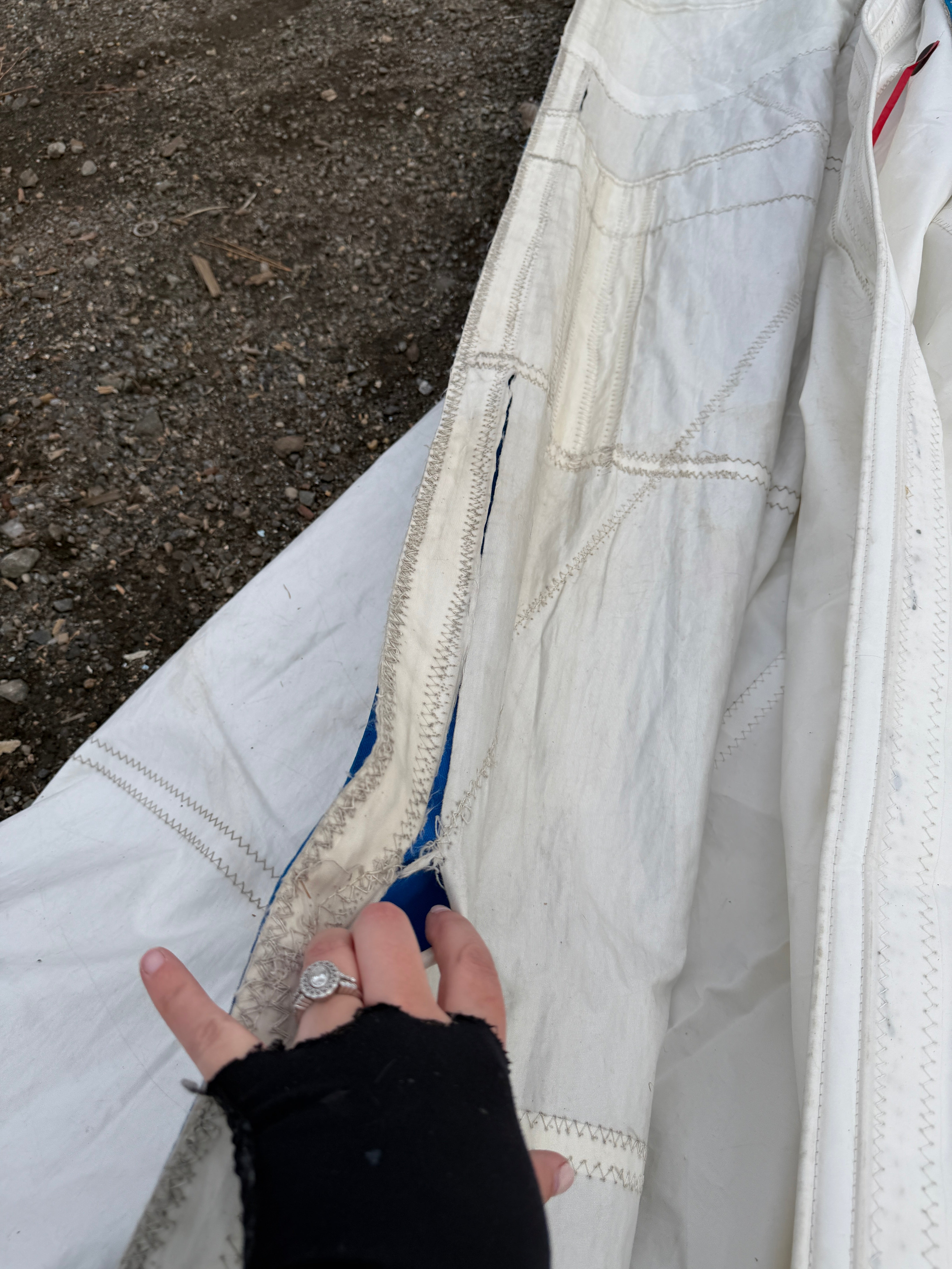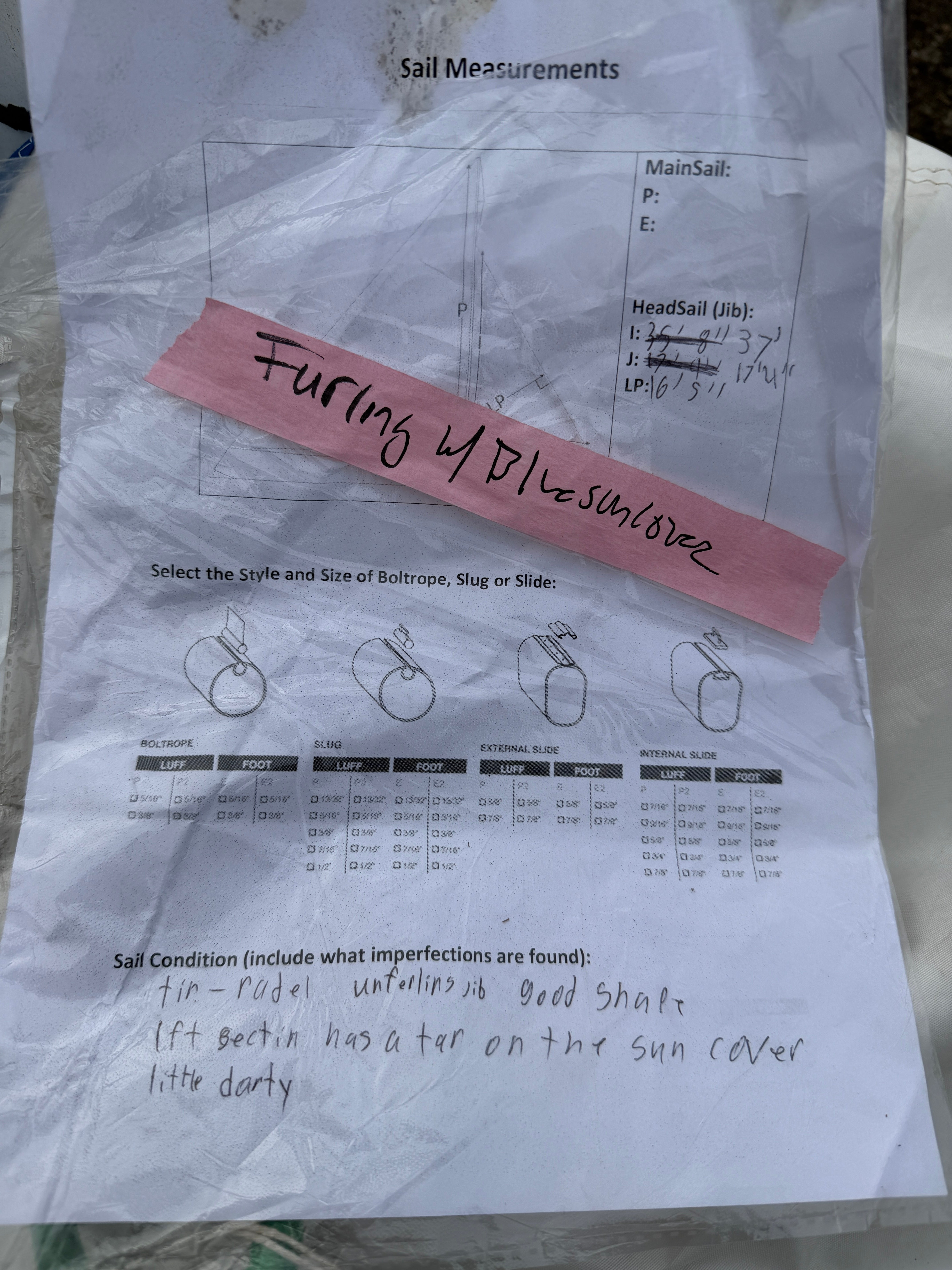 unknown what this roller furling Genoa sail was removed off of. It is in as is condition. Needs a load of stitching and restitching work. No tears but where the stitching has come undone from the sail and the canvas in a bunch of areas. This would make a better sunshade than sail. The paper says 37' x 17'4" x 16'5" but we will confirm that 17'4" side as that seems incorrect.