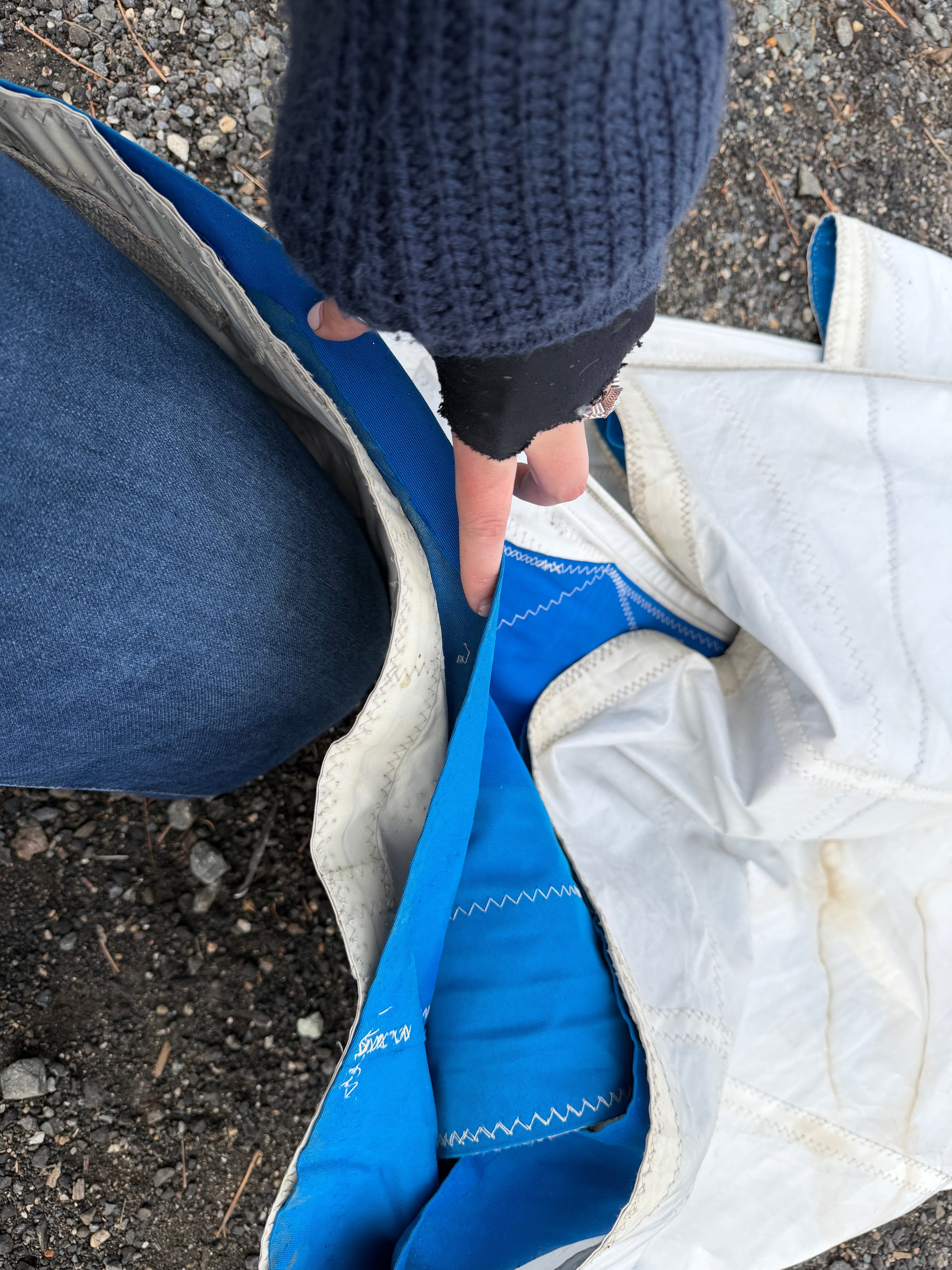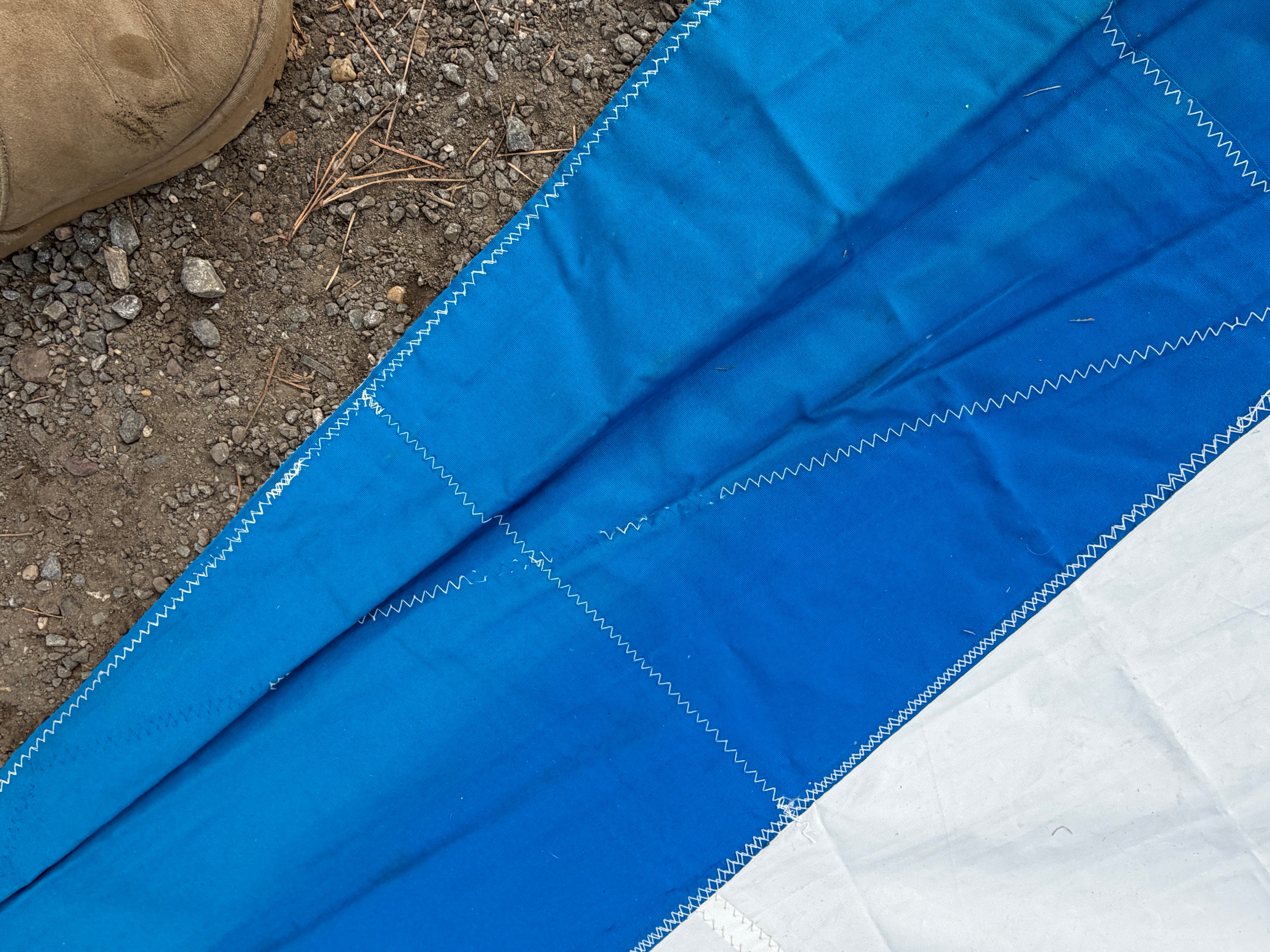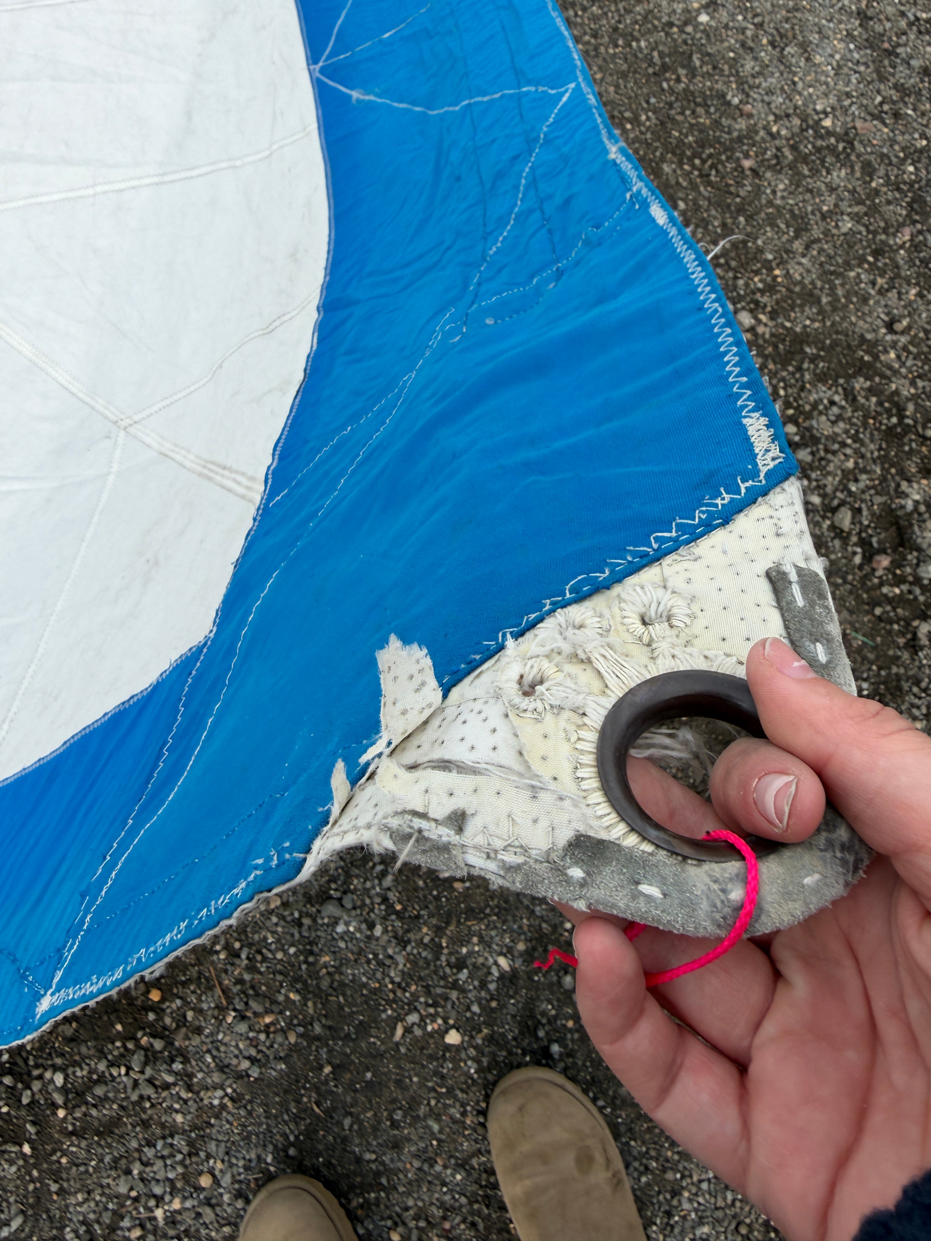 unknown what this roller furling Genoa sail was removed off of. It is in as is condition. Needs a load of stitching and restitching work. No tears but where the stitching has come undone from the sail and the canvas in a bunch of areas. This would make a better sunshade than sail. The paper says 37' x 17'4" x 16'5" but we will confirm that 17'4" side as that seems incorrect.