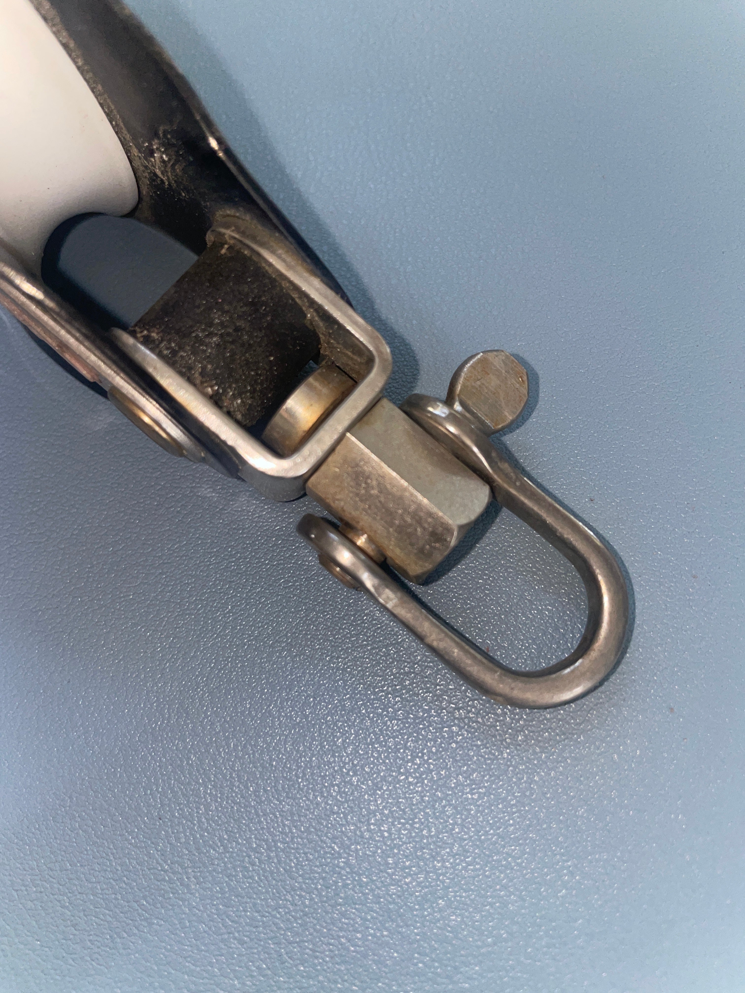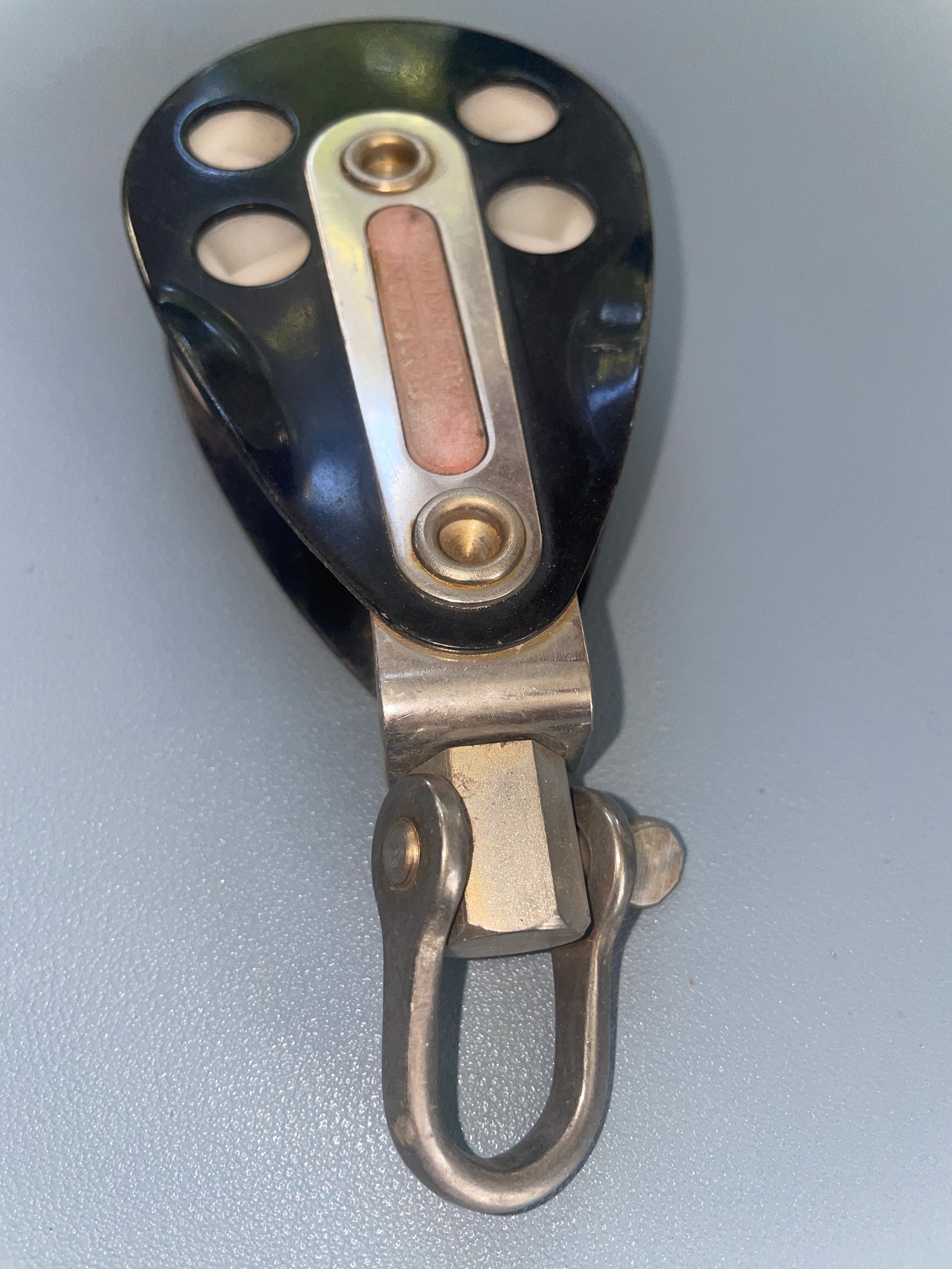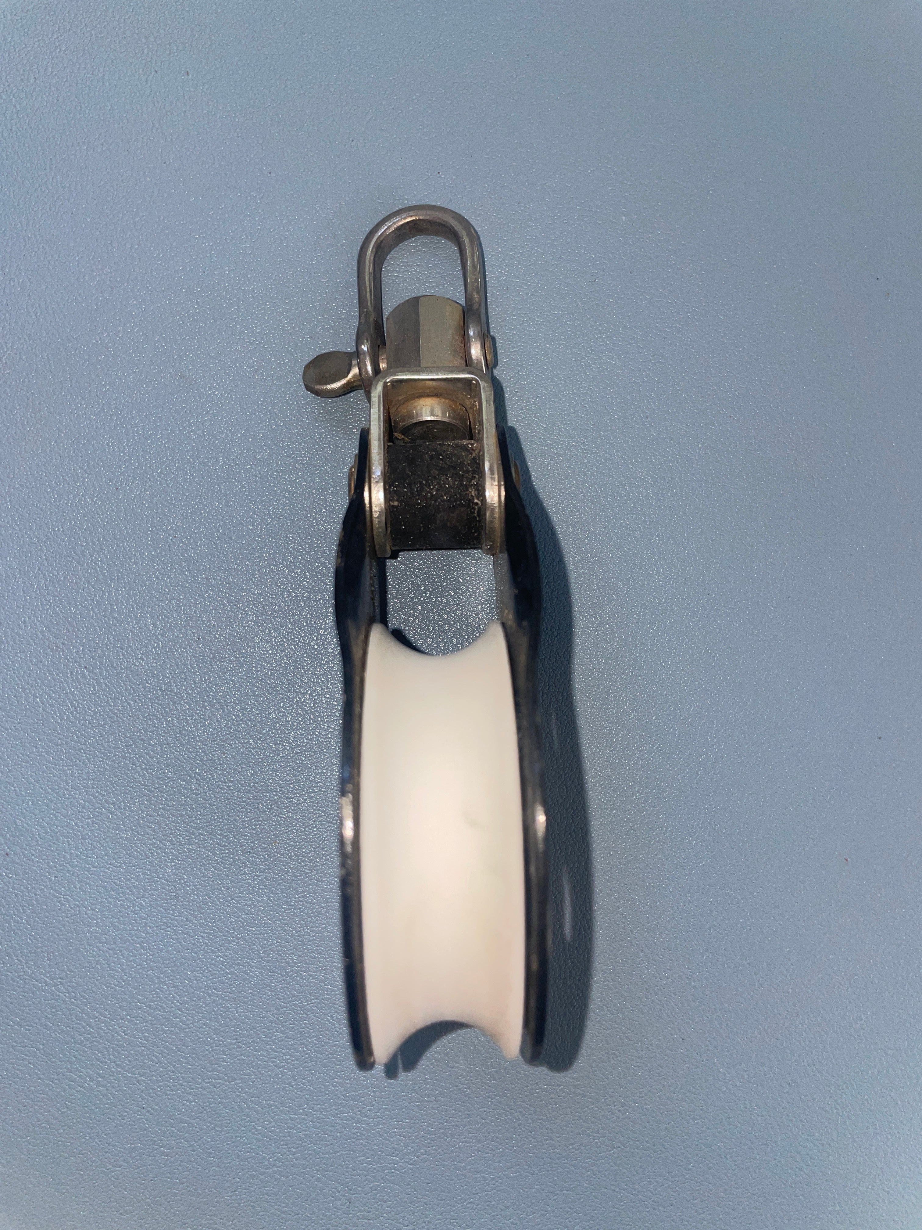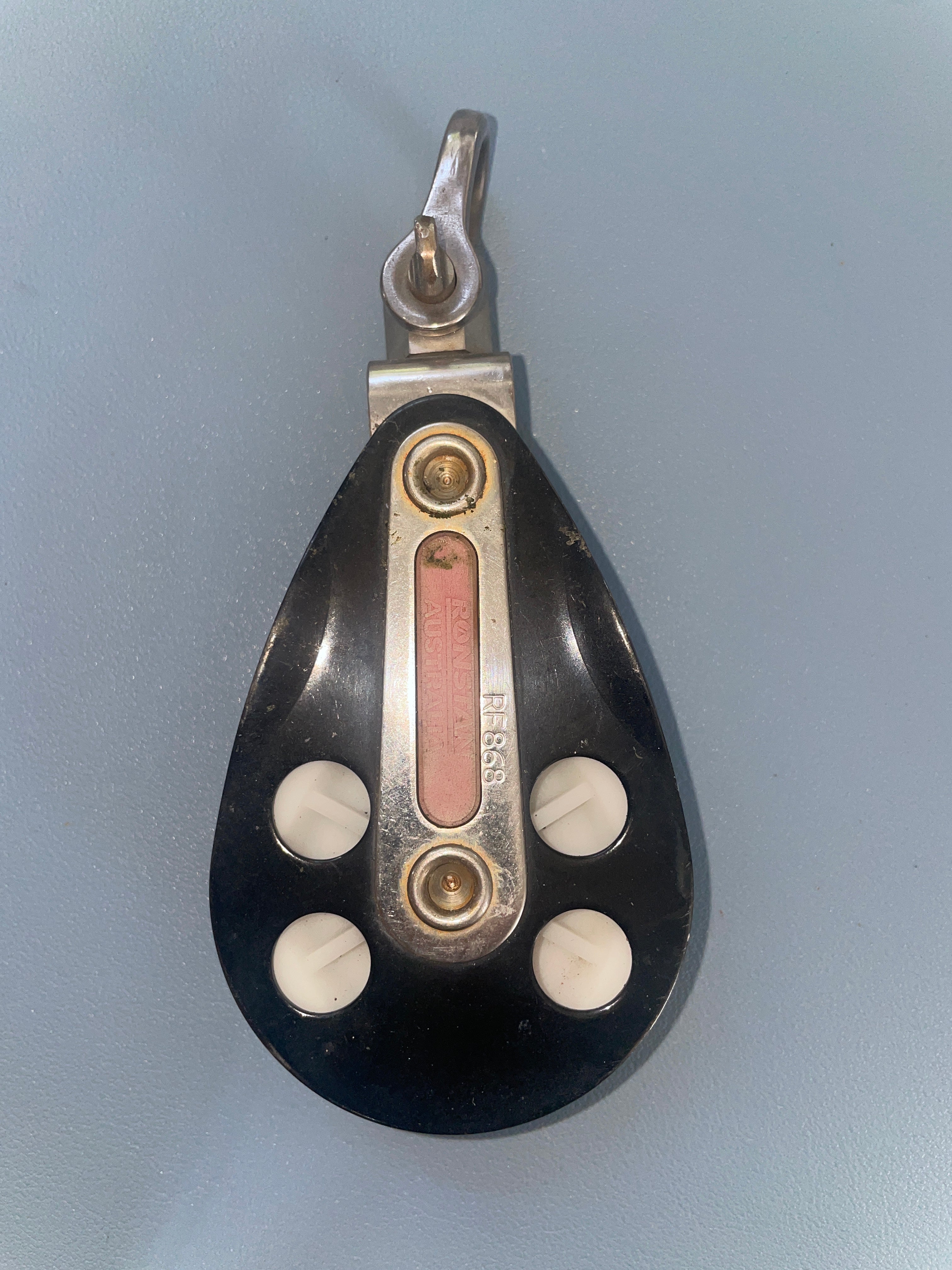This ronstan RF868 single swivel block is in great condition. The sheave is 2 3/8" diameter. Fits max 1/2" line diameter. The shackle has a 5/8" width. it is 5 1/2" total length.