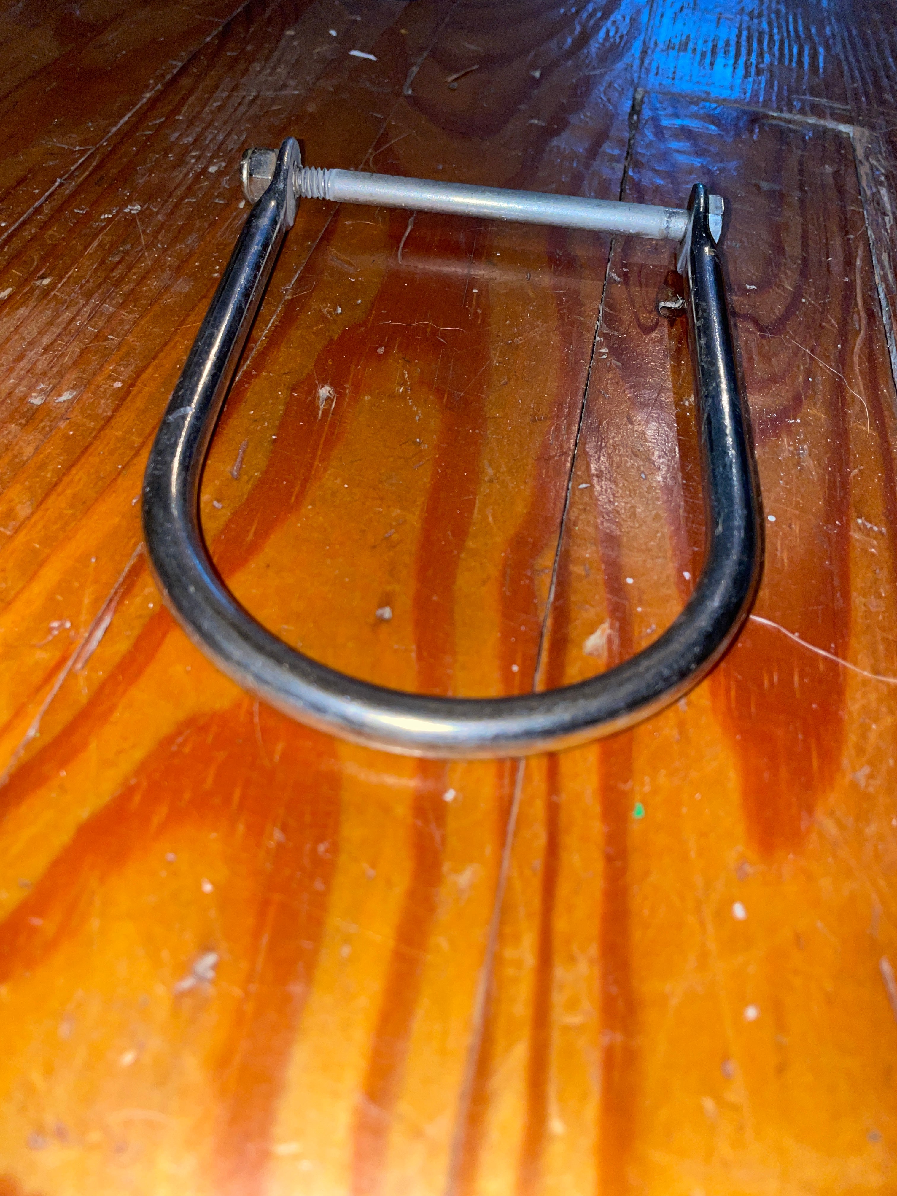 This rounded stainless steel boom bail is in great condition. The width is 2 1/2”. The through bolt is 1/4” diameter. 4 3/4" total length.