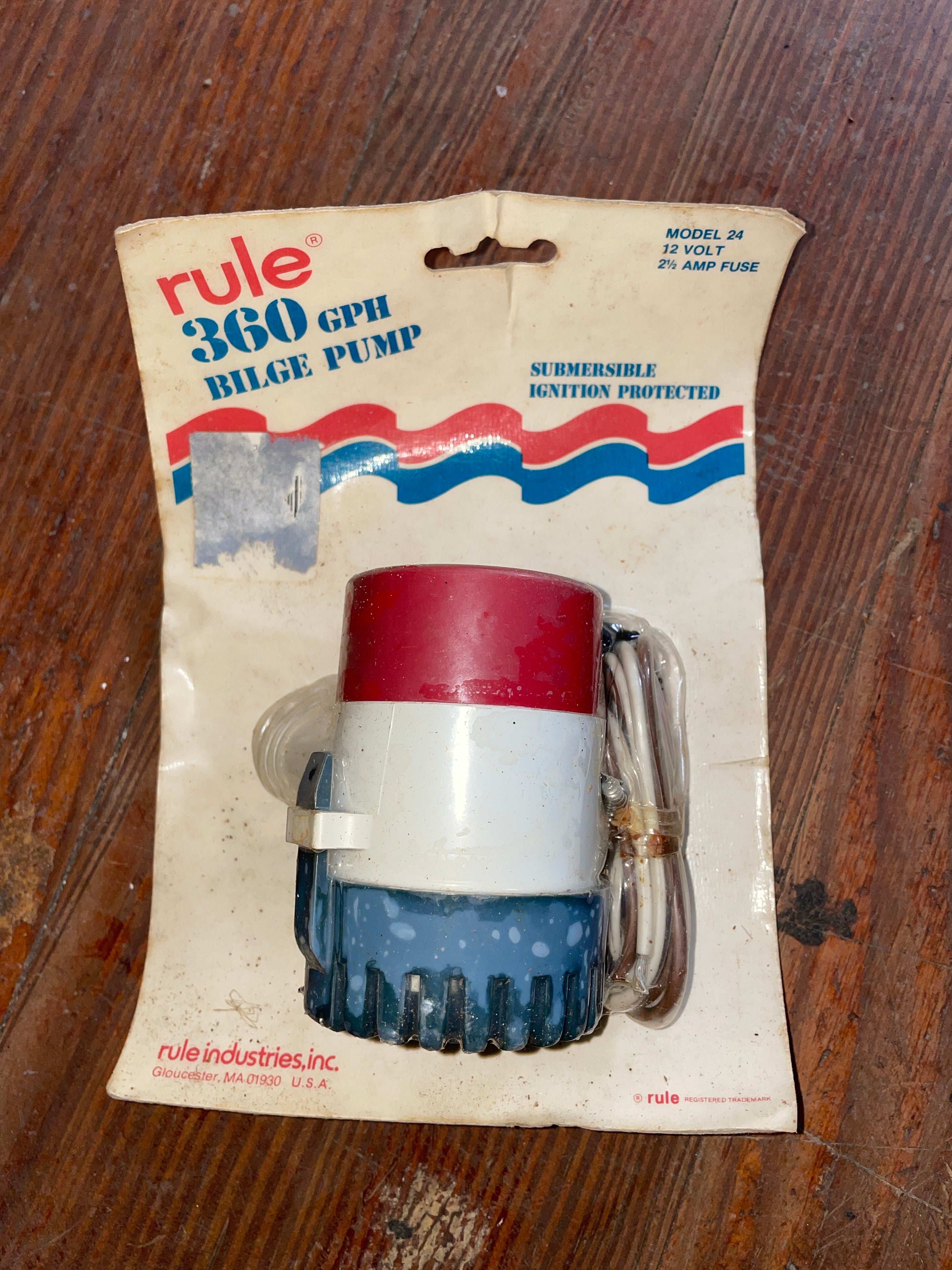 Brand new 24 volt rule 360 GPH bilge pump. Model 24. 12 volt. 2 1/2 amp fuse. 3 1/2” tall x 2 5/16” diameter to 1/4” deep.