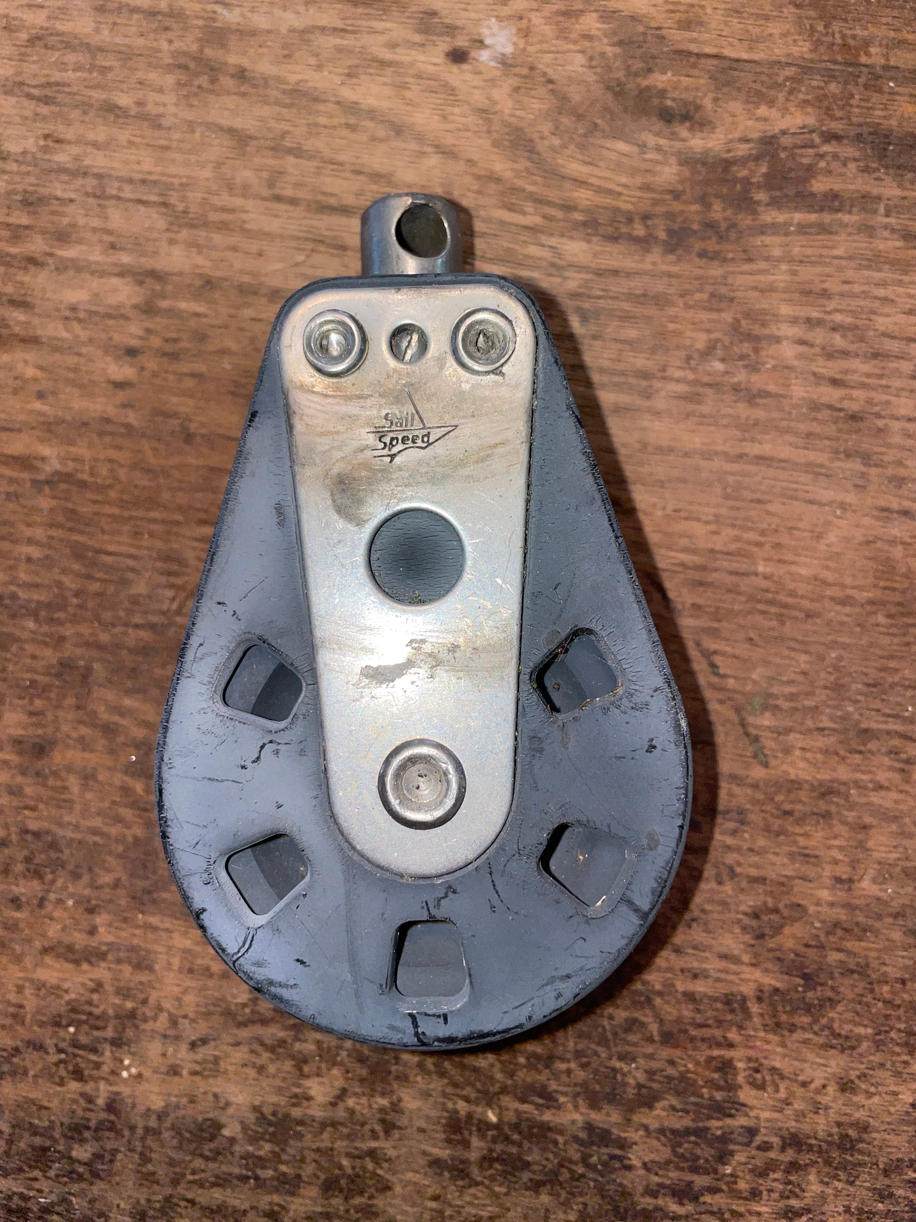 This sail speed single swivel block is in good condition. Has surface scratches from use. The sheave is 1 3/16” diameter and can fit up to 1/2” line. Total block length is 3 5/8”. The pin diameter to add shackle is 3/16”.