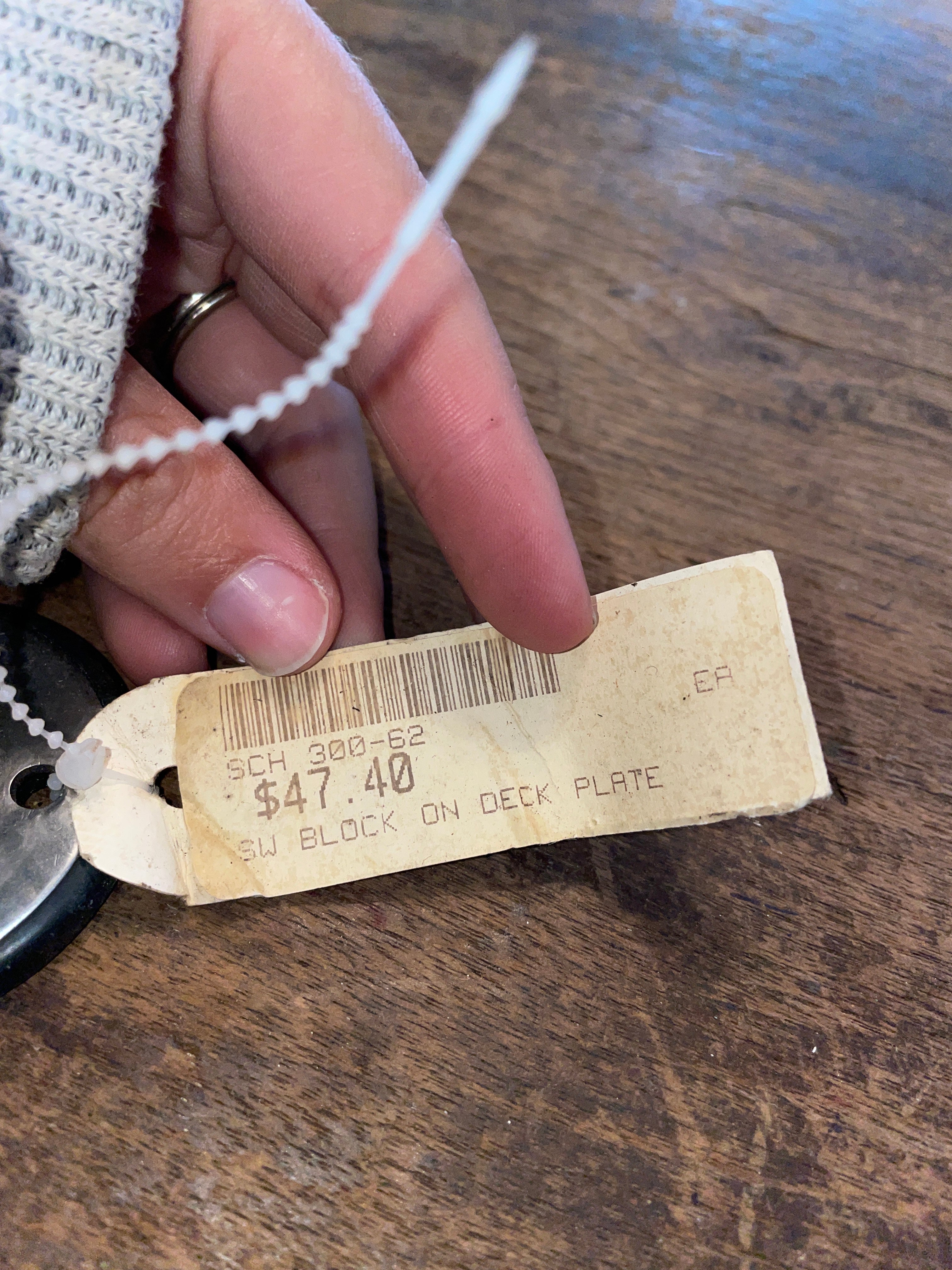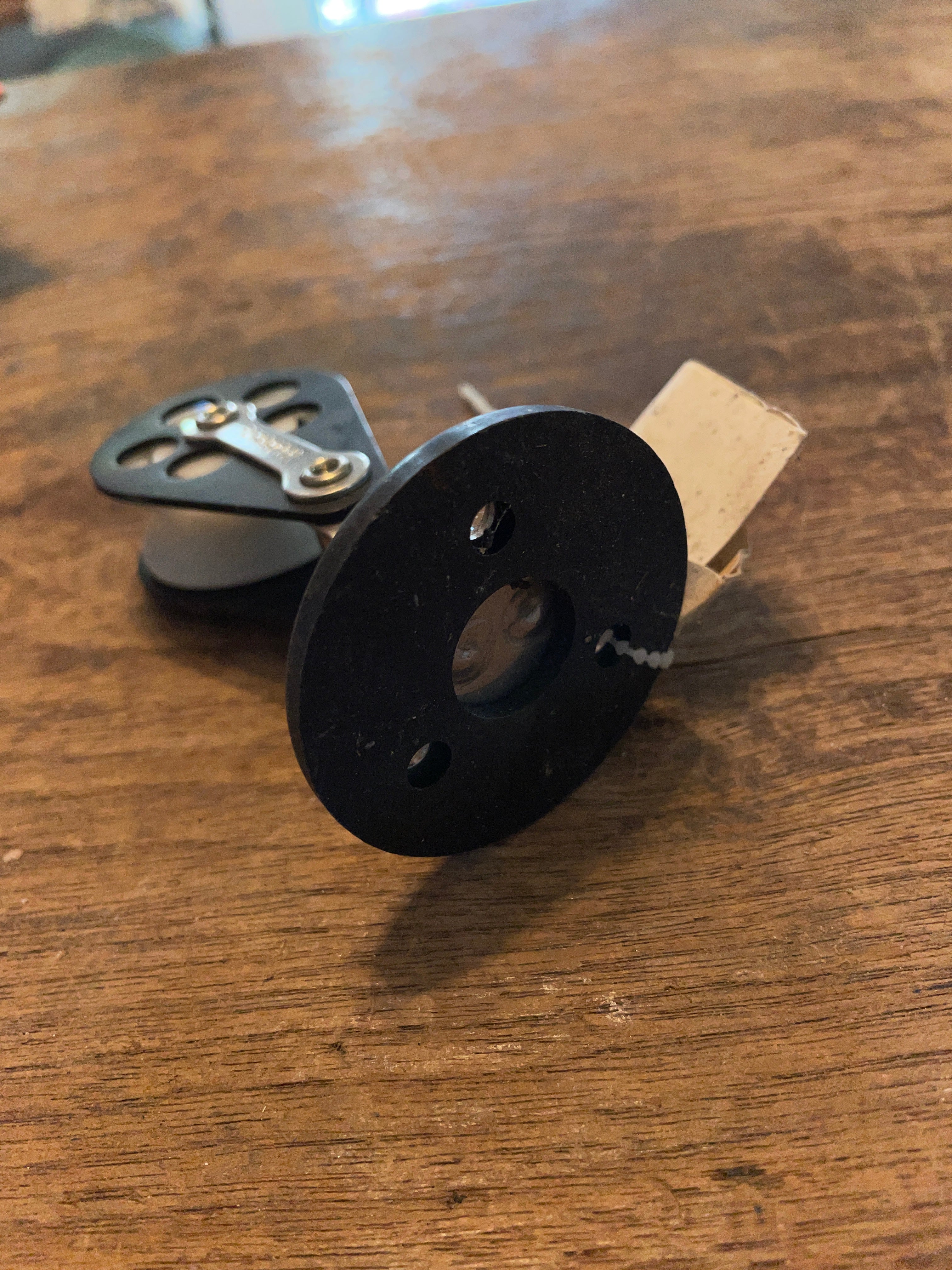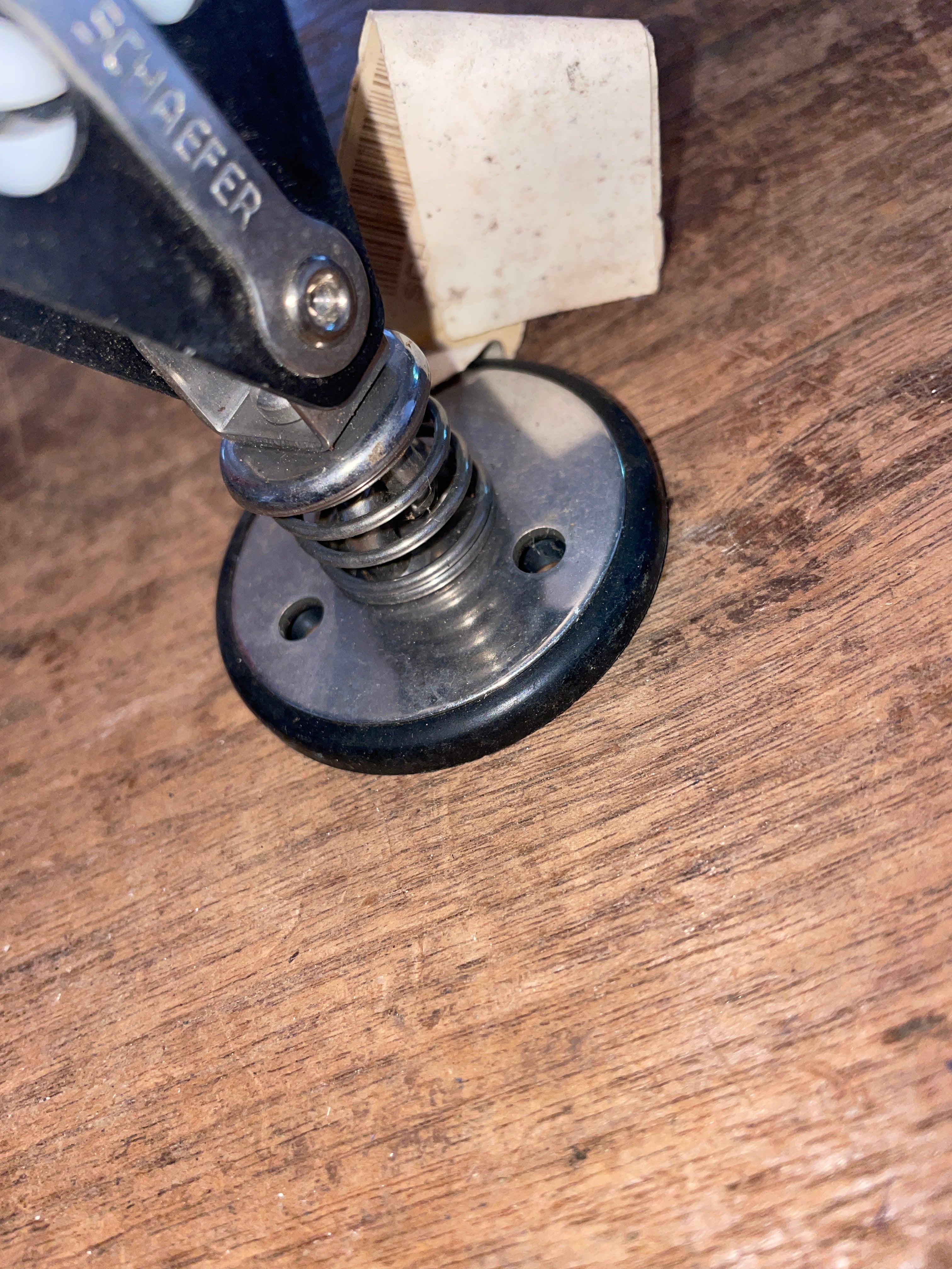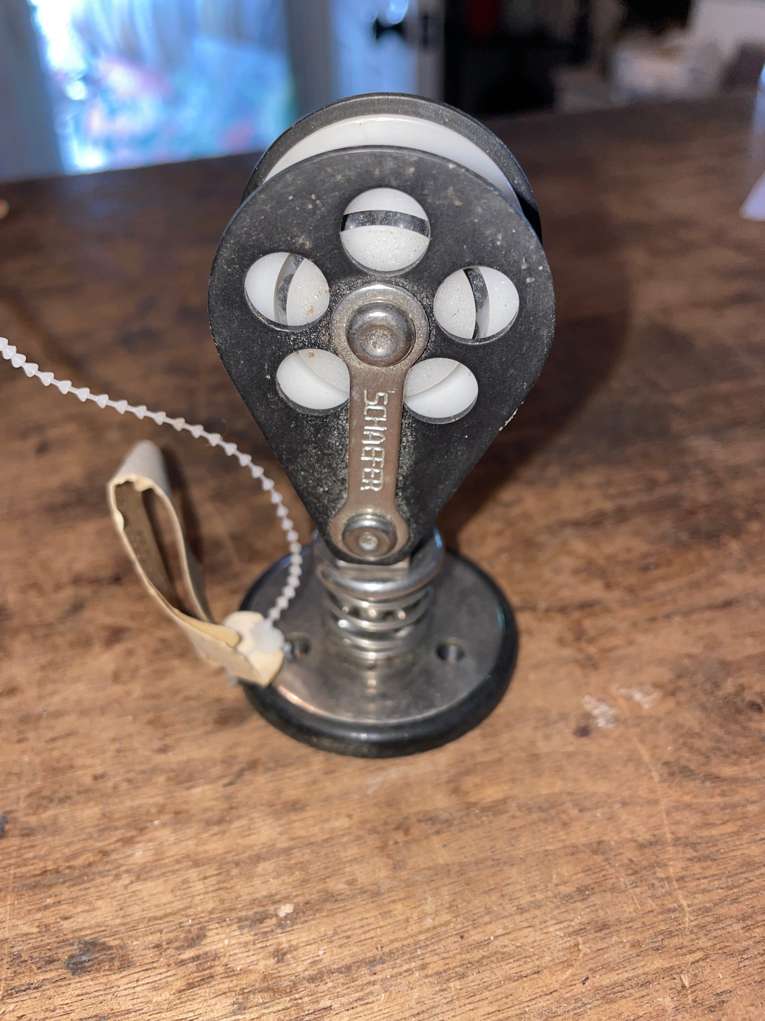 This brand new Schaefer block on deck plate has a 1 9/16” sheave and can fit 7/16” line diameter. This block stands 3 1/2” tall. Even though it is brand new the wheels don’t move as smoothly as they should, possibly dirt clogged in the sheaves. The base is 2” diameter with 3 bolt install, 1” apart.