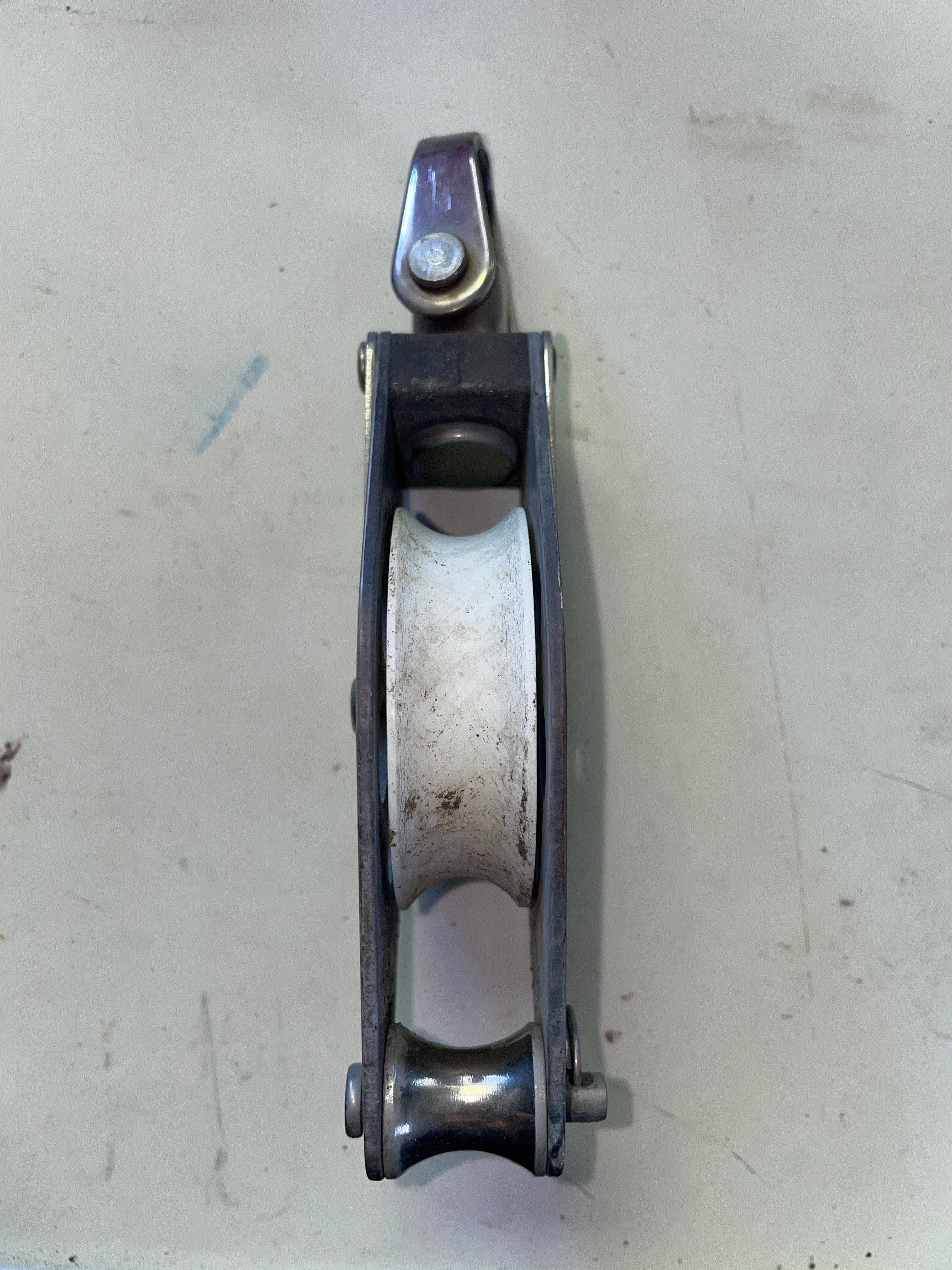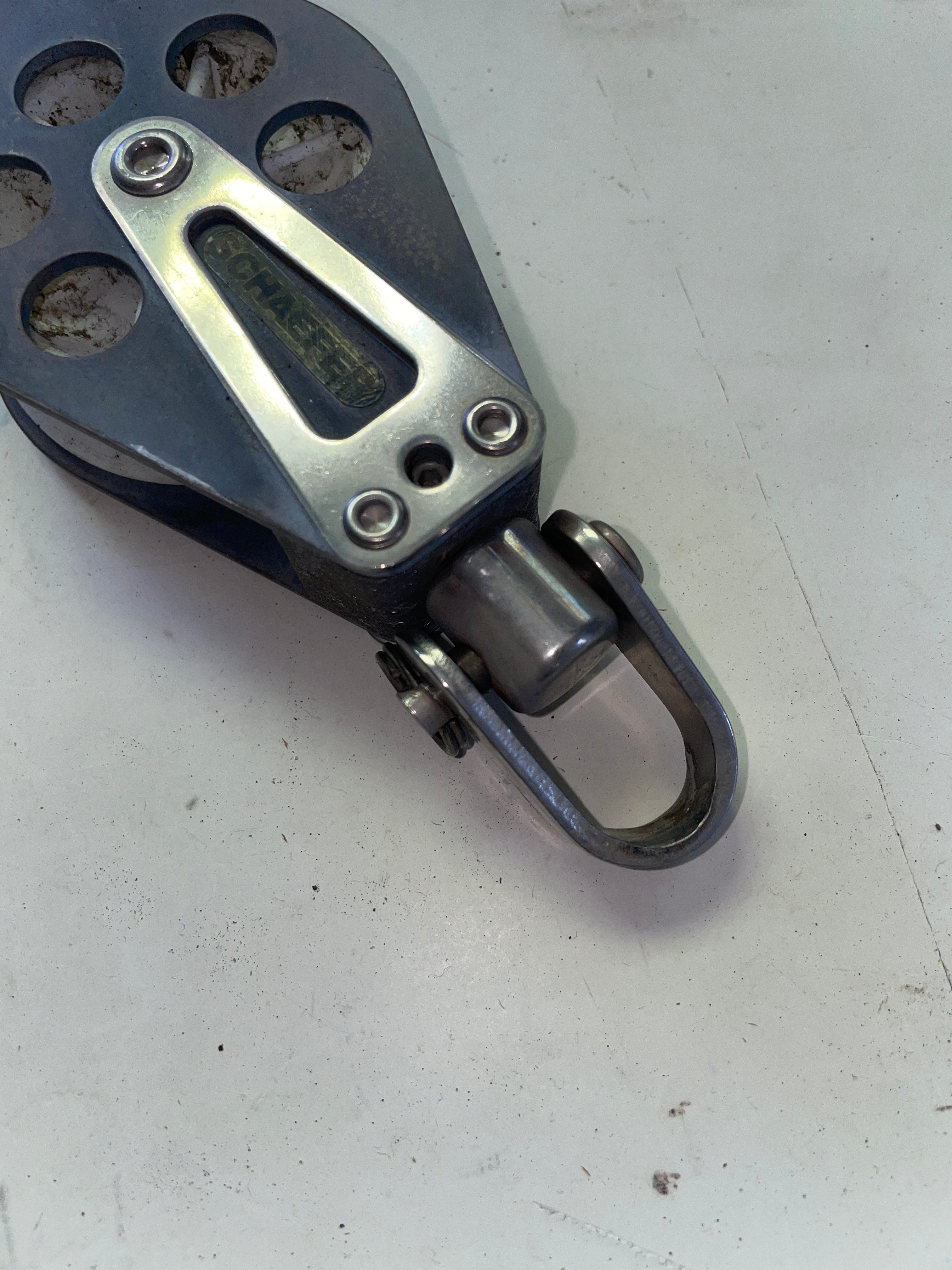 This Schaefer single block is in good condition (just very dirty). It has a 2 1/4” diameter sheave and fits MAX 9/16” diameter line. The shackle has a 5/8” diameter width. The total length of this block (top of shackle to bottom of Beckett) is 6 1/4” total length.