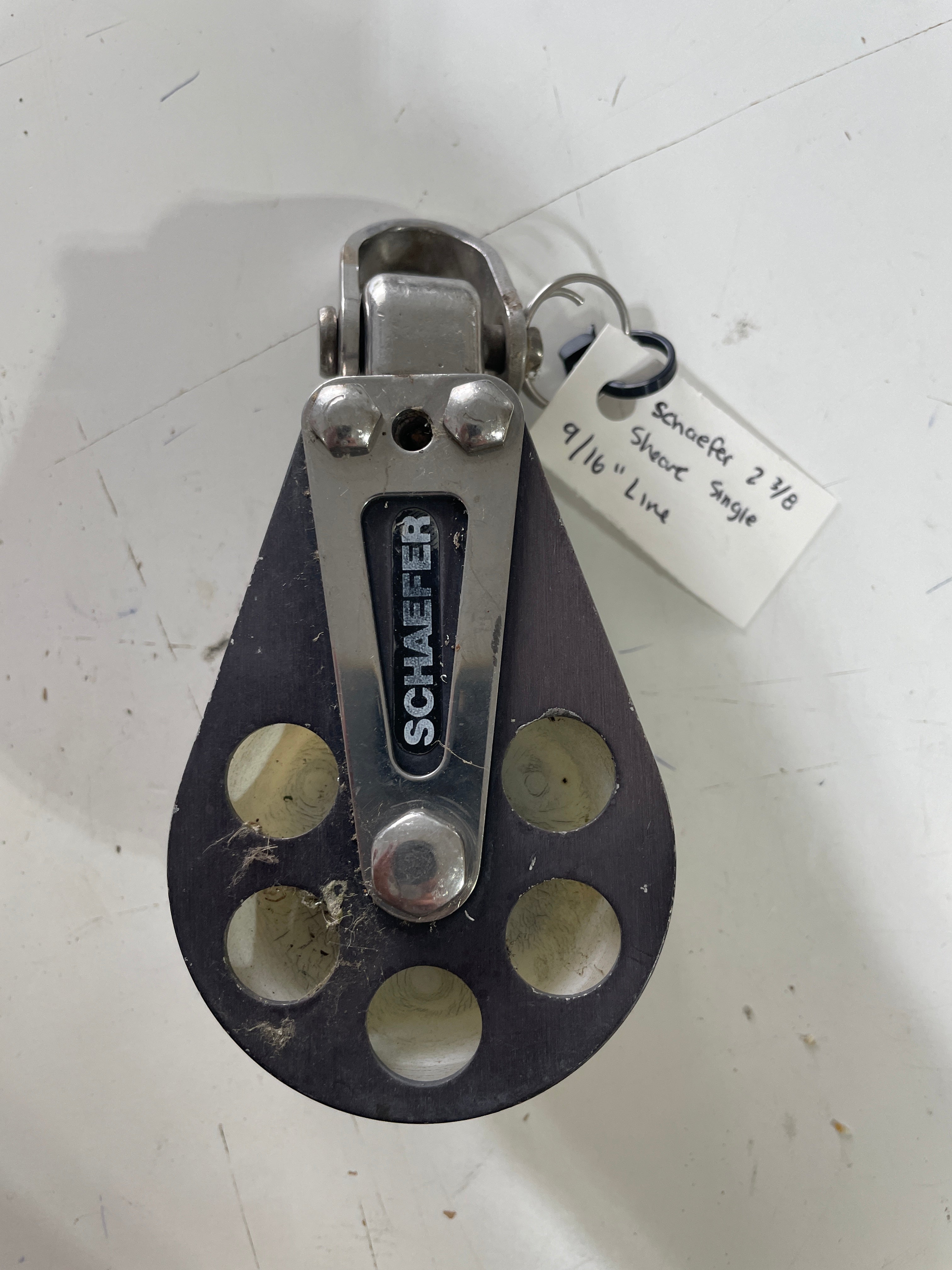 This Schaefer single swivel block with shackle is in good condition. The sheave is 2 3/8” and can fit up to 9/16” line diameter. The shackle width is 3/4” diameter. Total length of block including shackle is 5” long.