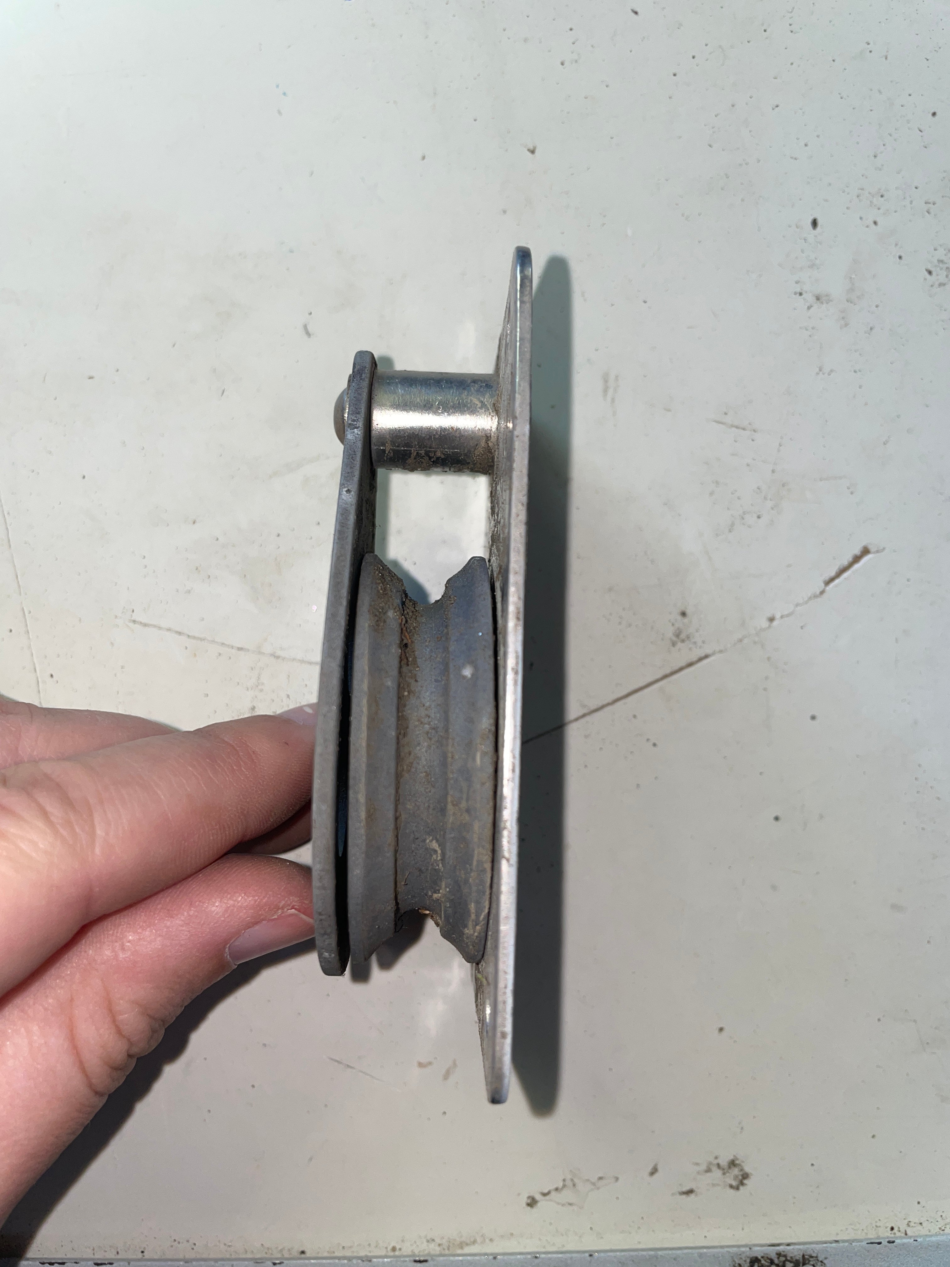 This schaefer wire halyard cheek block is in good condition. It has a 2” diameter sheave that fits MAX 3/16” wire diameter. The sheave is metal while the body is aluminum and the base is stainless steel. The base is trapezoid shaped measuring 3 5/8” long and is 2” shorter width and 2 1/4” widest width. Stands 1” tall when mounted. The aluminum appearance may vary because of sunfading.
