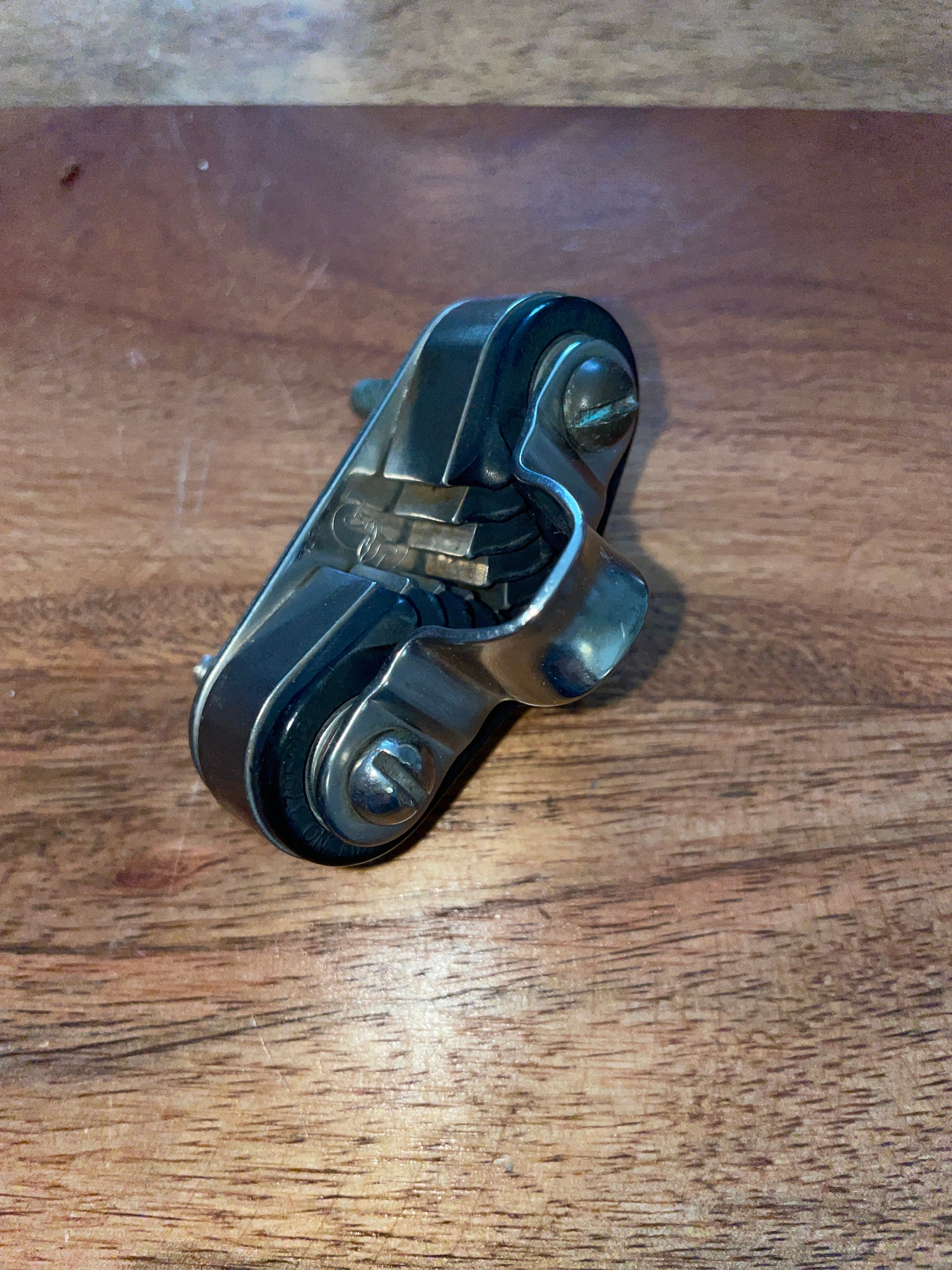 This Schaefer cam cleat is in great working condition fits 1/2” line diameter. Base is 2 3/4” long x 1 1/2” wide. 2 bolt mounting hat is 1 3/4” apart.