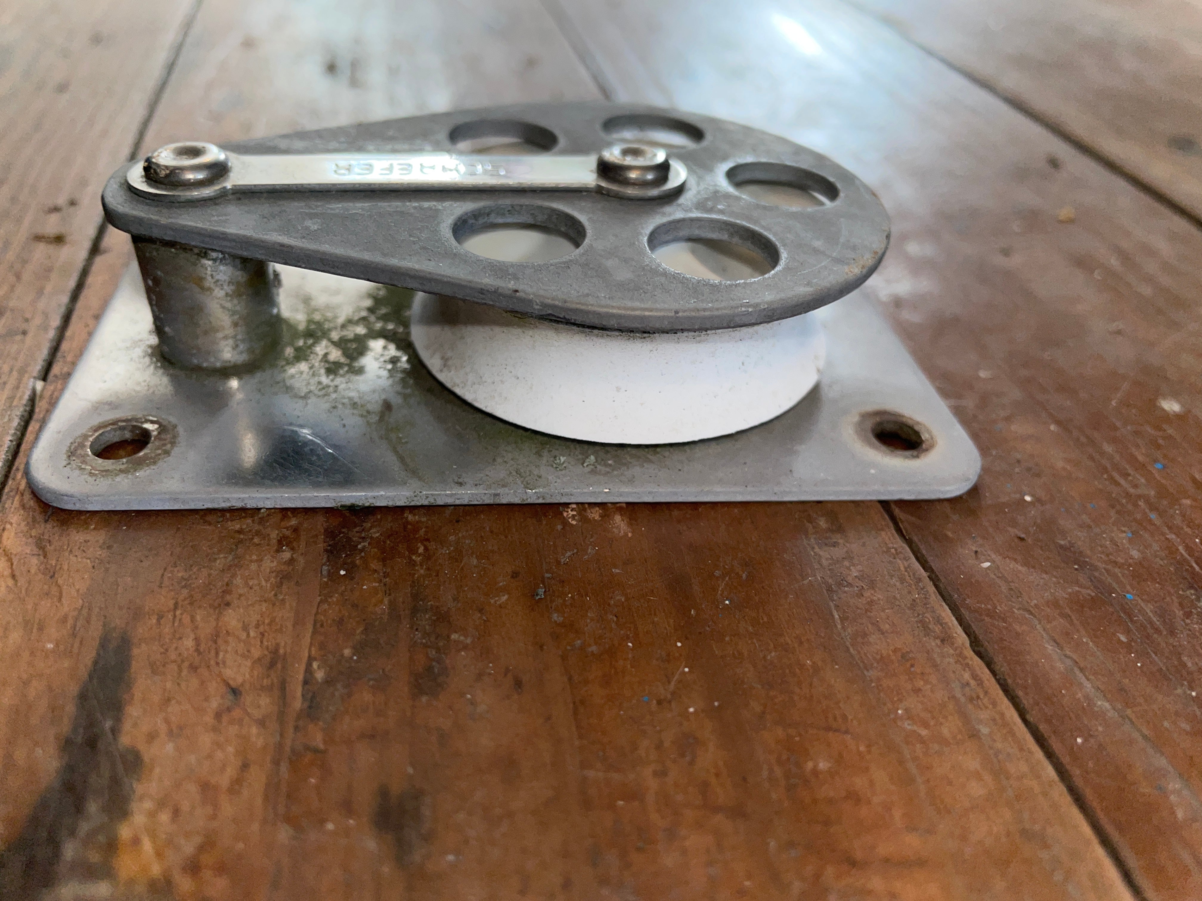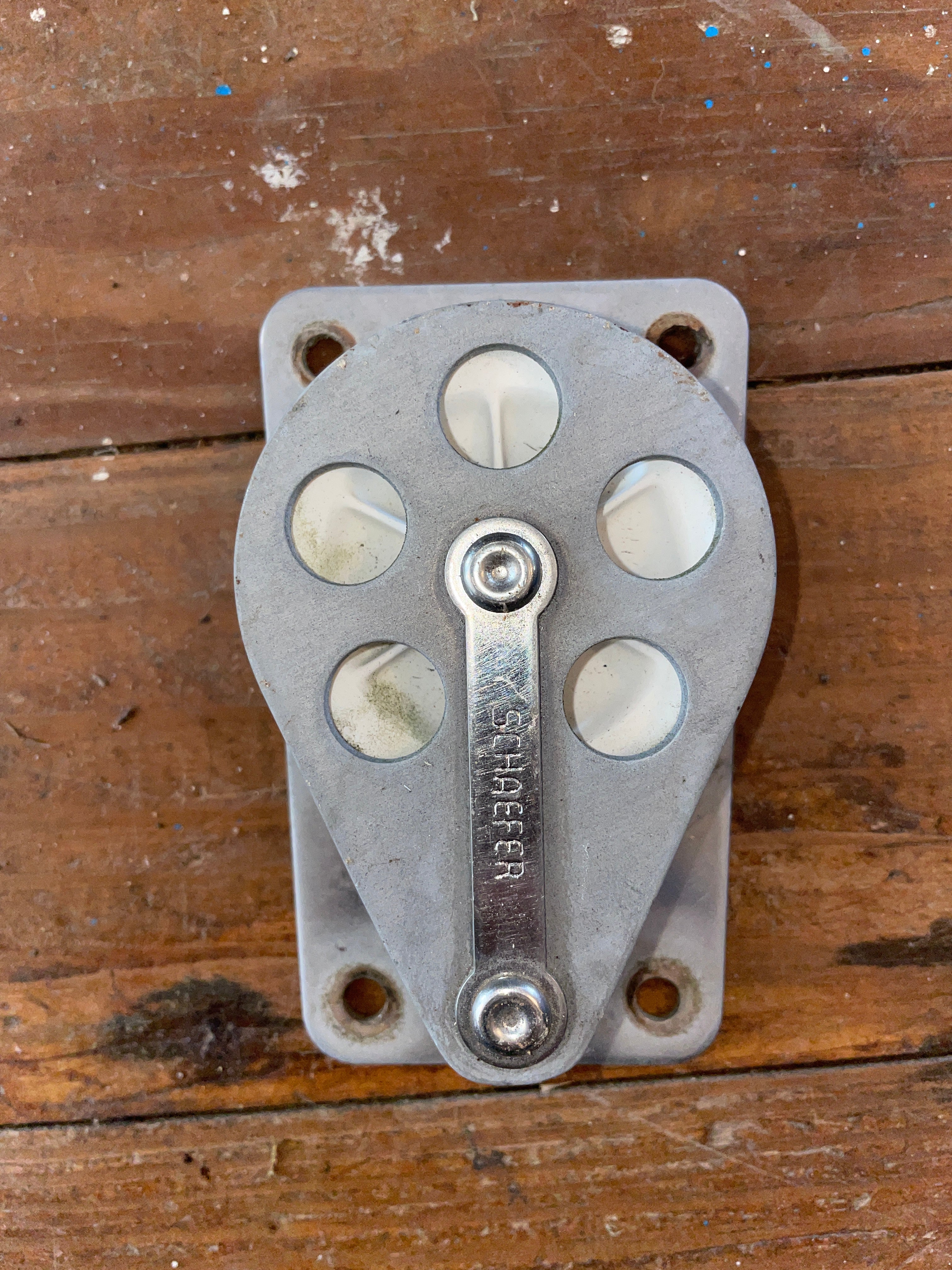 Good Condition Schaefer Cheek Block. Has A 2 1/8” Sheave And Can Fit Up To 3/8” Line. Wheel Is In fair condition, it does stick slightly.Tapered Base Is 3 5/8” Long. Widest Part Is 2 1/4”. Smallest Width Is 2”.