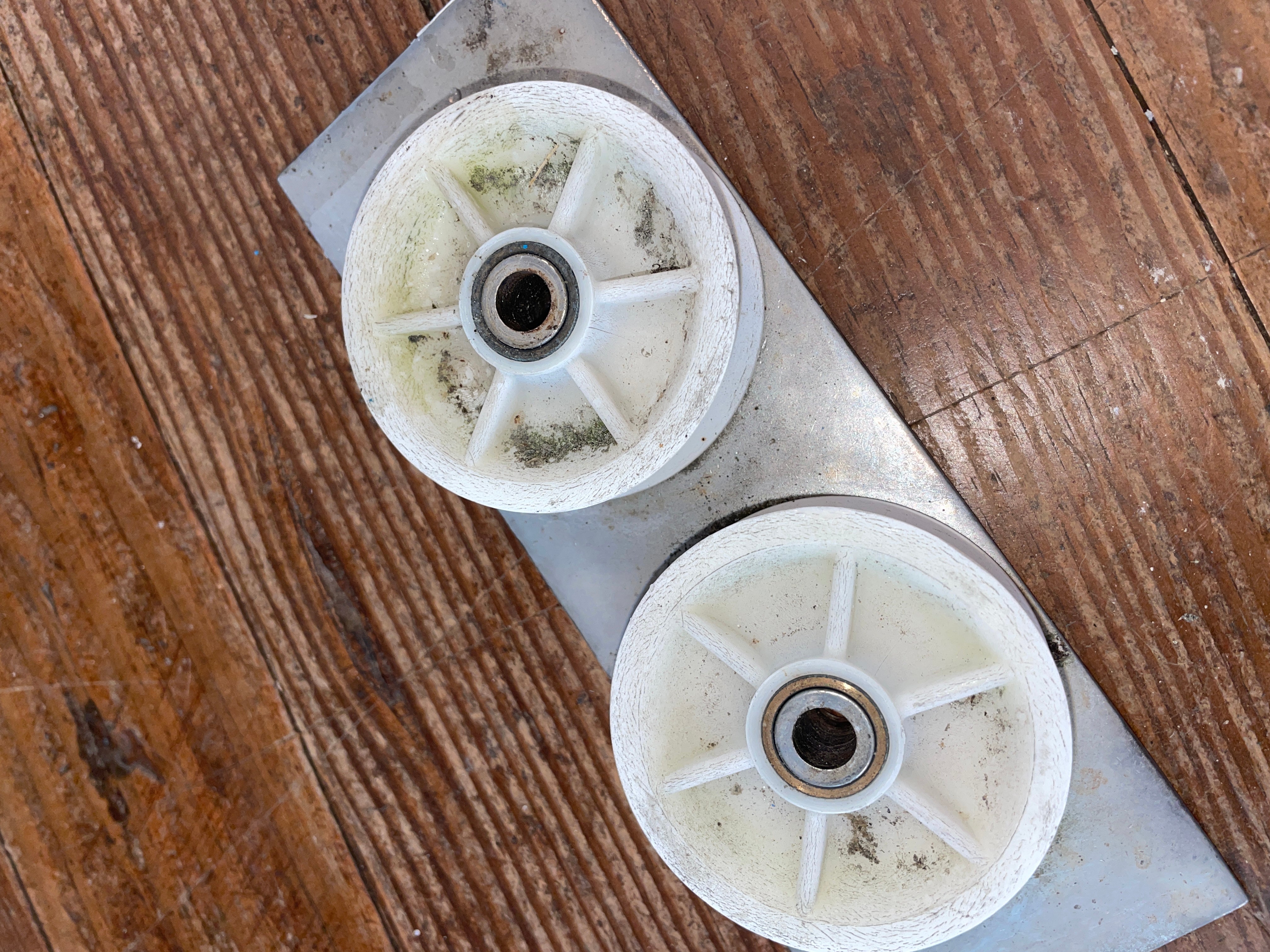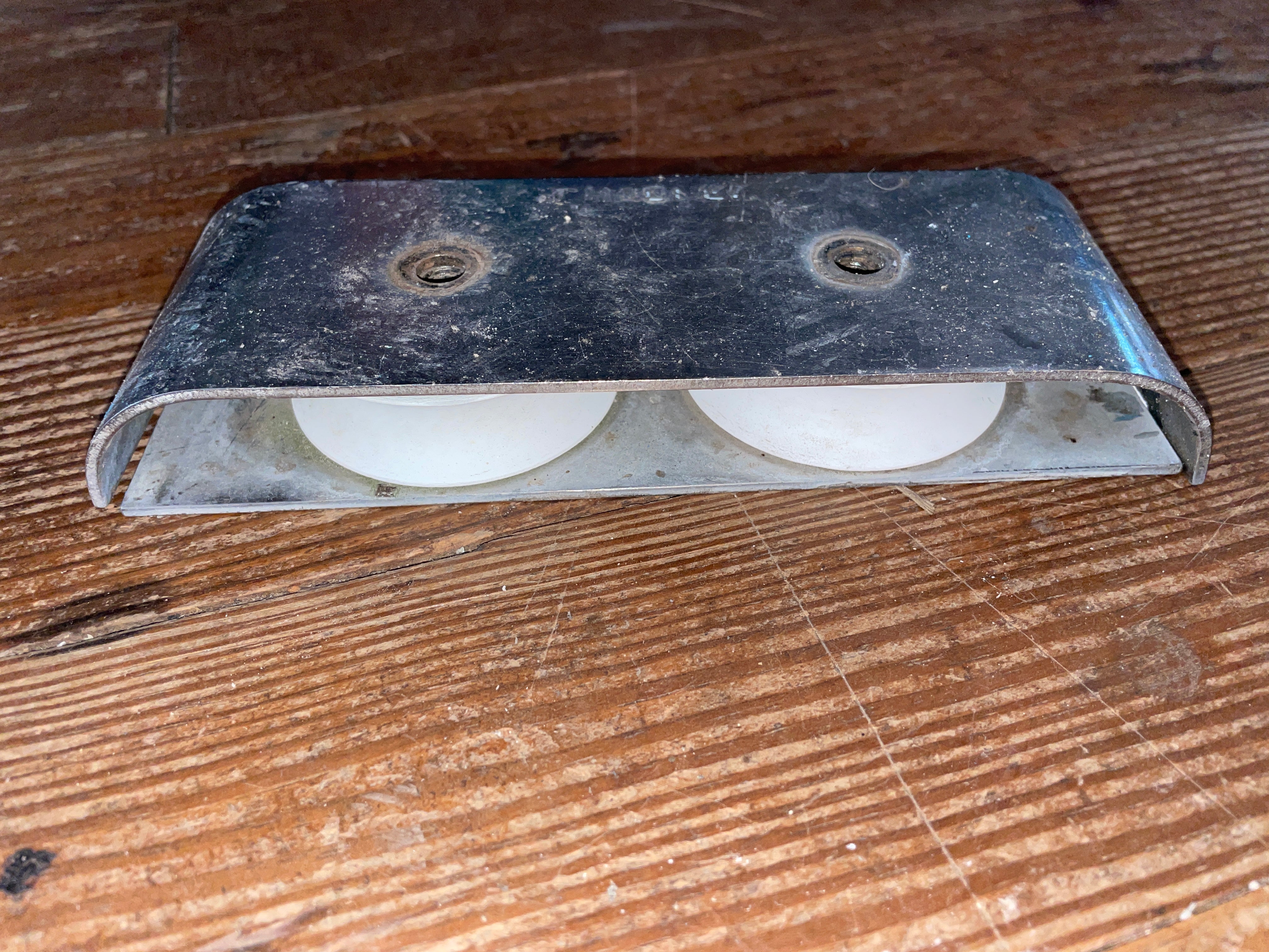 This stainless steel double deck organizer is in good condition. The sheave is 2 3/8” and fits 5/8” line. The wheels are in good condition. Measures 7 1/8” long x 2 1/2” wide x 1” tall. Will need new bolts.