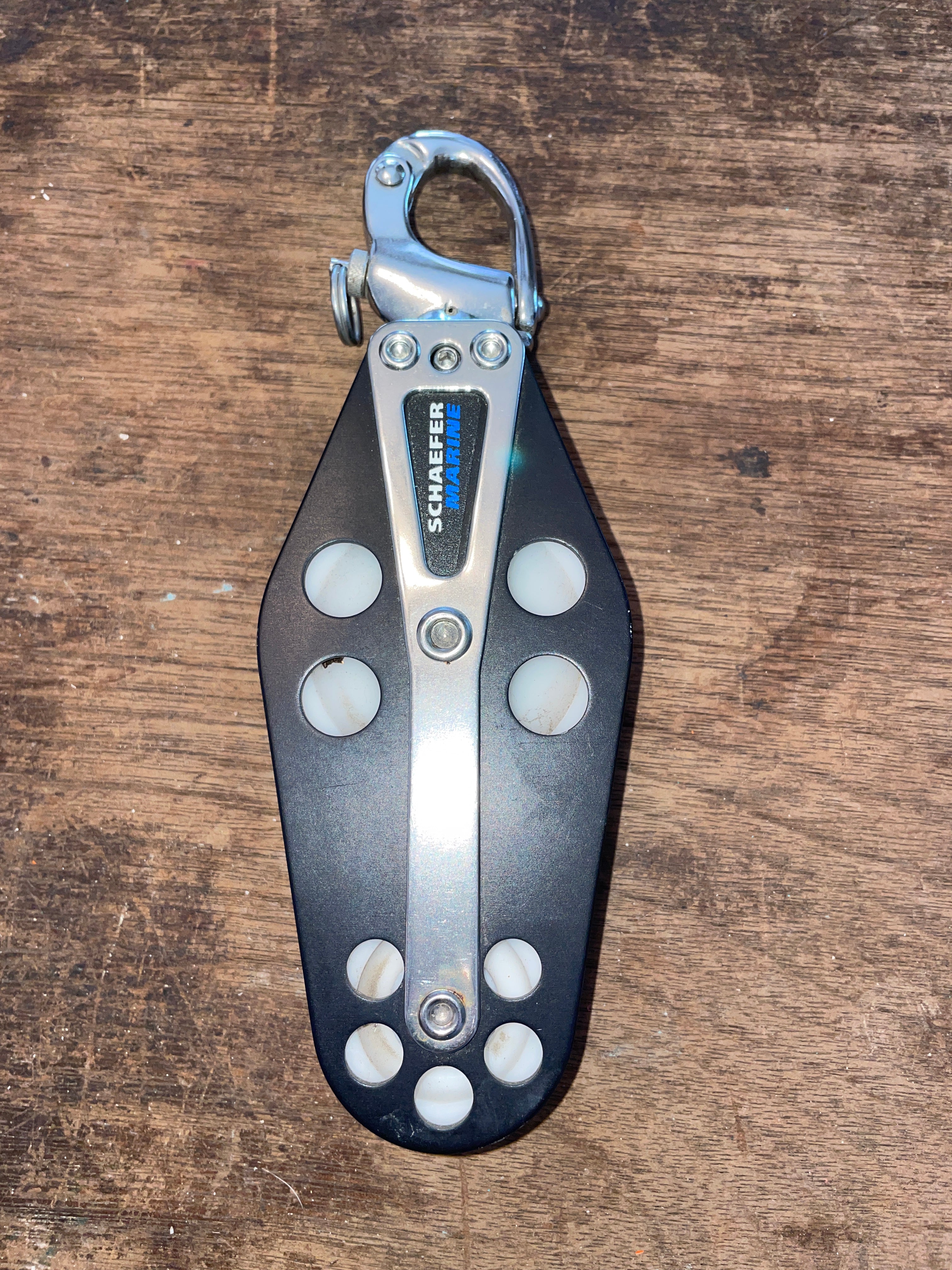 This newer style Schaefer fiddle block is in great like new condition. The sheaves 2 3/8” and 1 5/8” and can fit up to 7/16” line. Shackle works as should. Total length of the block is 6 7/8” long.